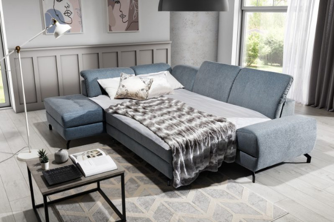 Ez a rendkívül stílusos, ágyfunkcióval, ágyneműtartóval és minden oldalon állítható fejtámlákkal rendelkező, Balatonkék, velúr hatású szövettel bevont sarokkanapé, nem csak szemet gyönyörködtető lehet a nappalidban, hanem praktikus is. Az ülőfelületen, hosszában fekhető. Az elegáns, magas króm lábak növelik a légiességet és a könnyedséget. A maximális kényelmet kiváló minőségű és kellemes tapintású kárpit biztosítja.