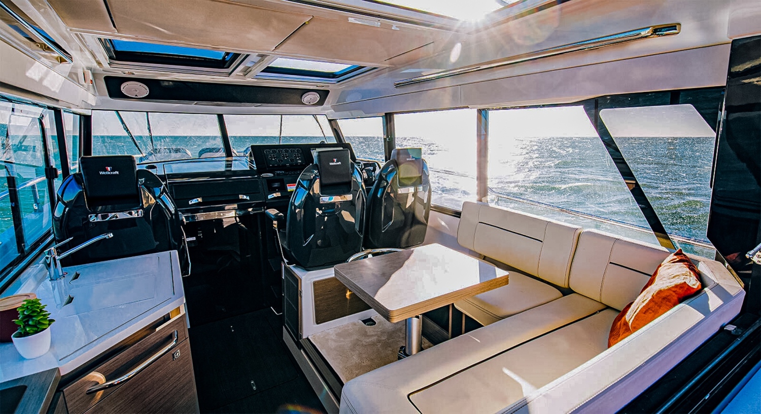 A közel 100 km/h utazósebességű Wellcraft hajók határozottan robusztusak. Hajótestüket az extrém folyami és tengeri élményekhez tervezték, ugyanakkor az átlagon felüli komfortra sem panaszkodhatsz. A hajó belseje is nagyon tágas, kormányállása öt személynek nyújt kényelmes ülőhelyet. A kormányállás ajtaja háborítatlan a kommunikációt biztosít az első és a hátsó pilótafülke között.