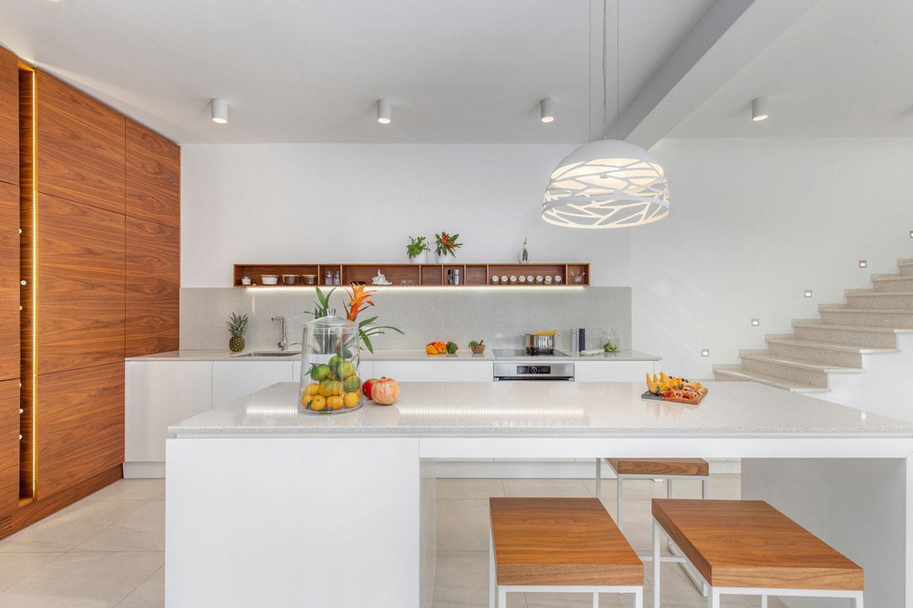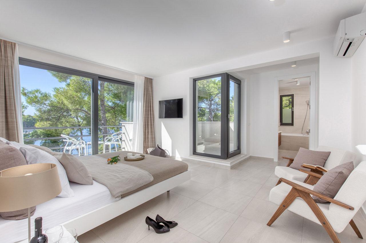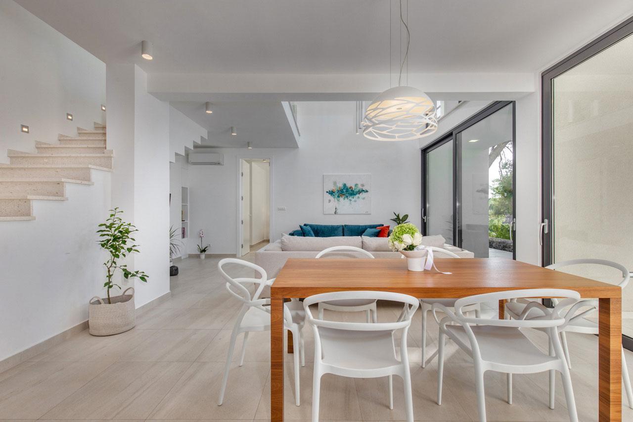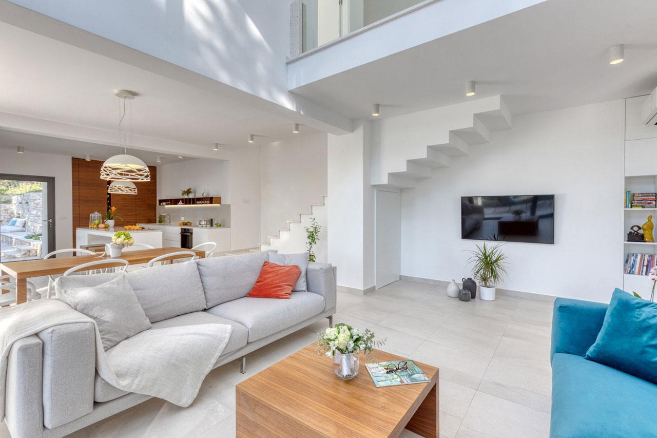 Az elegáns belső kialakítás harmonikus lakókörnyezetet biztosít a legmagasabb igényekhez is. Ez az ingatlan a legjobbat kínálja fekvés, kilátás, építés és technológia tekintetében. A villa belseje elegáns, minimalista kialakítású és funkcionális, ugyanakkor az igazi otthon melegét árasztja. A koncepció a kiváló fizikai környezet és a fokozott érzékeny élmény ötvözése. A mennyezetig a magas üvegfalak minden helyiséget elárasztanak fénnyel, és csúszó átmenetet teremtenek a belső és a külső között. A lakótér két szinten terül el. A földszinten nyitott terű nappali-étkező található nyitott konyhával, valamint egy hálószoba saját fürdőszobával. Az emeleten két hálószoba található saját fürdőszobával és tengerre néző saját terasszal.