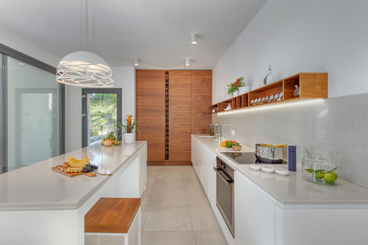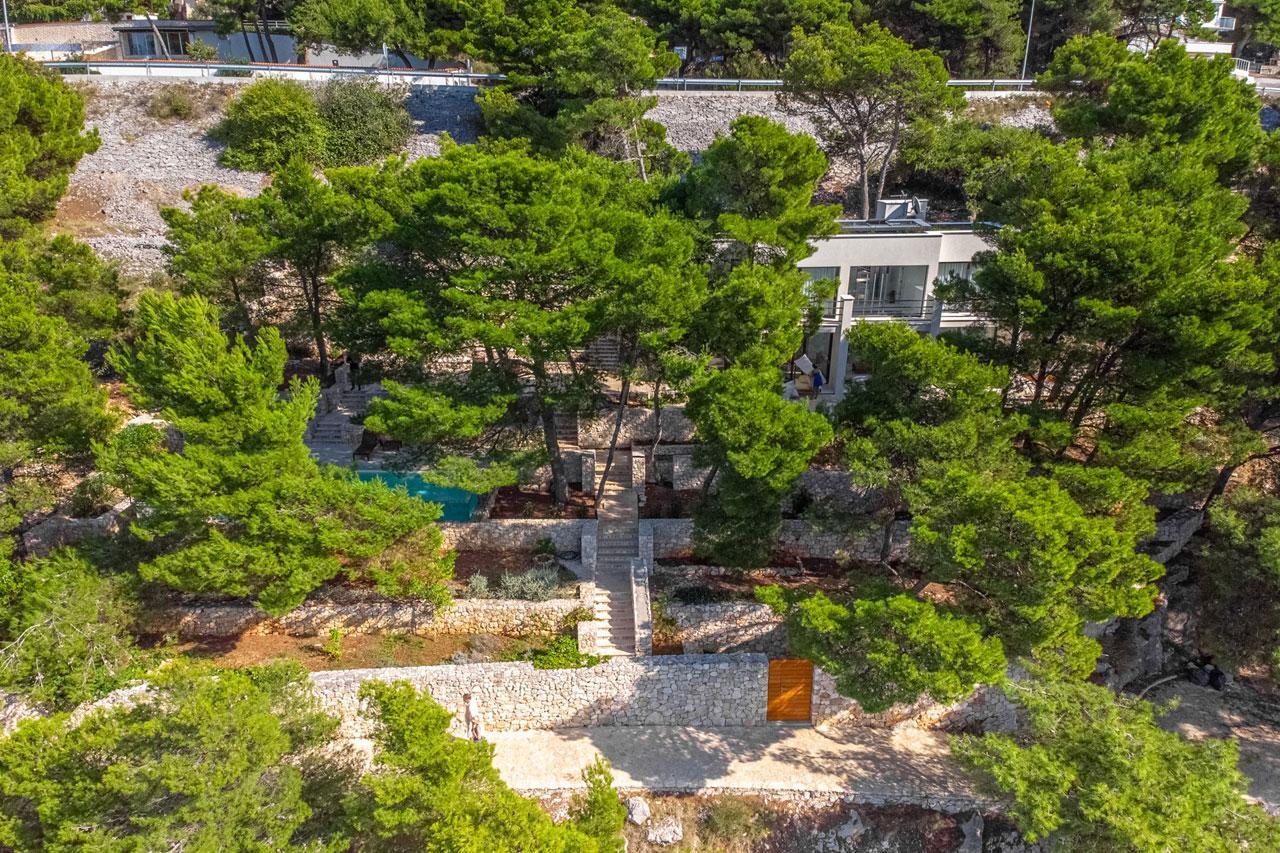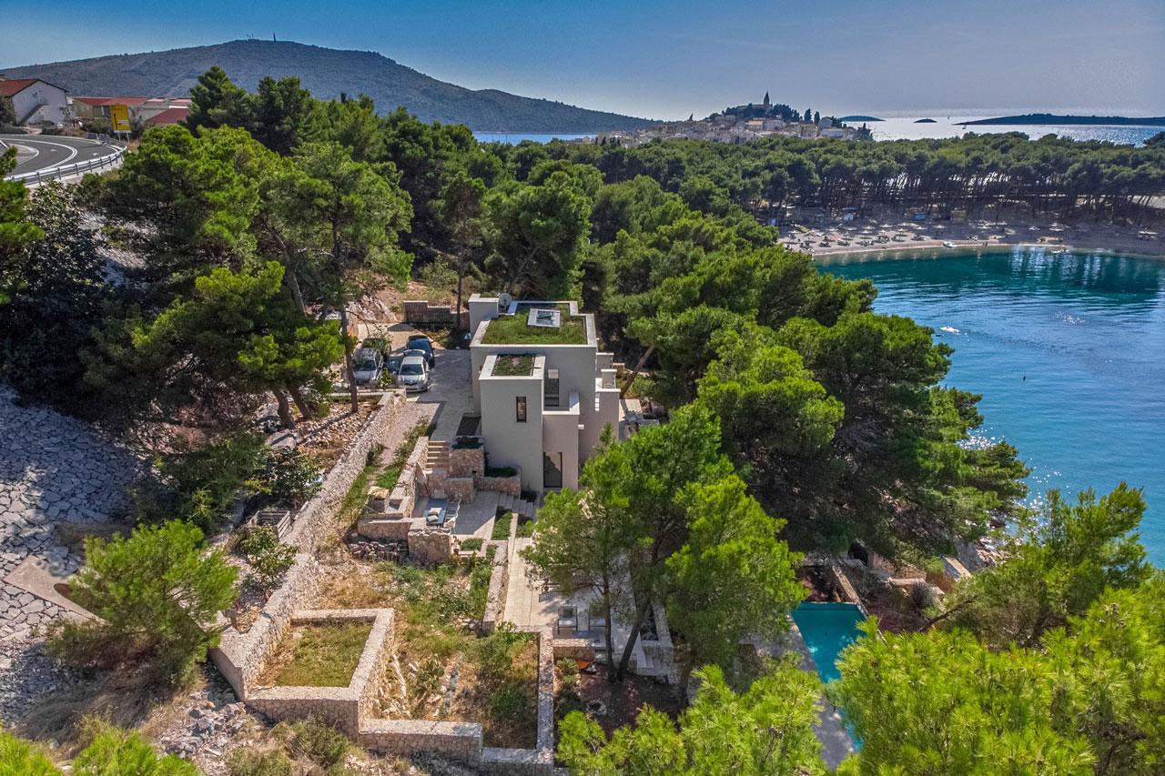 Primostenben, exkluzív helyen található ez a 2019-ben elkészült modern villa a tenger mellett, felejthetetlen kilátással az előtte húzódó öbölre, egyedülálló lakhatási kényelmet és teljes magánéletet garantál egy látványos, 1450 m2-es, mediterránnal teli lépcsőzetes telken. fenyőerdőkkel körülvéve, mindössze 20 méterre az azúrkék tengertől. A mediterrán környezet, melyet a gazdag lombkoronák kereteznek, modern építészettel és elegáns belső kialakítással kombinálva egészen különleges hangulatot teremt. Primosten a dalmát tengerpart egyik legexkluzívabb és legbékésebb területe, amely még mindig megőrzi jellegzetes klasszikus dalmát jellegét, szépségét és békéjét a Földközi-tenger partján. Kétségtelenül az egyik legjobb ajánlatot kínáljuk fekvést, tájolást és tengerközeliséget tekintve, amely jelenleg ebben az exkluzív enklávéban elérhető. A villa minden kényelmi szolgáltatáshoz közel van, mégis békét és magánéletet kínál. A part mentén sétány található, és egy rövid sétával elérheti a festői óvárost, ahol sok finom gasztronómiai ajánlat található.