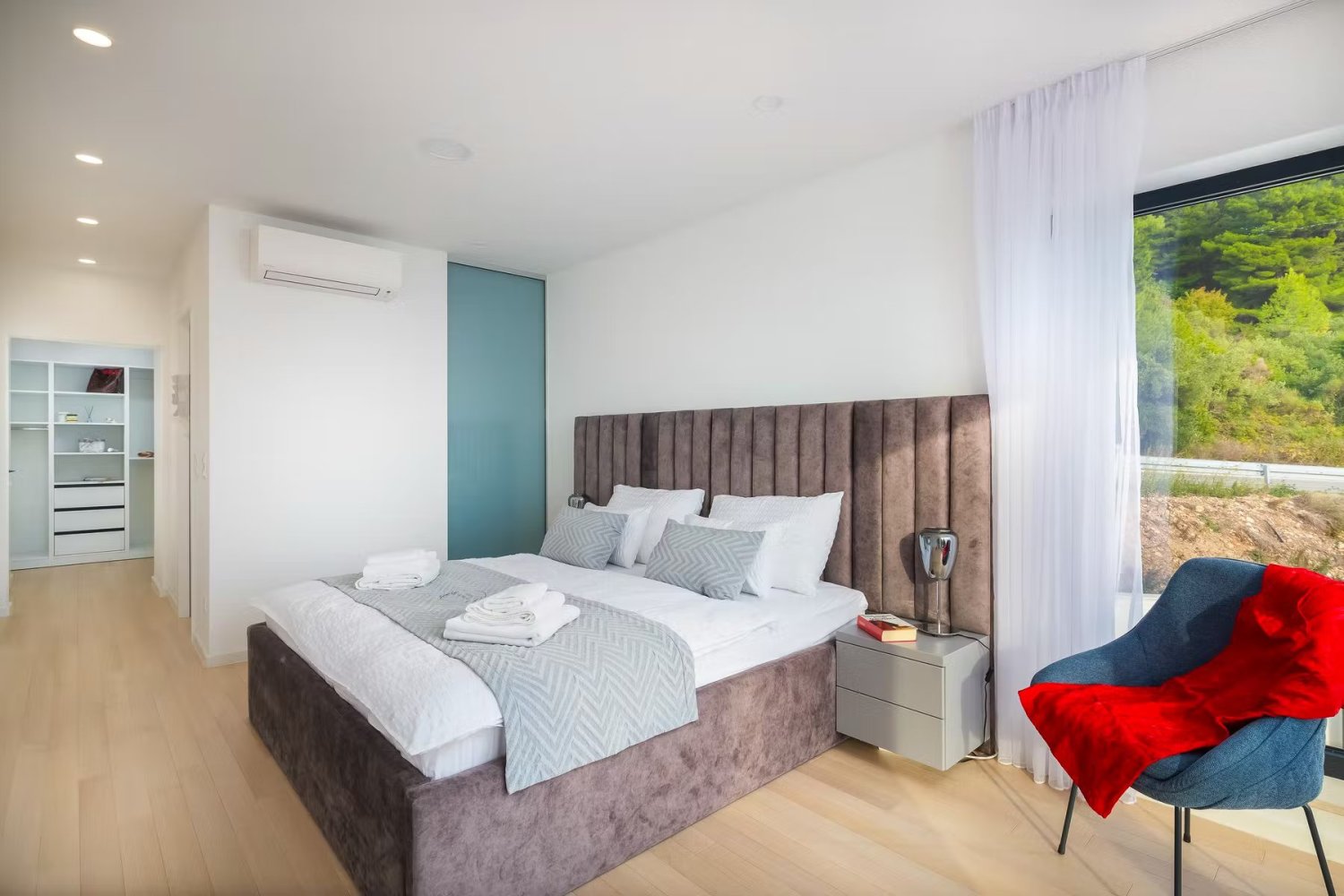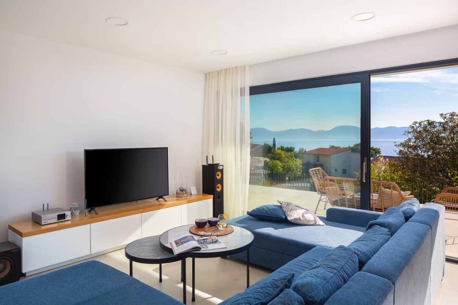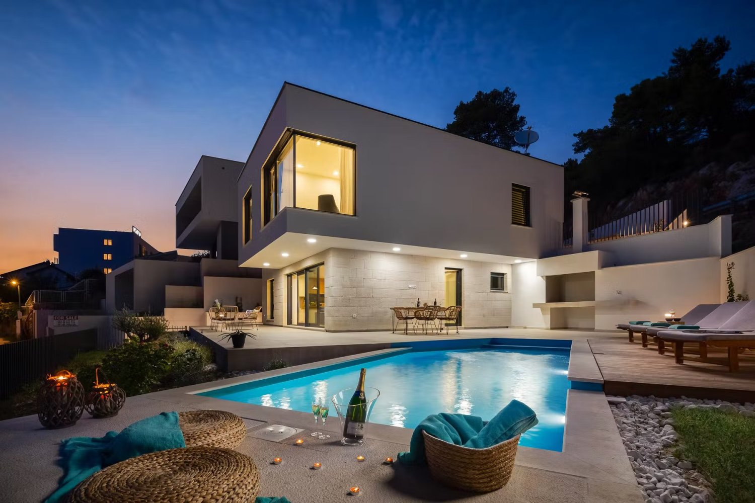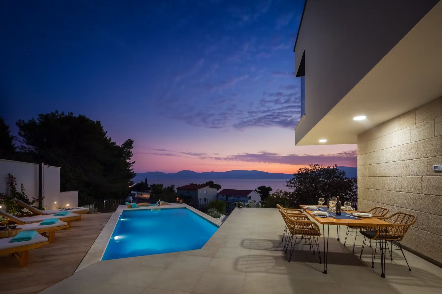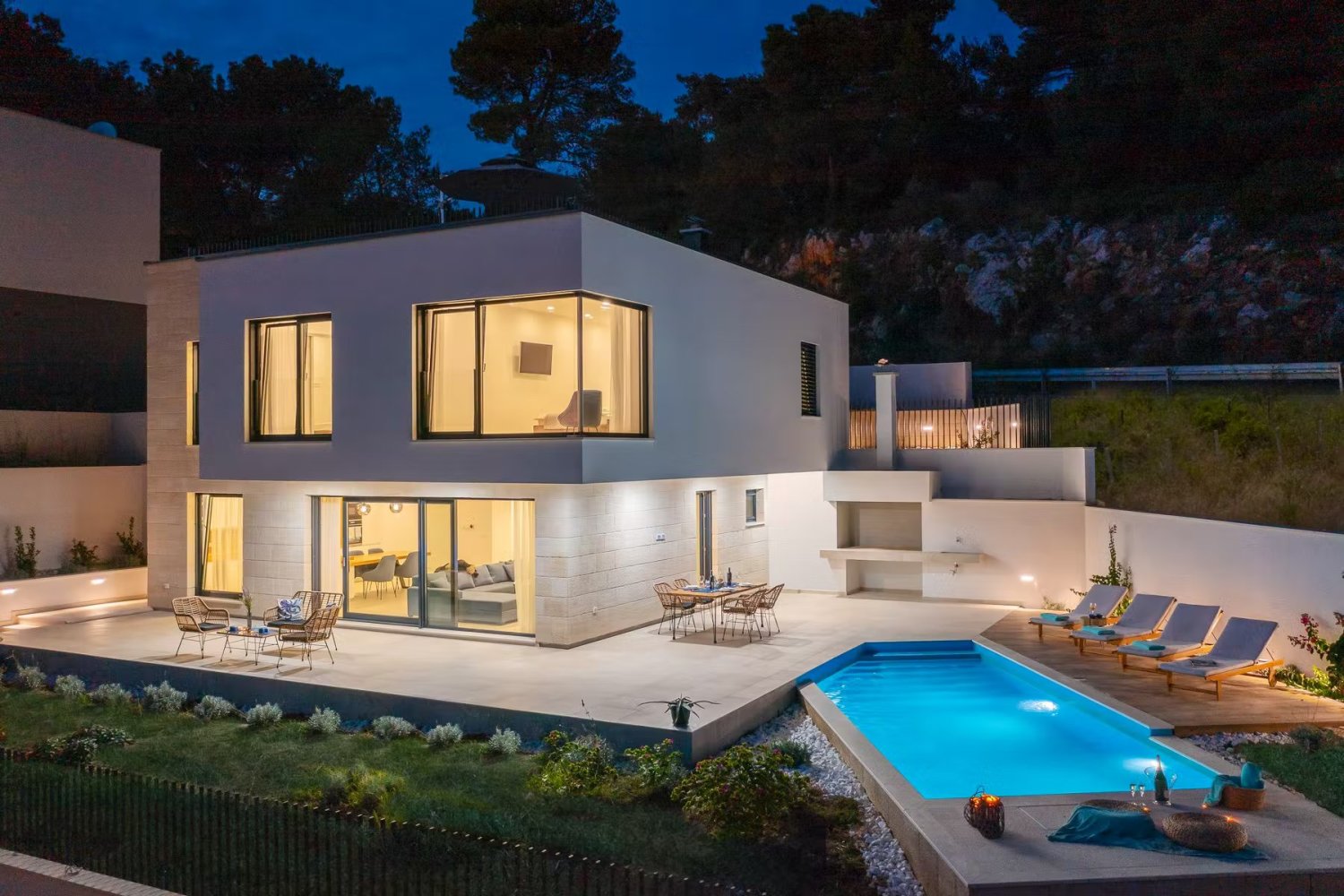 A nagy üvegfelületek vizuálisan megnyitják a belső teret, lehetővé téve a kültéri területekkel és a festői mediterrán természettel való állandó érintkezést. A villa a legtöbb nap napfényben fürdik, és egy tipikus dalmát életmódot tükröz, és páratlan kilátást nyújt az érintetlen Adriára.A gyönyörűen szervezett szabadtéri terület rengeteg pihenőhelyet kínál tágas teraszokon, amelyek többek között egy modern úszómedencéből
