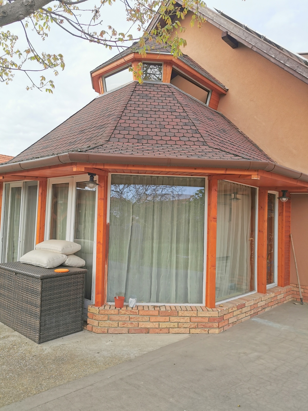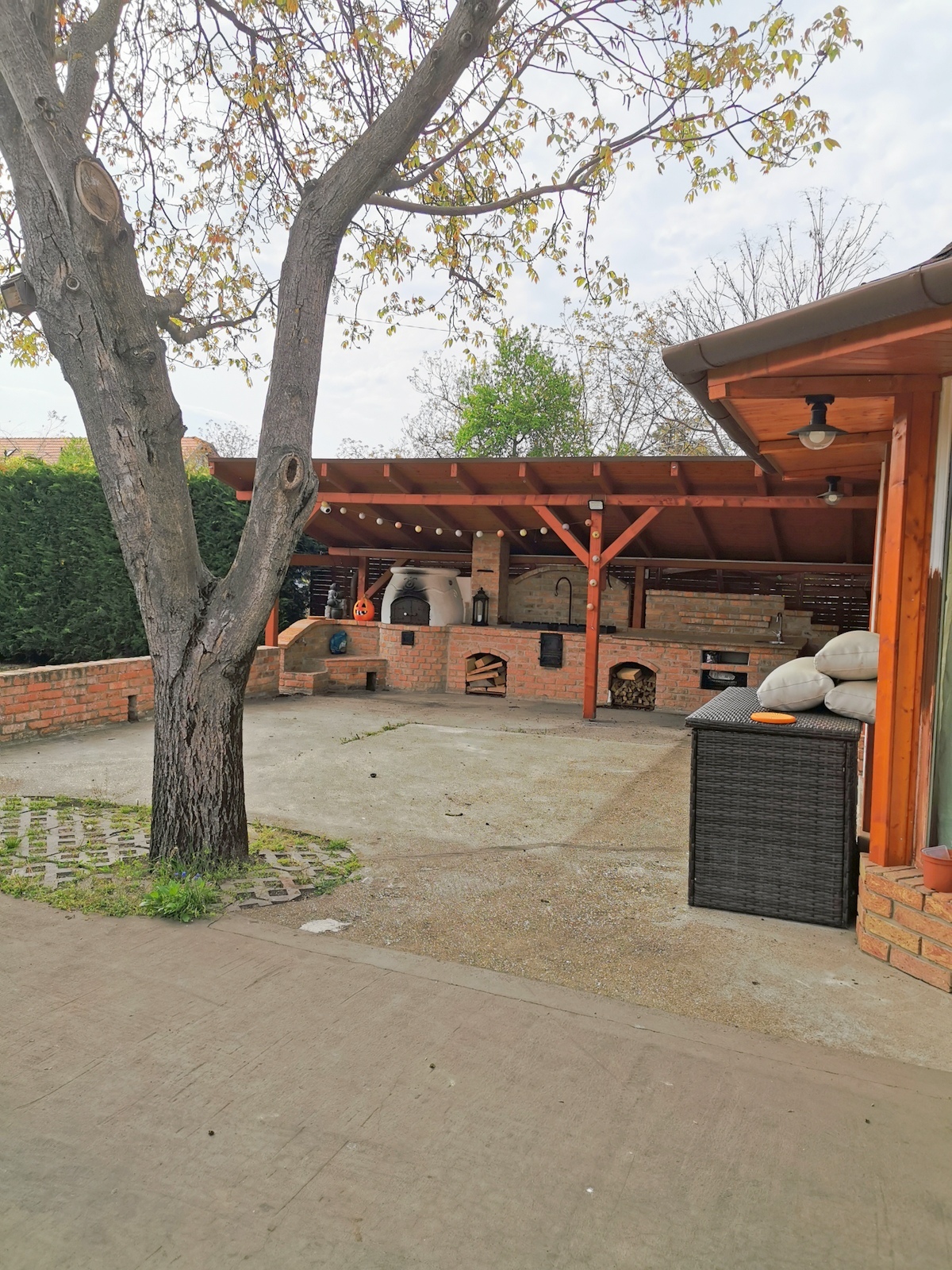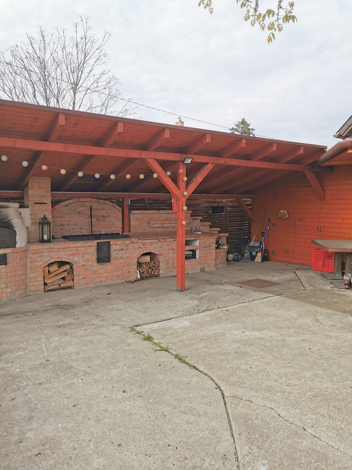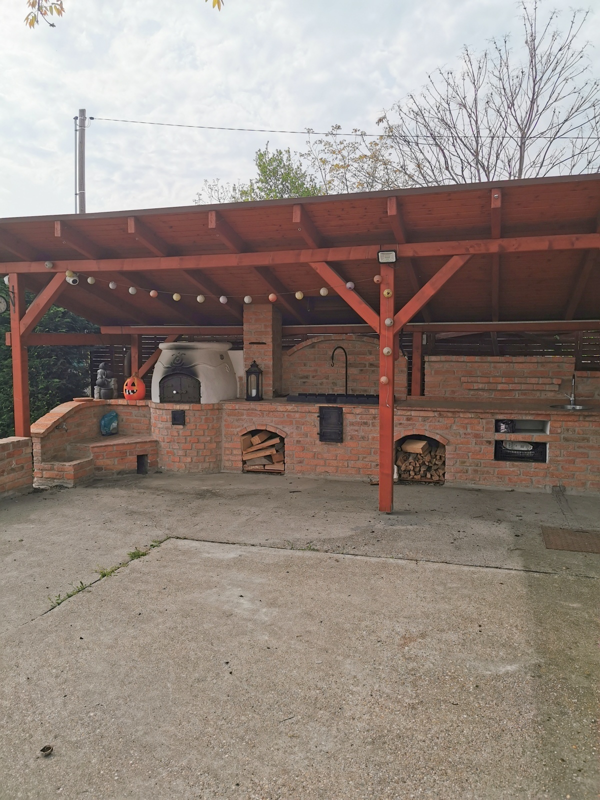 - A ház kert felöli oldalán egy 40 m2 területű fedett terasz, kemencével, kerti grillezővel.
