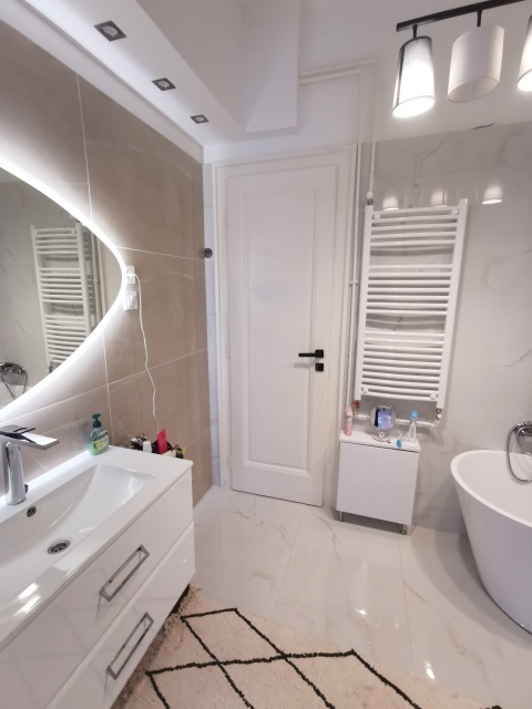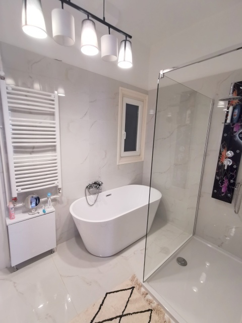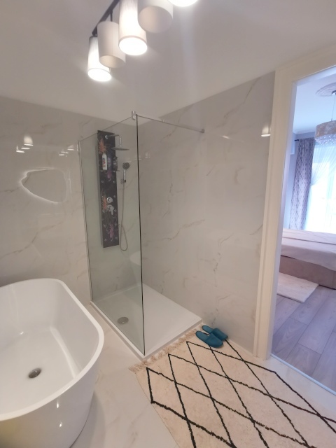 Konyhája új bútorral beépített, gépekkel felszereltek, mely a vételár részét képzi. A fürdőszoba tusolós és fürdőkádas.
