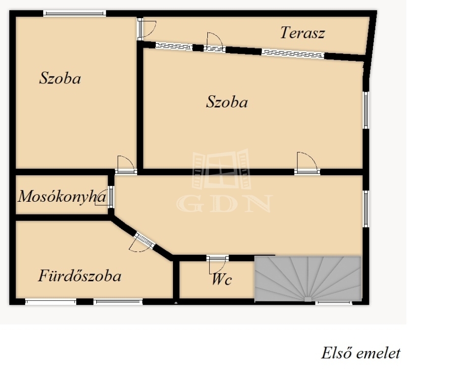 -Első emeltre ahogy feljutunk ott található 2 különnyíló hálószoba, egy külön fürdőszobával , és különálló mosdóval, háztartási helyiséggel.