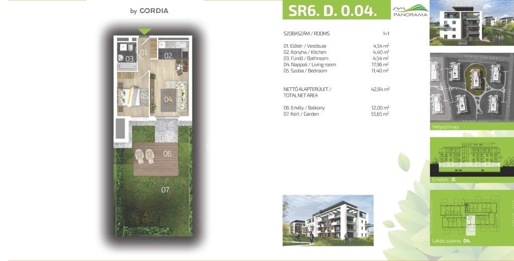 A ’D’ épületben kínáljuk eladásra ezt az 43 m2-es, 1+1 szobás lakást. A sok egyedi, a mai kor igényeinek megfelelő kialakítás mellett az ingatlan igazi különlegessége a 12 m2-es terasz, valamint az 56 m2-es PRIVÁT KERT. A telekhatáron körbe kerítés készül. A kertbe telepített növények fenntarthatósága automata öntözőberendezéssel biztosított.
