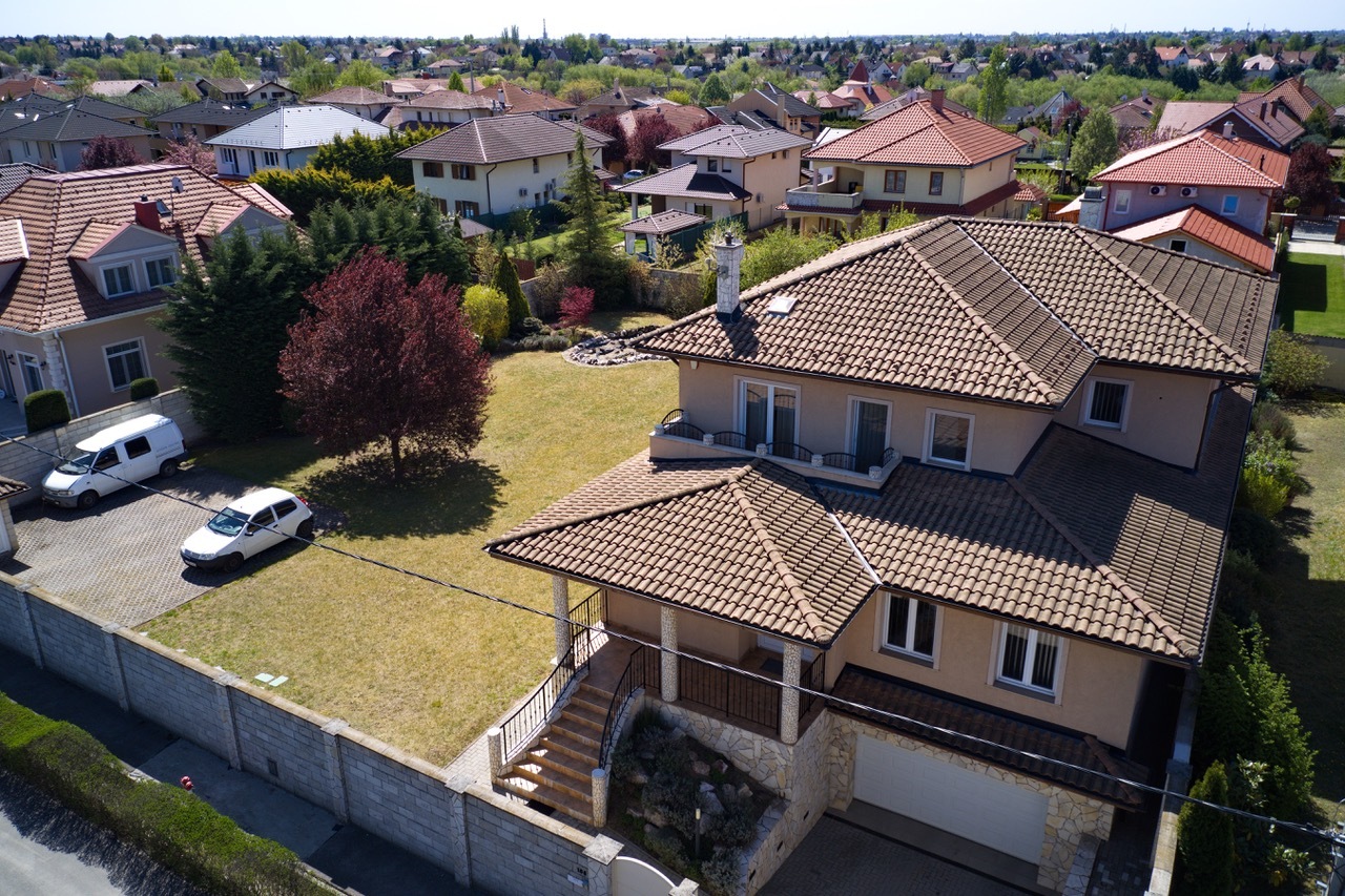 A ház dupla telekre épült 1309 nm-es így a 3 szintes 364 nm-es 5+1 félszobás 2 gardrób szobás ingatlan mellett bőven maradt hely a gondozott parkosított kertnek.