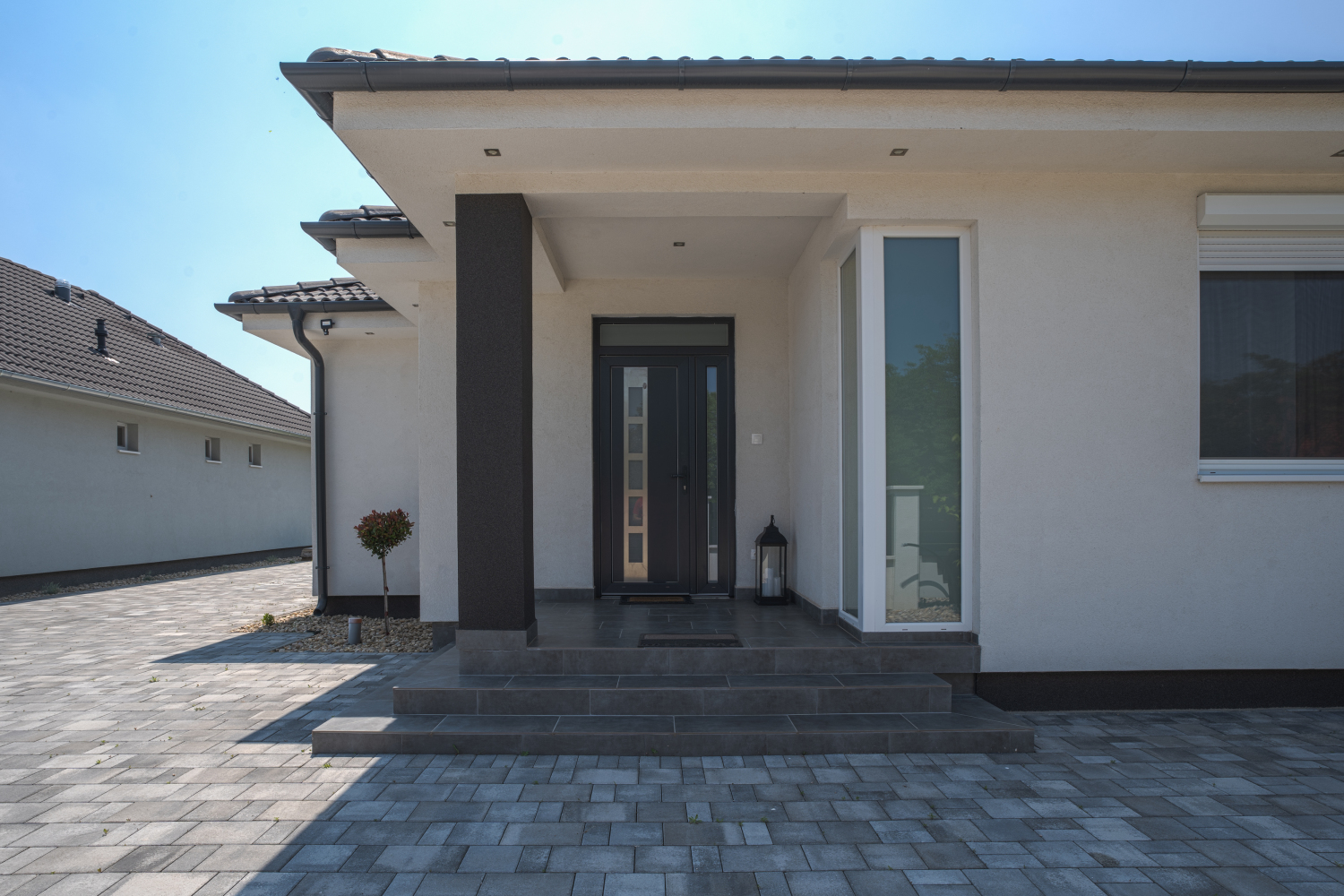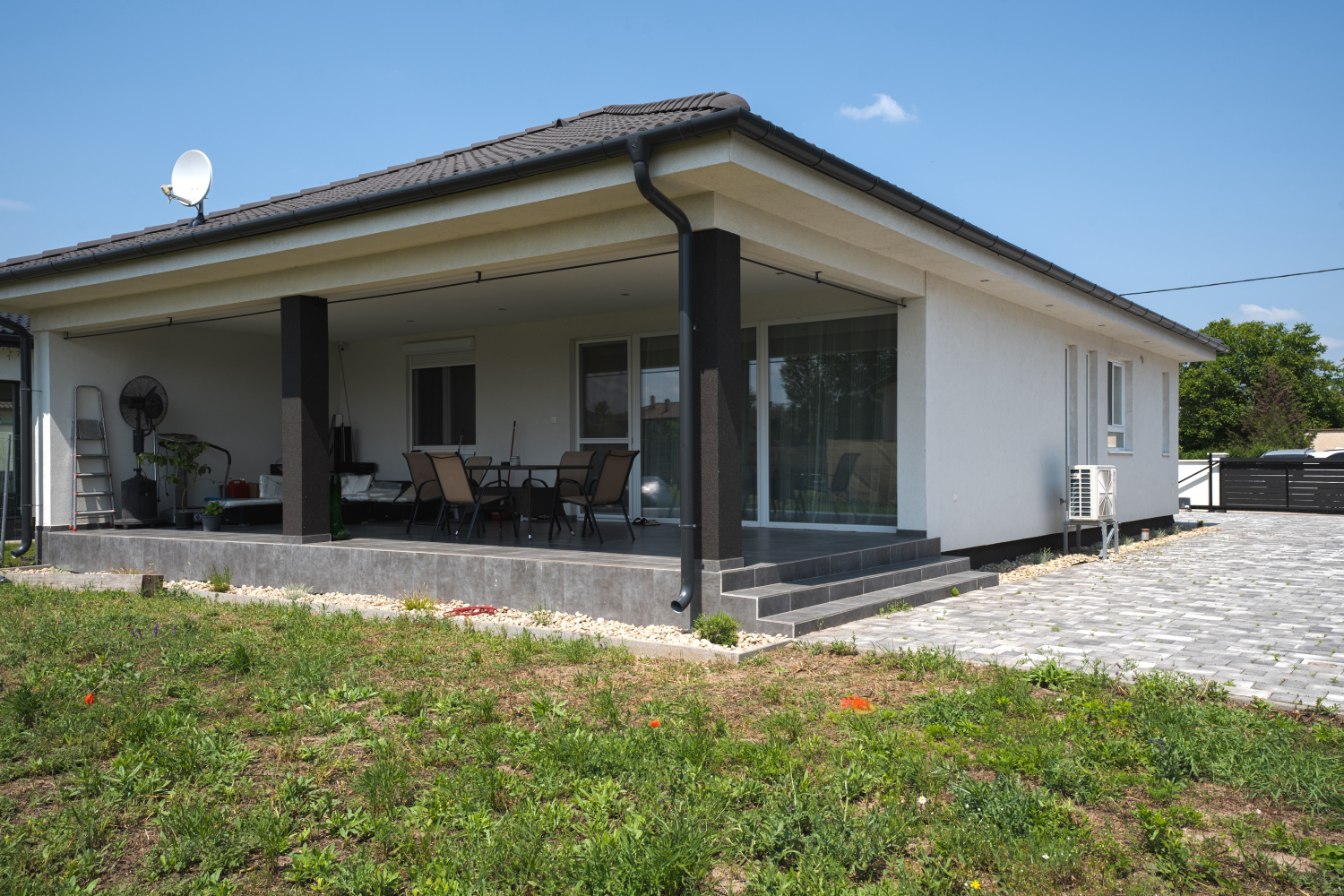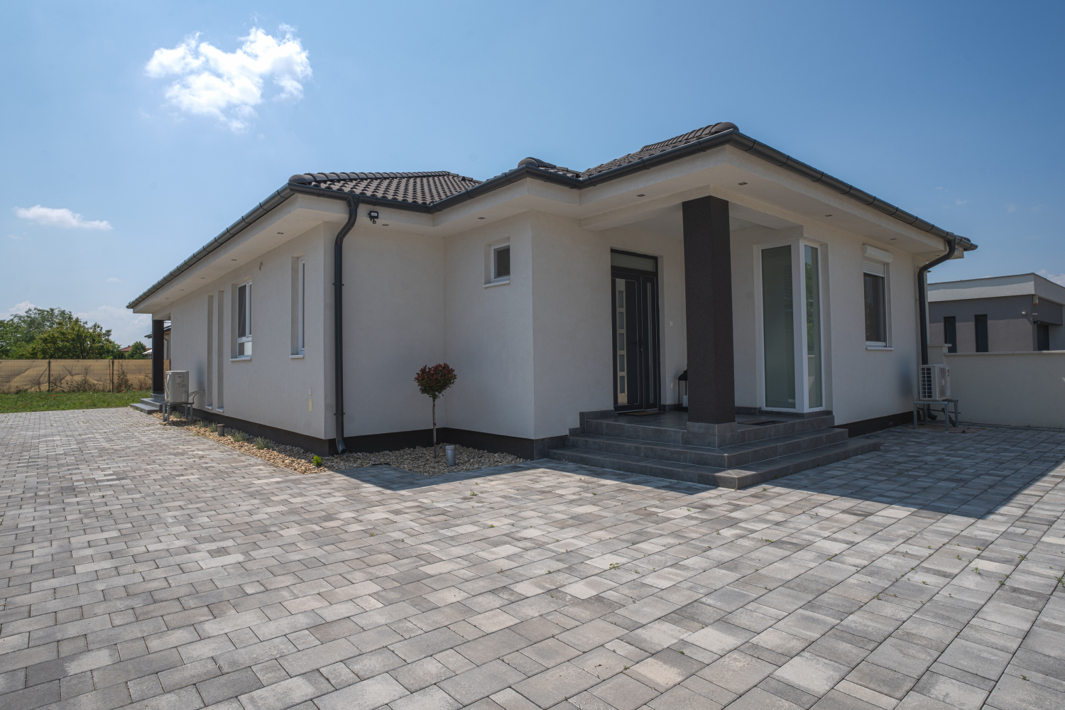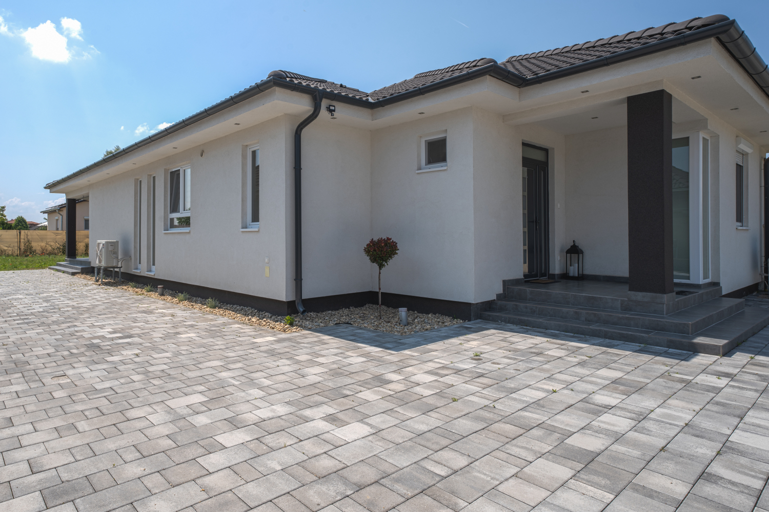 Az ingatlan 585 nm-es telken fekszik, az aszfaltozott útról, elektromos kapun történő bejutással térkövezett udvarra érkezünk, melyen több személyautó is elfér. A terasz mögött füves terület található.