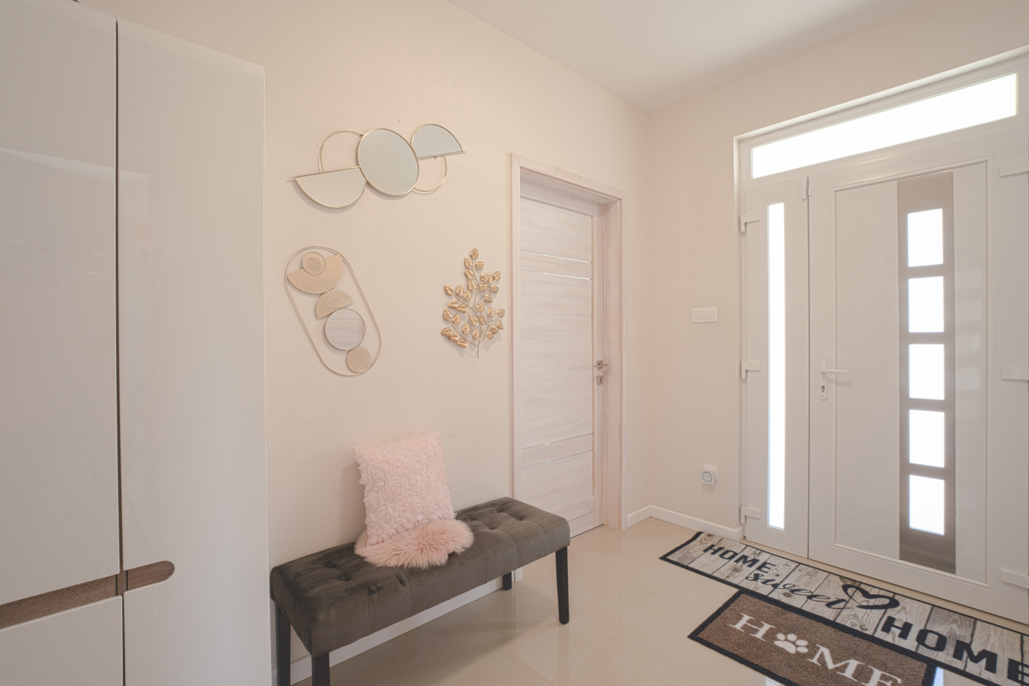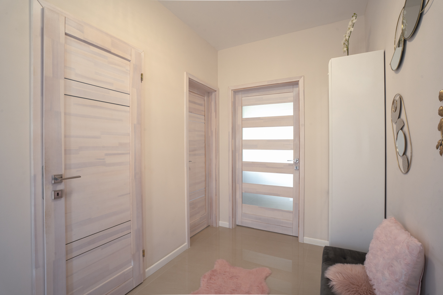 A 3 rétegű műanyag nyílászárók redőnnyel vannak ellátva. A közösségi terekben fényes felületű hidegburkolatok lettel elhelyezve.