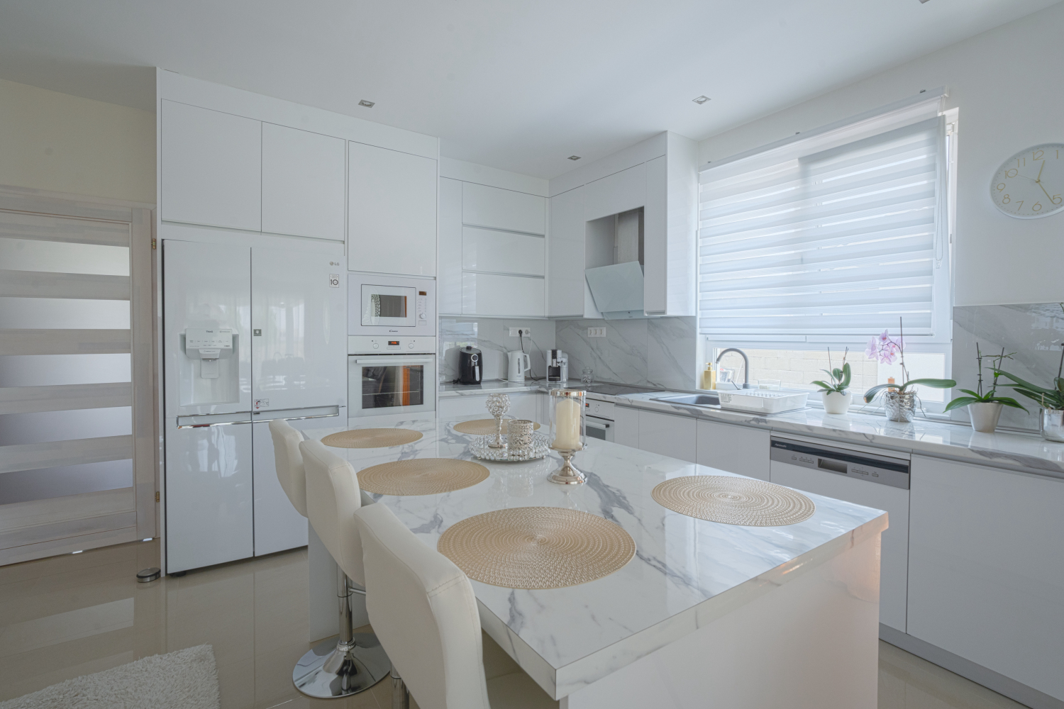 A beépített konyha modern elektromos berendezései között dupla sütő, tűzhely, páraelszívó található.
