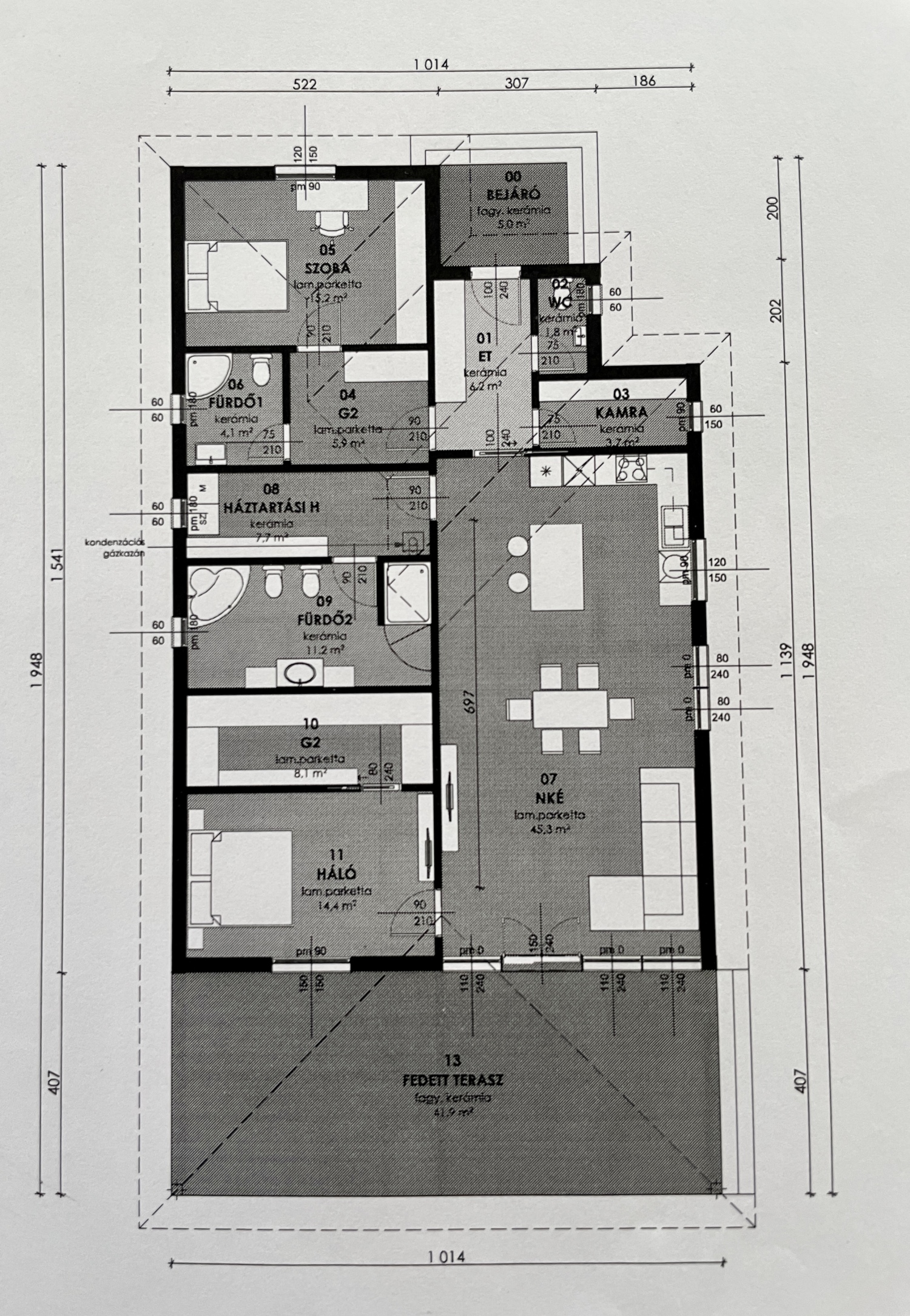 A nappaliból tágas, 40 nm-es fedett terasz érhető el.