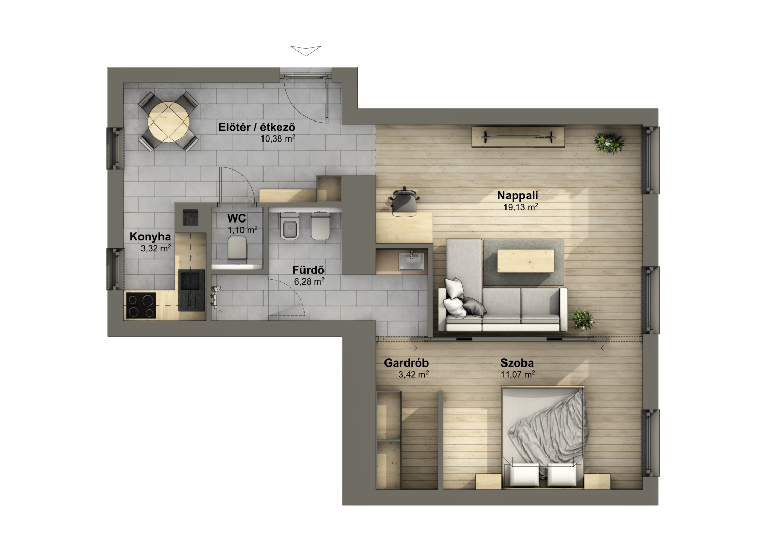 A modern konyha kompakt, mindennel felszerelt, a mosógép is itt kapott helyet. Ablaka a kis belső udvarra néz, világos és könnyen átszellőztethető az egész lakás.