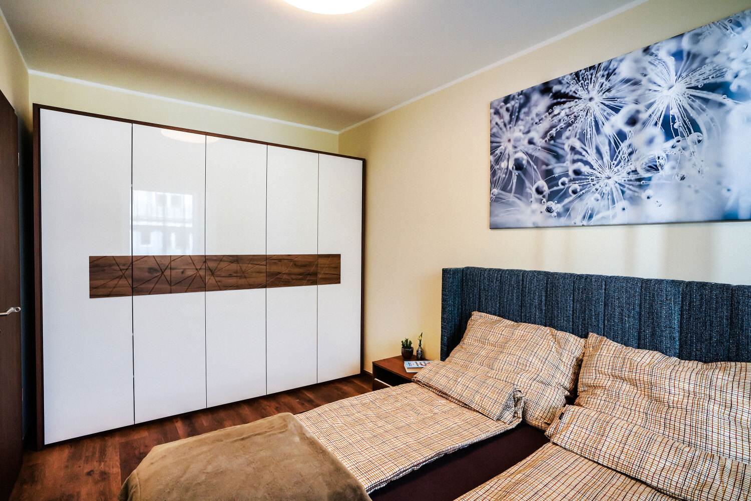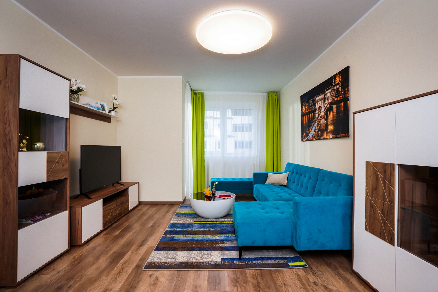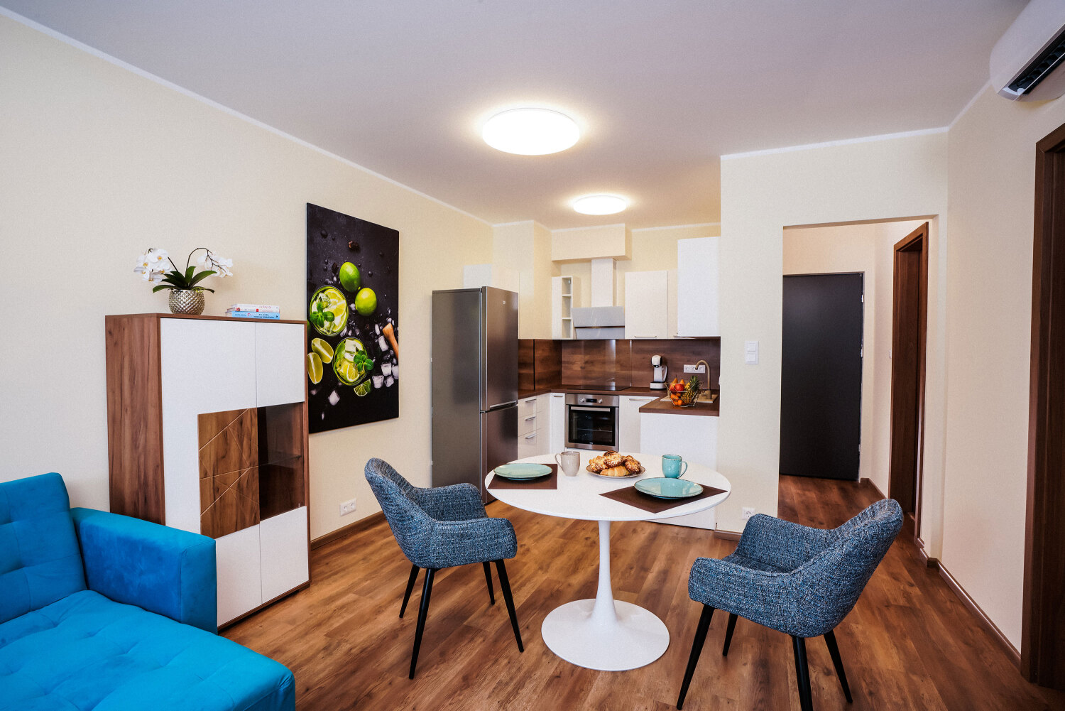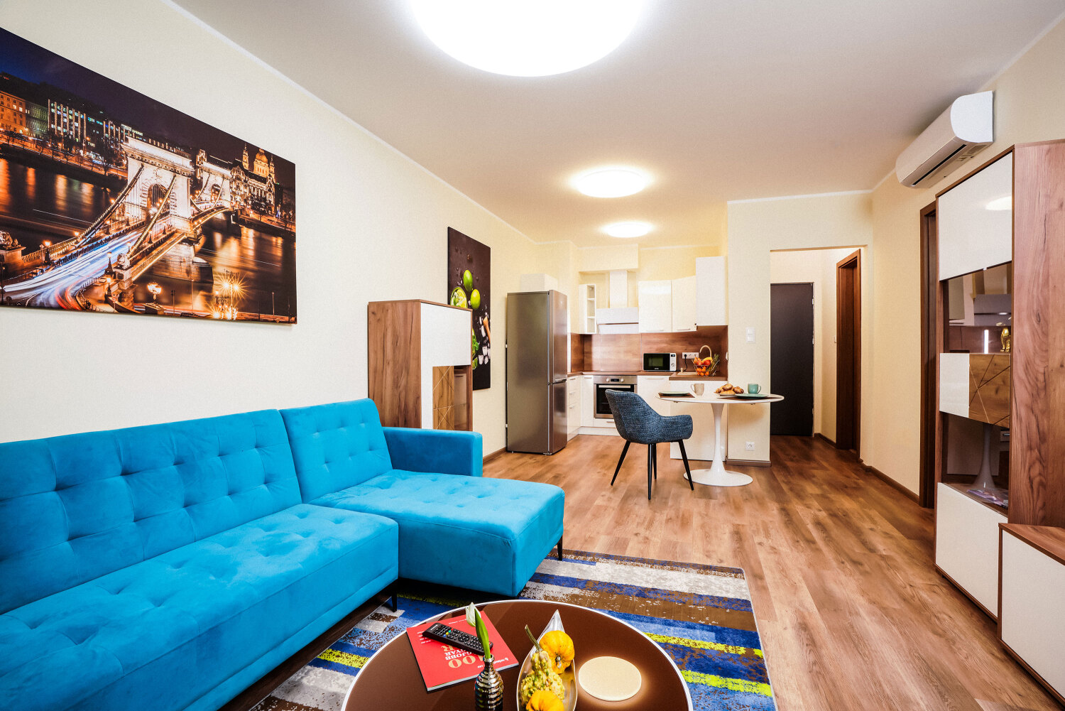 A lakás a képeken látható prémium bútorokkal és gépekkel van esztétikusan berendezve.