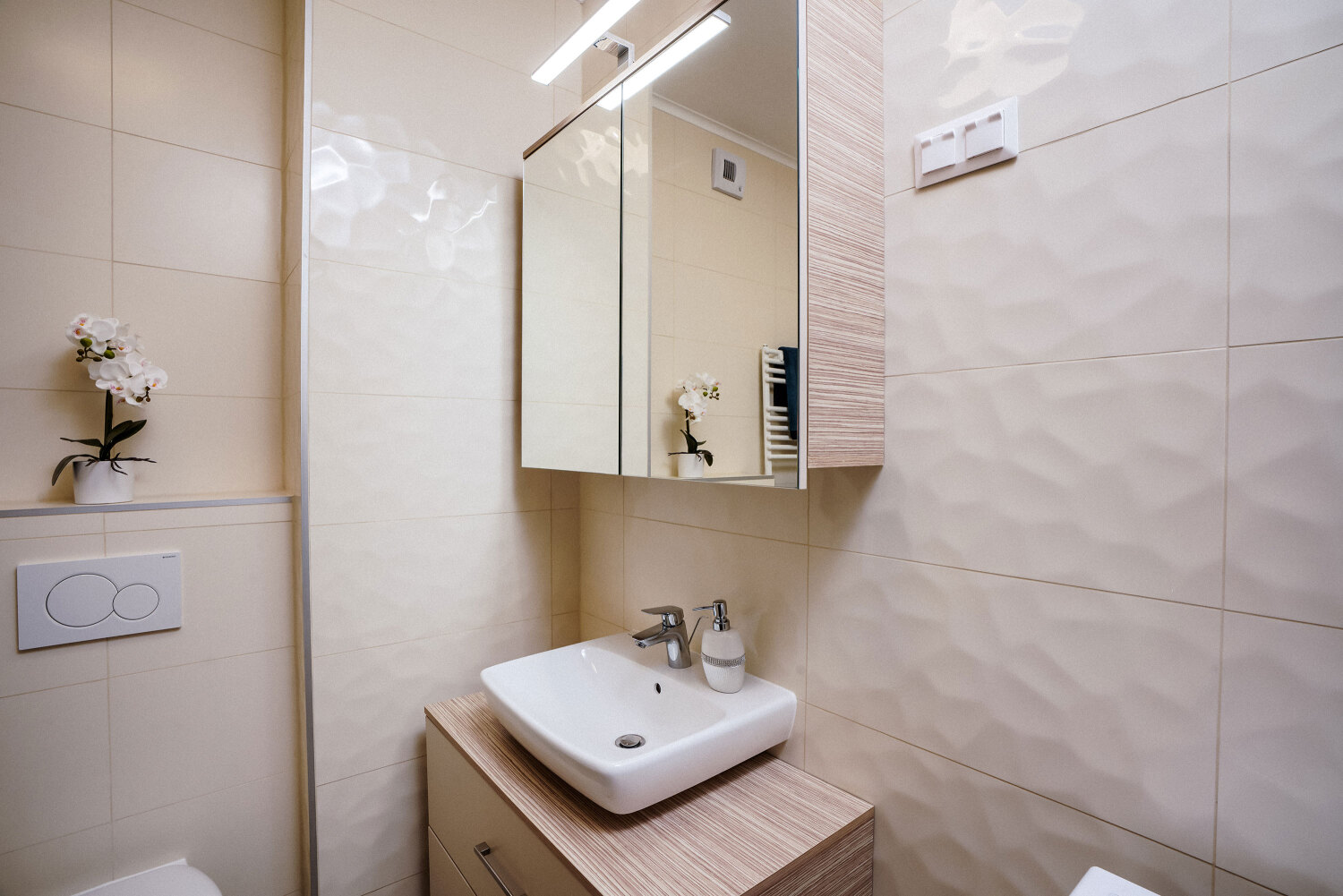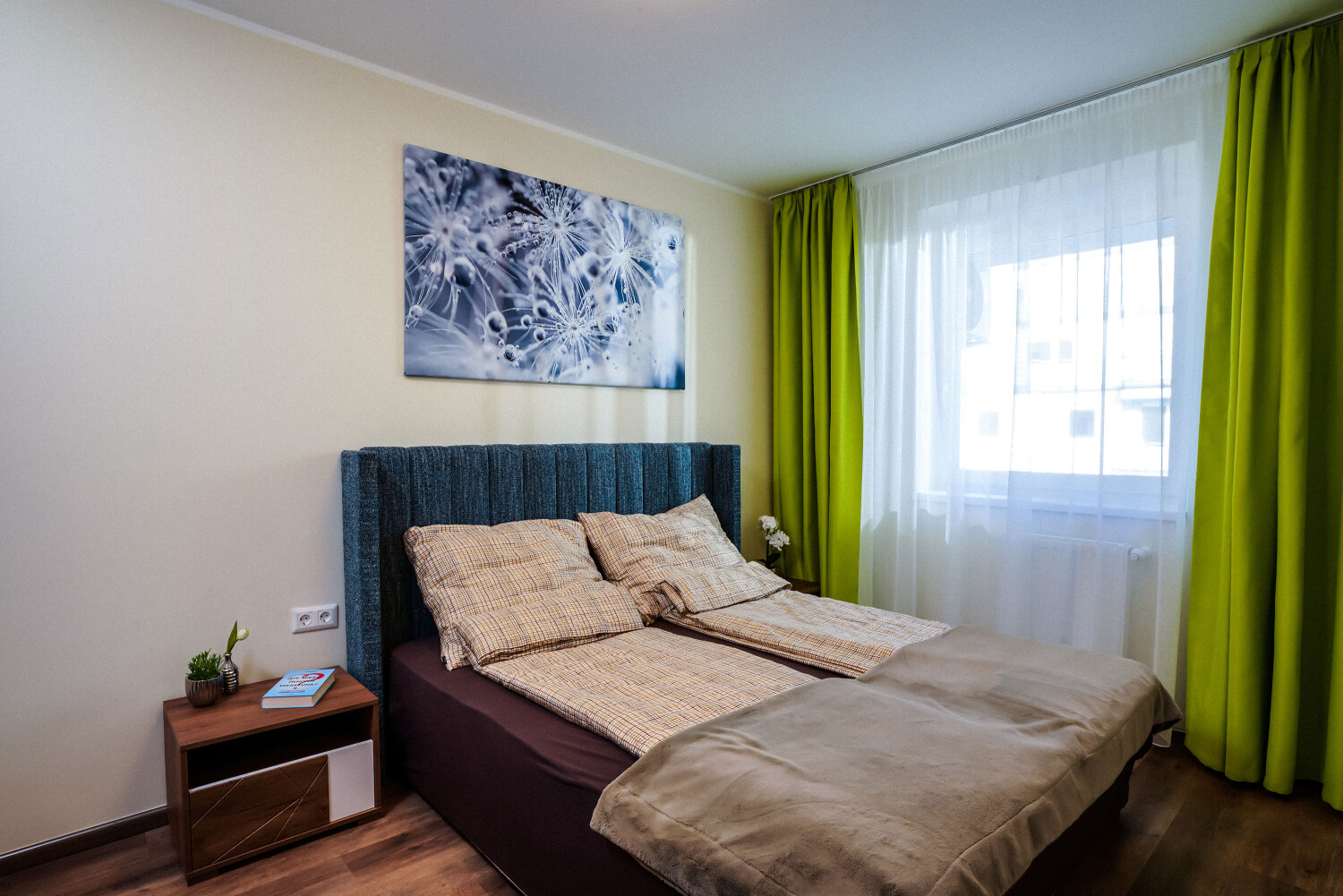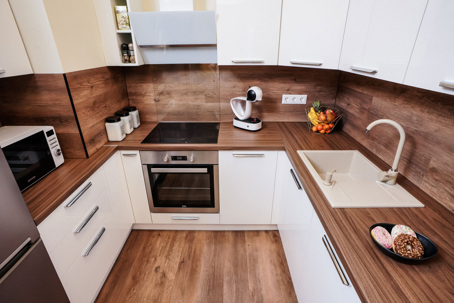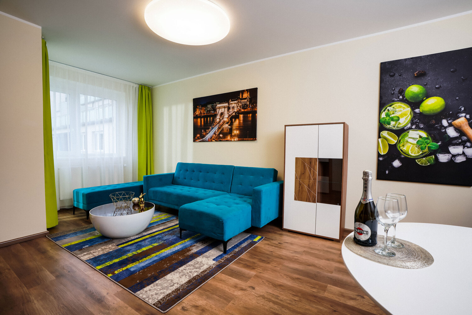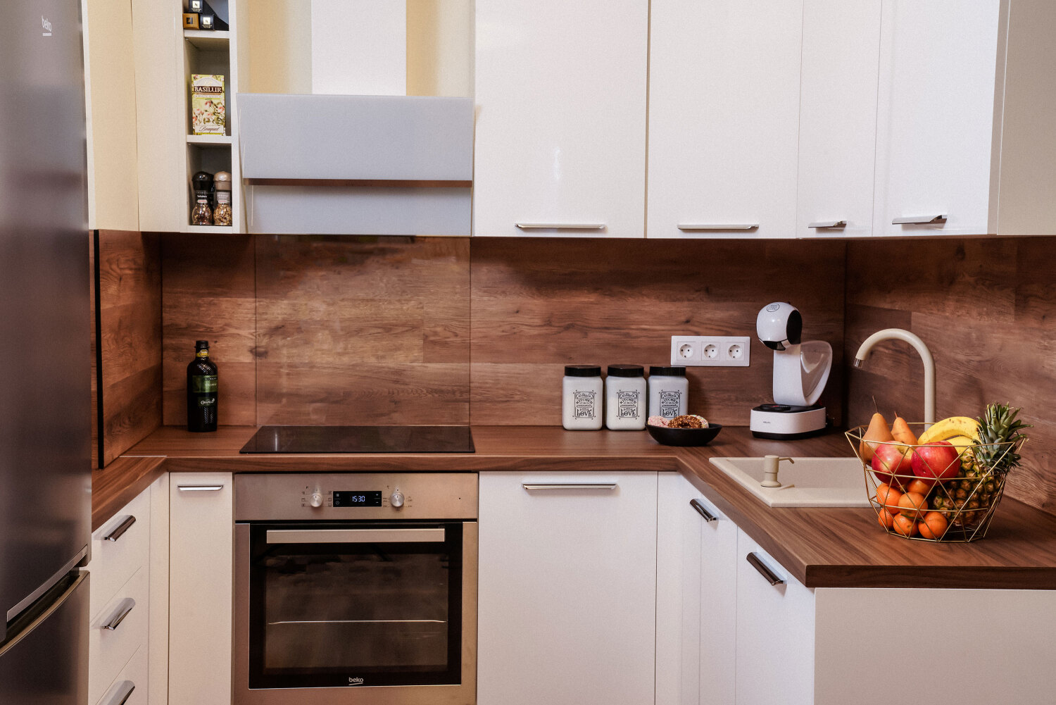 A lakás a képeken látható prémium bútorokkal és gépekkel van esztétikusan berendezve.