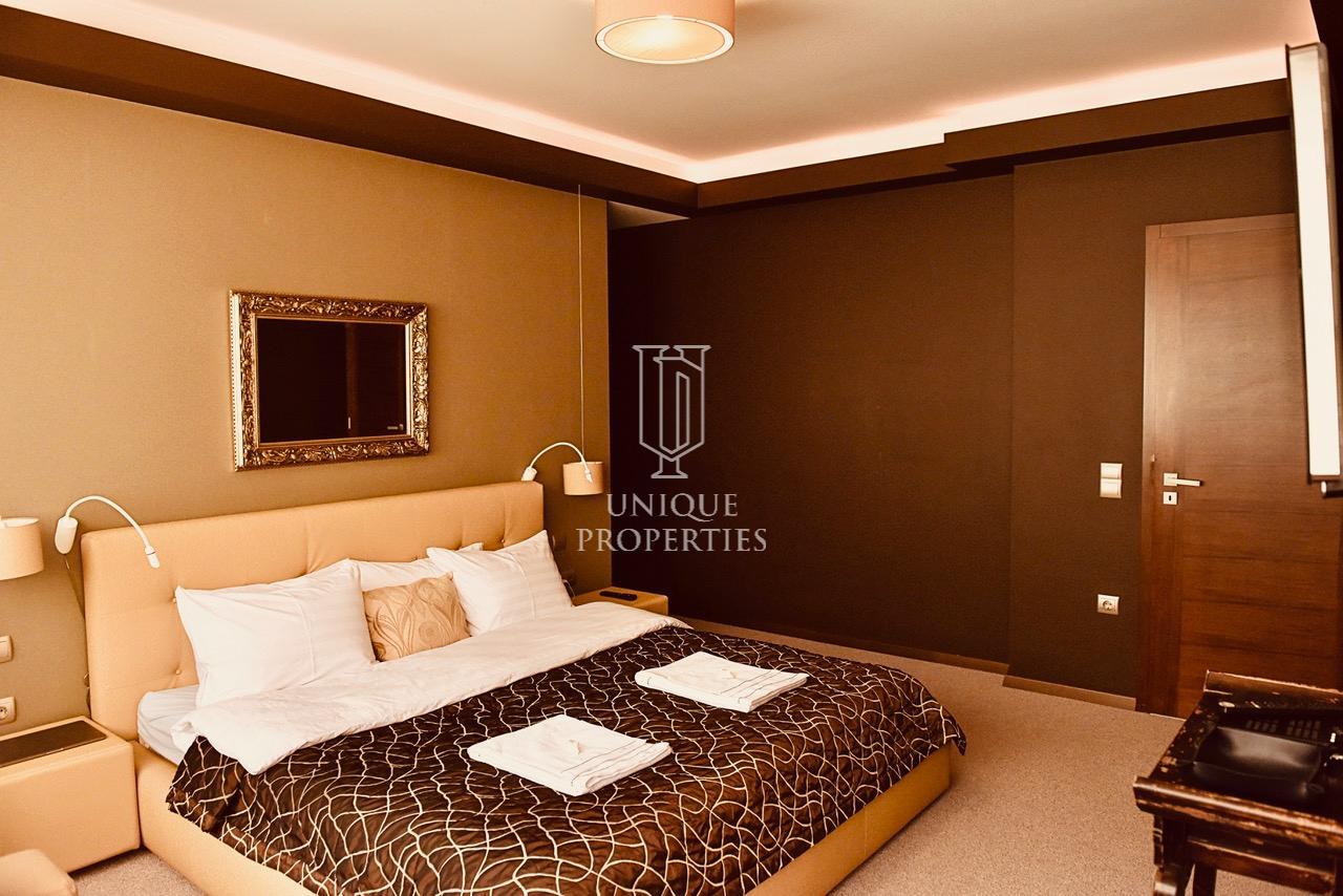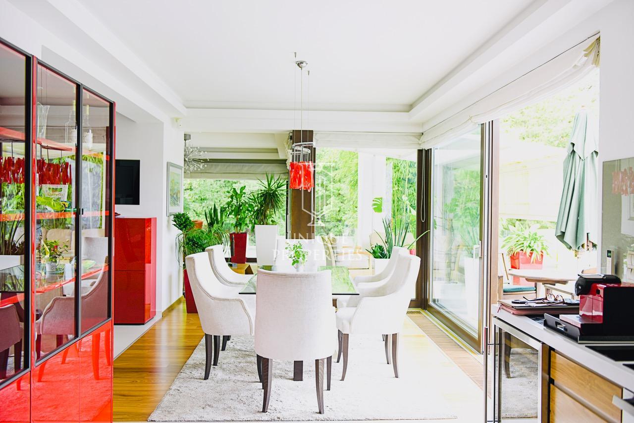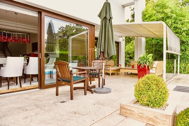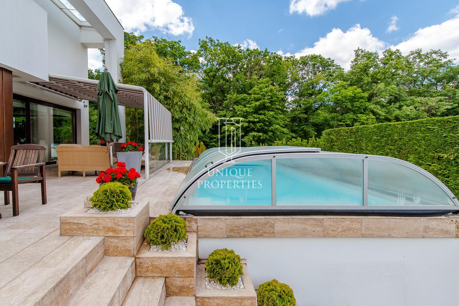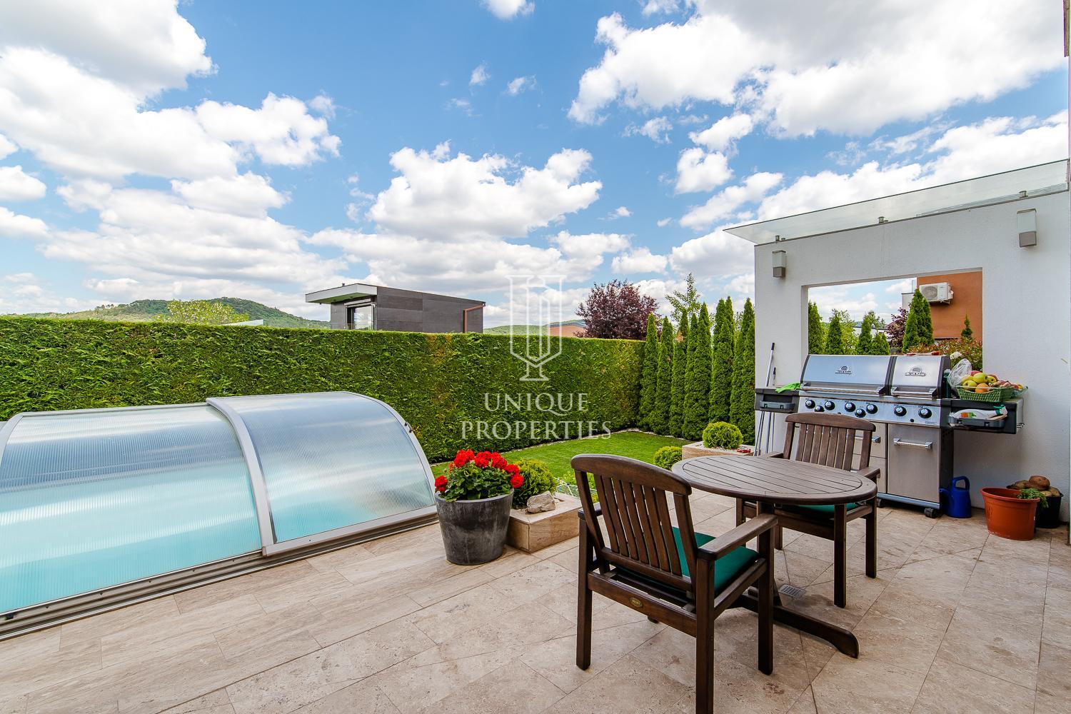 medence privát napozó terasszal van szegélyezve. Az otthon alsó szintjén wellness