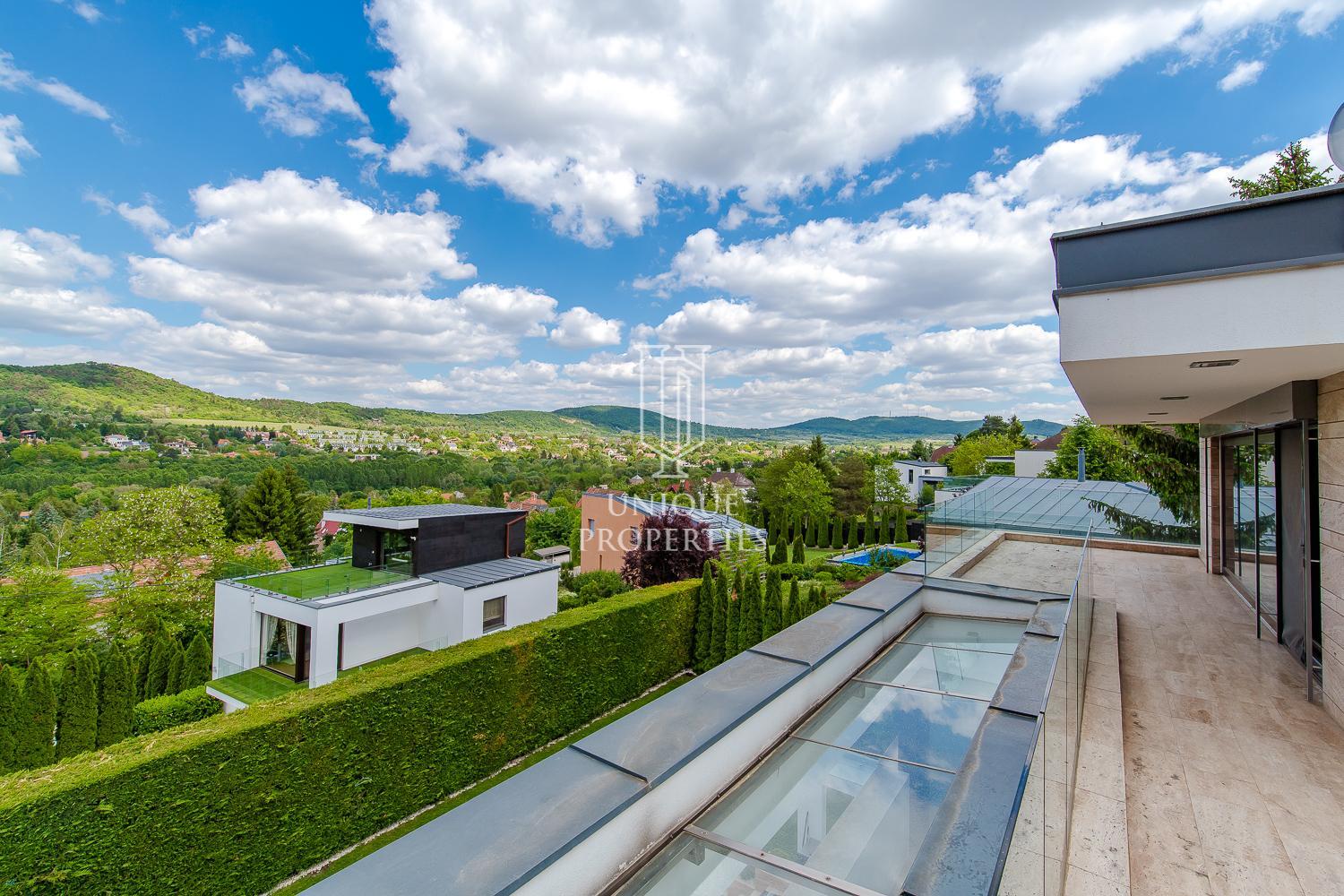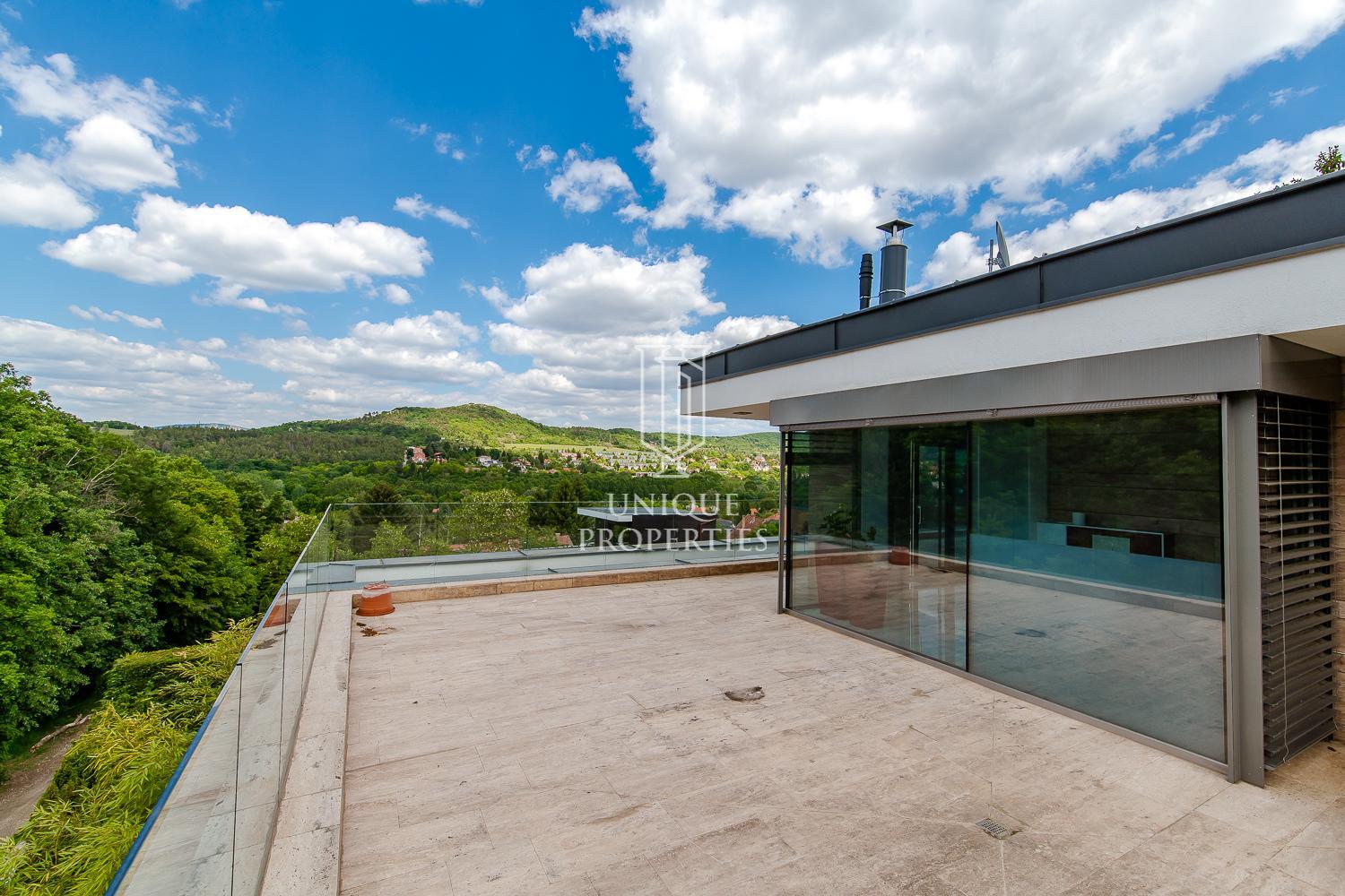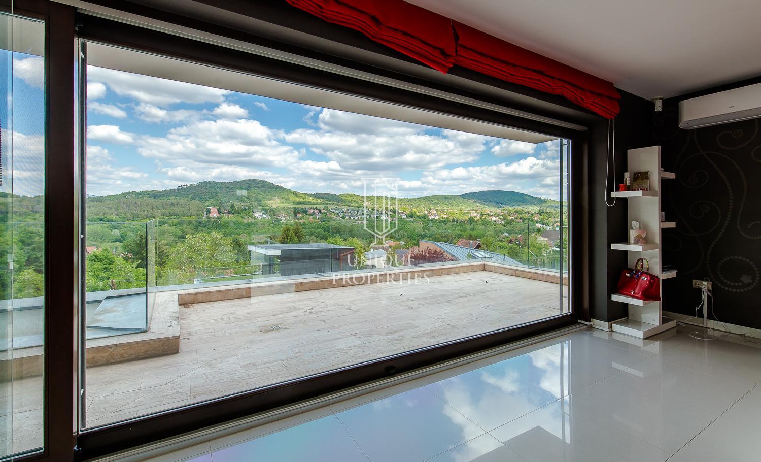 Az épület tetején levő tetőteraszról a budai hegyekre nyíló csodás panorámában