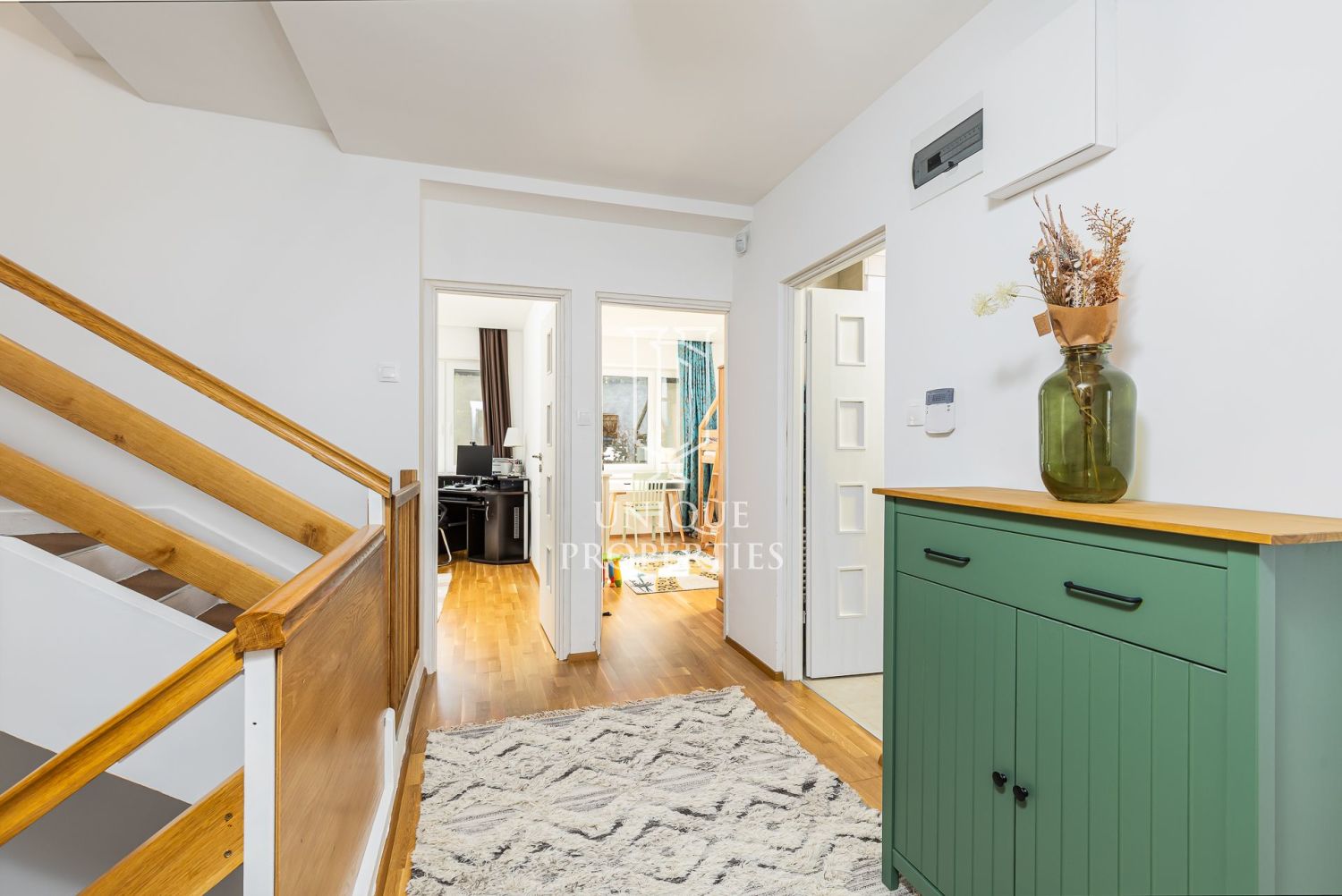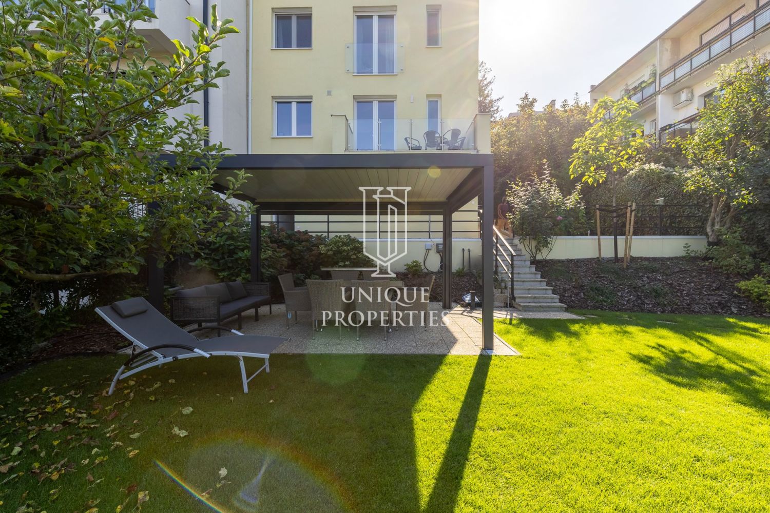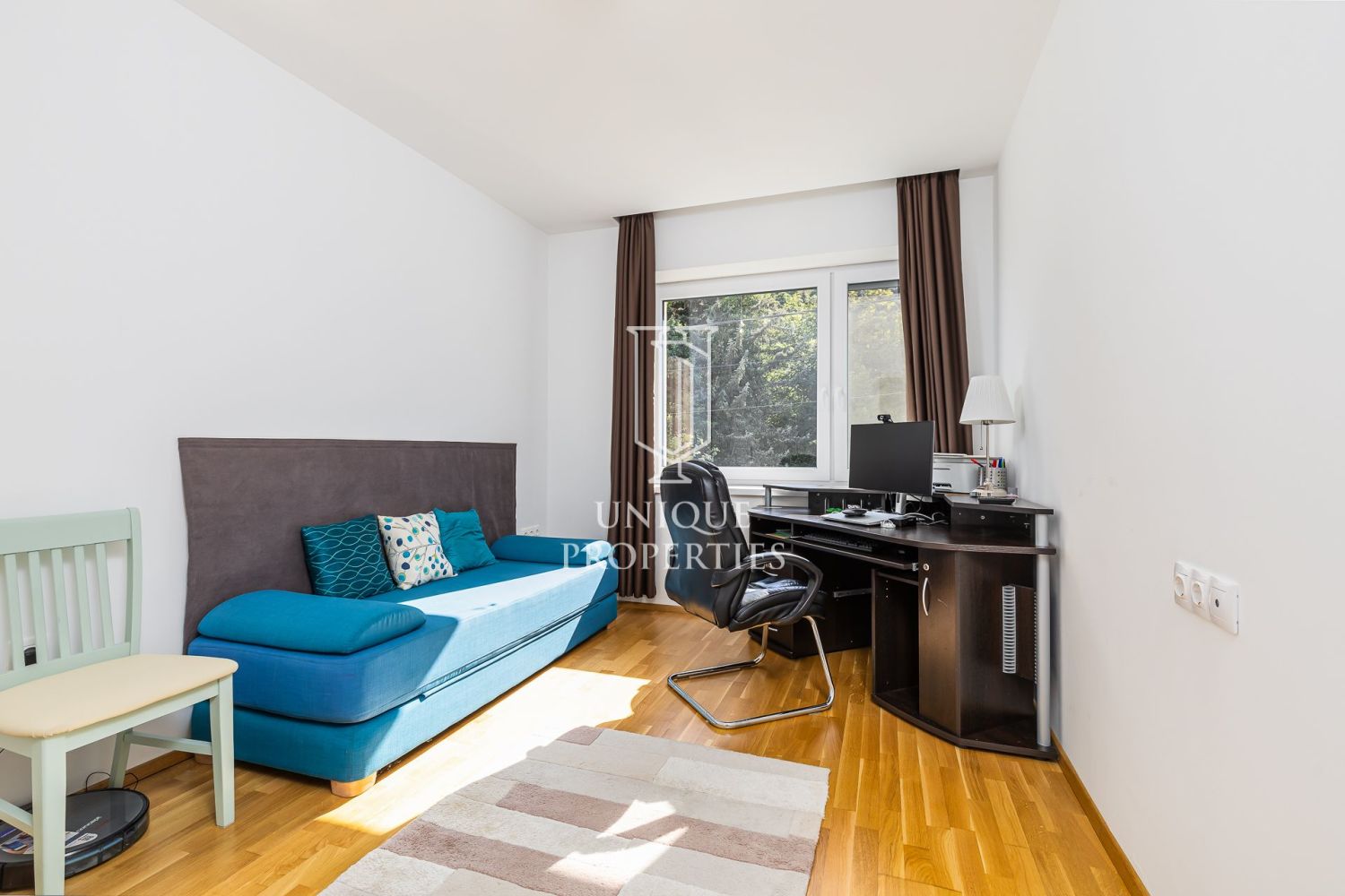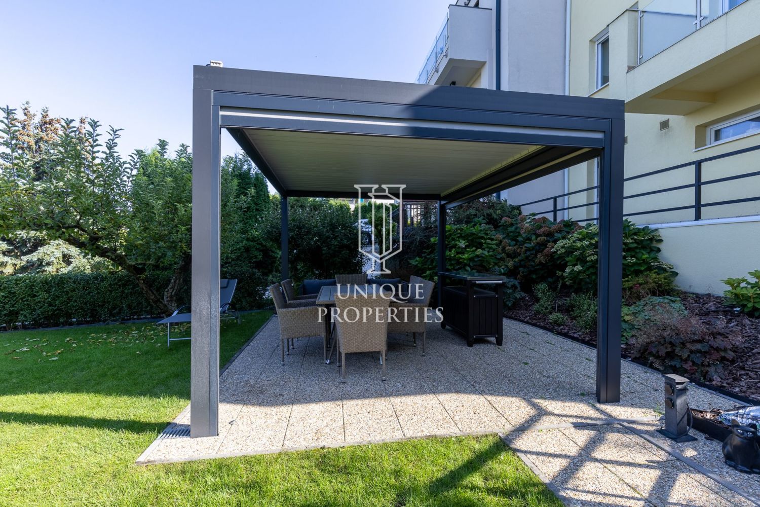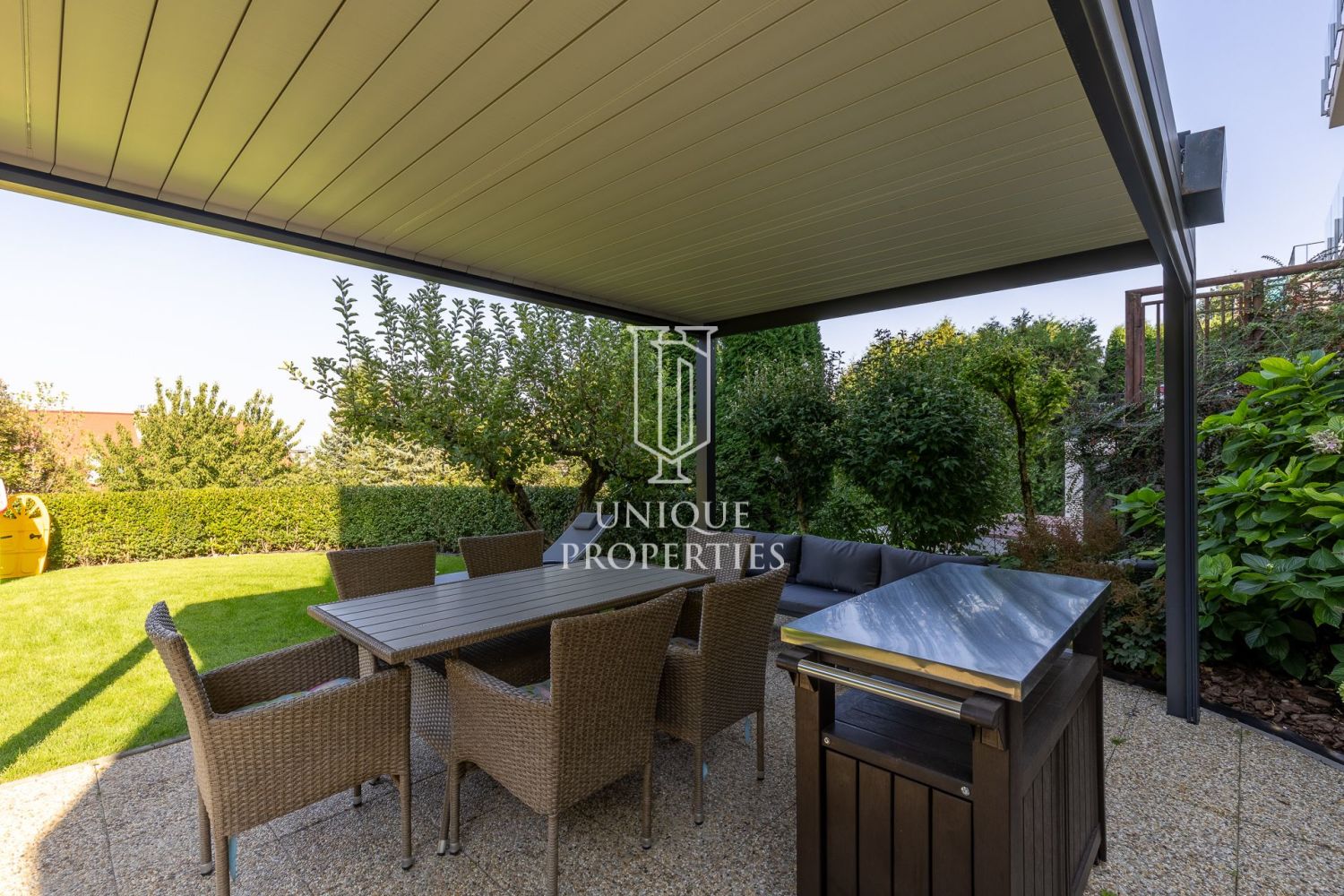 A modern stílusban megálmodott otthon DNY-i fekvésű, az amerikai konyhás nappalija panoráma ablakainak köszönhetően fényárban úszik. A gépesített konyha teraszáról közvetlenül az intim kertbe léphetünk. A négy hálószobához három fürdőszoba tartozik. A negyedik hálószoba jelenleg dolgozószobaként funkcionál.