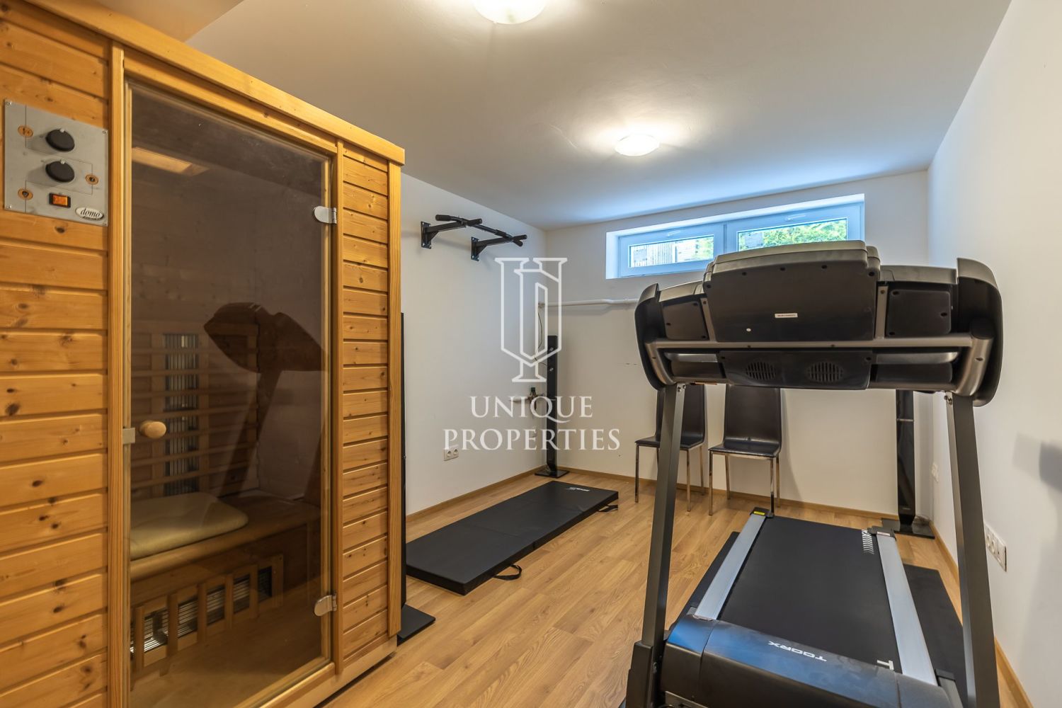 Az alsó, garázs szinten található egy szaunával felszerelt edzőterem. Az ingatlannál 3 db parkolási lehetőség van, 2 db kültéri és egy db beltéri parkoló áll rendelkezésre. A beltéri garázsban az elektromos autó gyorstöltési lehetőség (380V) biztosított.