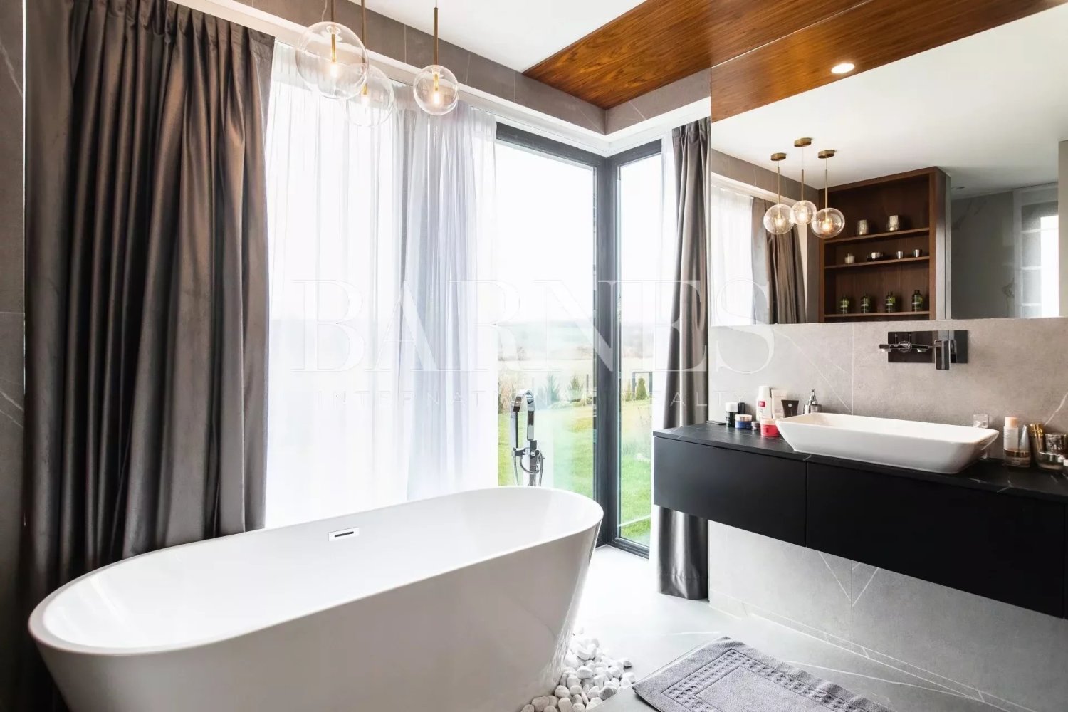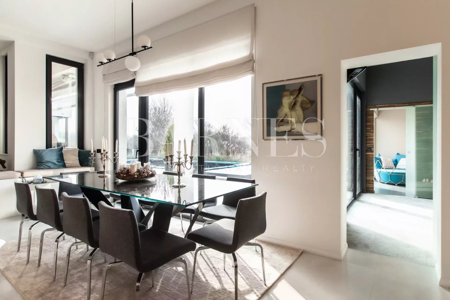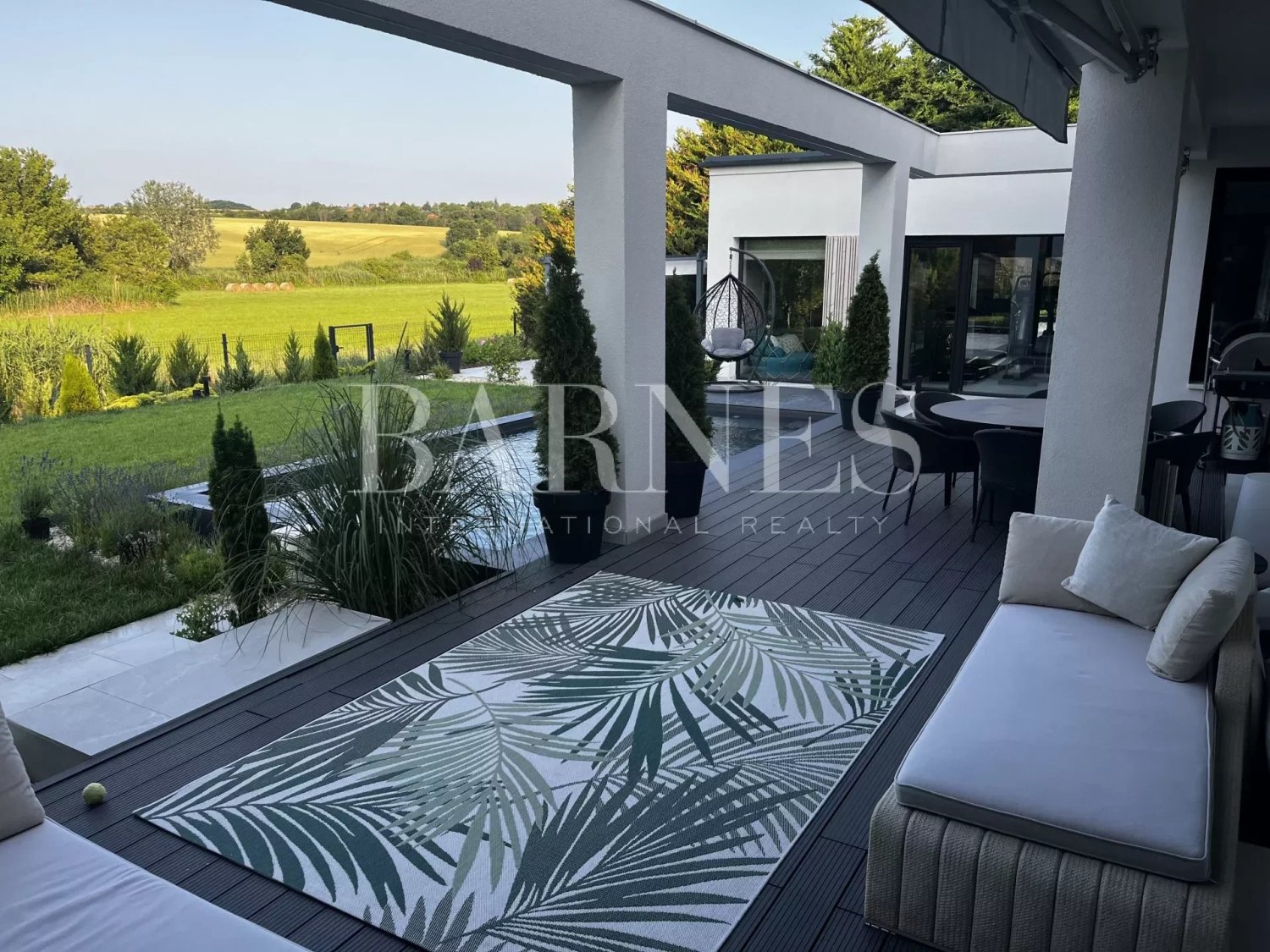 A villa különlegessége, az elvehetetlen panoráma: egy folyóparton helyezkedik el, biztonságos környezetben, rendezett, igényes környéken. A ház D-i fekvésű, reggeltől estig napos. Az épülettömb U alakban került kialakításra, oly módon hogy a család által használt terasz és medence teljesen privát szférába került. A terasz melletti kert feltöltése miatt, nagy, növényekkel beültetett, füves terület vált használhatóvá. A kertben öntözőrendszer, és biokert is található a sok különleges dísznövény mellett. A fűthető medencén kívül a teraszon grill-sarok és jacuzzi is elhelyezésre került. A ház szinteltolásos, ezért nagyon ergonomikus, minden funkcó két szinten található. A lakórészek és kiszolgáló részek a földszinten találhatóak a szülői lakrésszel, és a gyerek hálók, az emeleten találhatóak. Nagy gyerekes családoknak is ideális a ház elosztása, mivel a gyerekek az emeleten külön nappalit és teraszt tudnak használni.