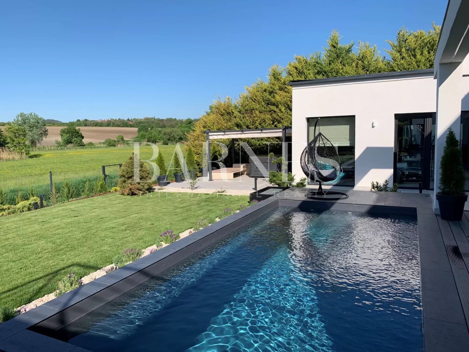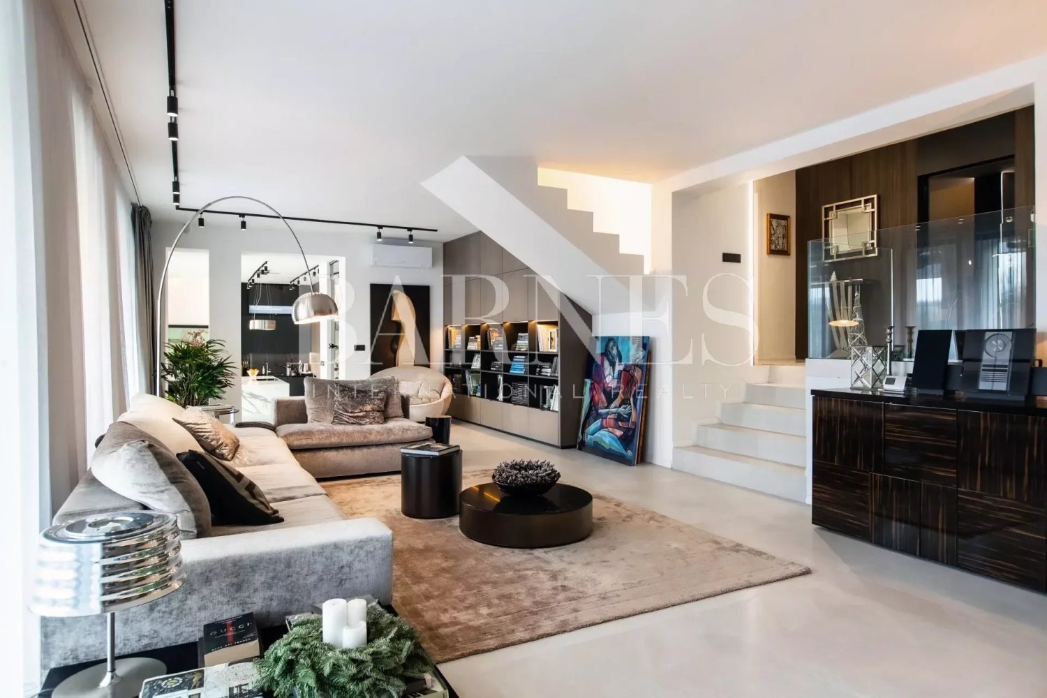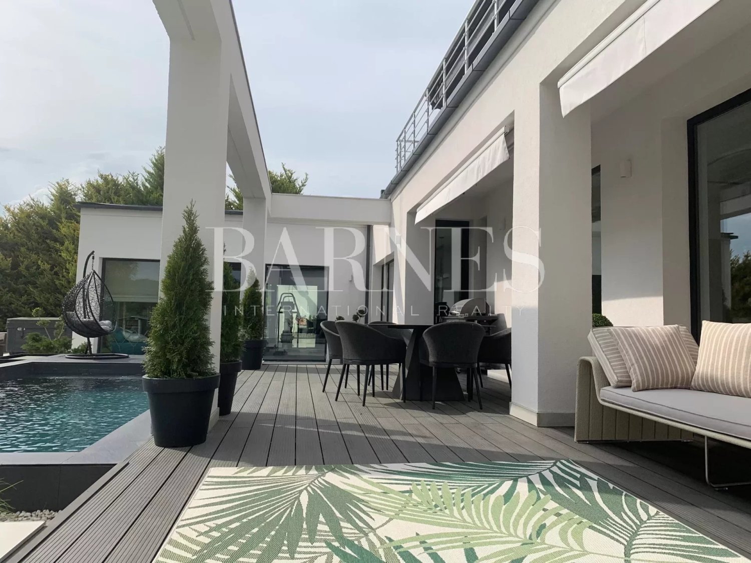 A villa különlegessége, az elvehetetlen panoráma: egy folyóparton helyezkedik el, biztonságos környezetben, rendezett, igényes környéken. A ház D-i fekvésű, reggeltől estig napos. Az épülettömb U alakban került kialakításra, oly módon hogy a család által használt terasz és medence teljesen privát szférába került. A terasz melletti kert feltöltése miatt, nagy, növényekkel beültetett, füves terület vált használhatóvá. A kertben öntözőrendszer, és biokert is található a sok különleges dísznövény mellett. A fűthető medencén kívül a teraszon grill-sarok és jacuzzi is elhelyezésre került. A ház szinteltolásos, ezért nagyon ergonomikus, minden funkcó két szinten található. A lakórészek és kiszolgáló részek a földszinten találhatóak a szülői lakrésszel, és a gyerek hálók, az emeleten találhatóak. Nagy gyerekes családoknak is ideális a ház elosztása, mivel a gyerekek az emeleten külön nappalit és teraszt tudnak használni.