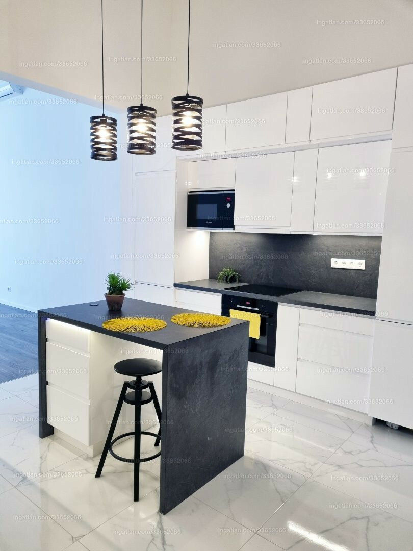 The kitchen furniture is high quality, minimalist style, with gloss white painted door fronts, anthracite grey worktops, kitchen island , custom made, built to size. All built-in electronics