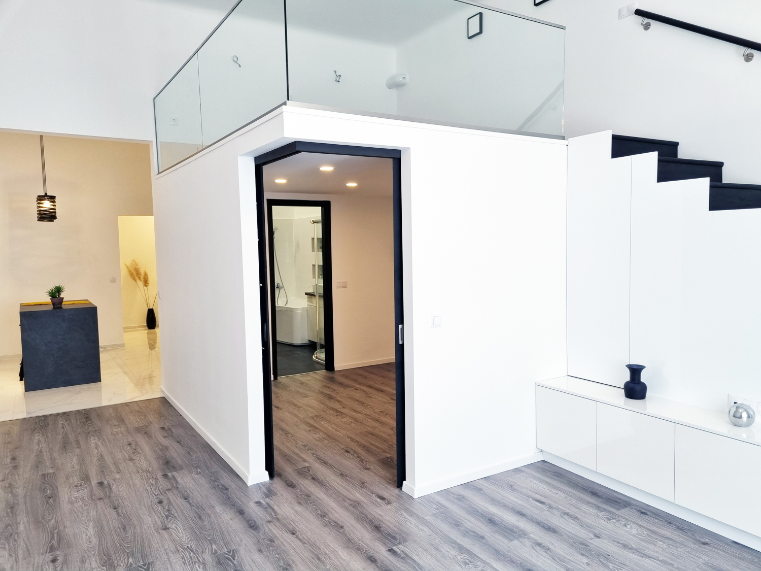 galériás modern lakás, mely 68.65m2+10.65m2 galériás, belmagassága 4,1m.