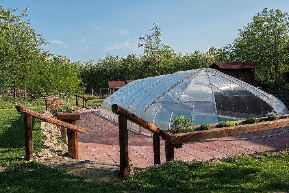 - Kültéri medence, 4 x 10 m méret, polikarbonát medencefedéssel