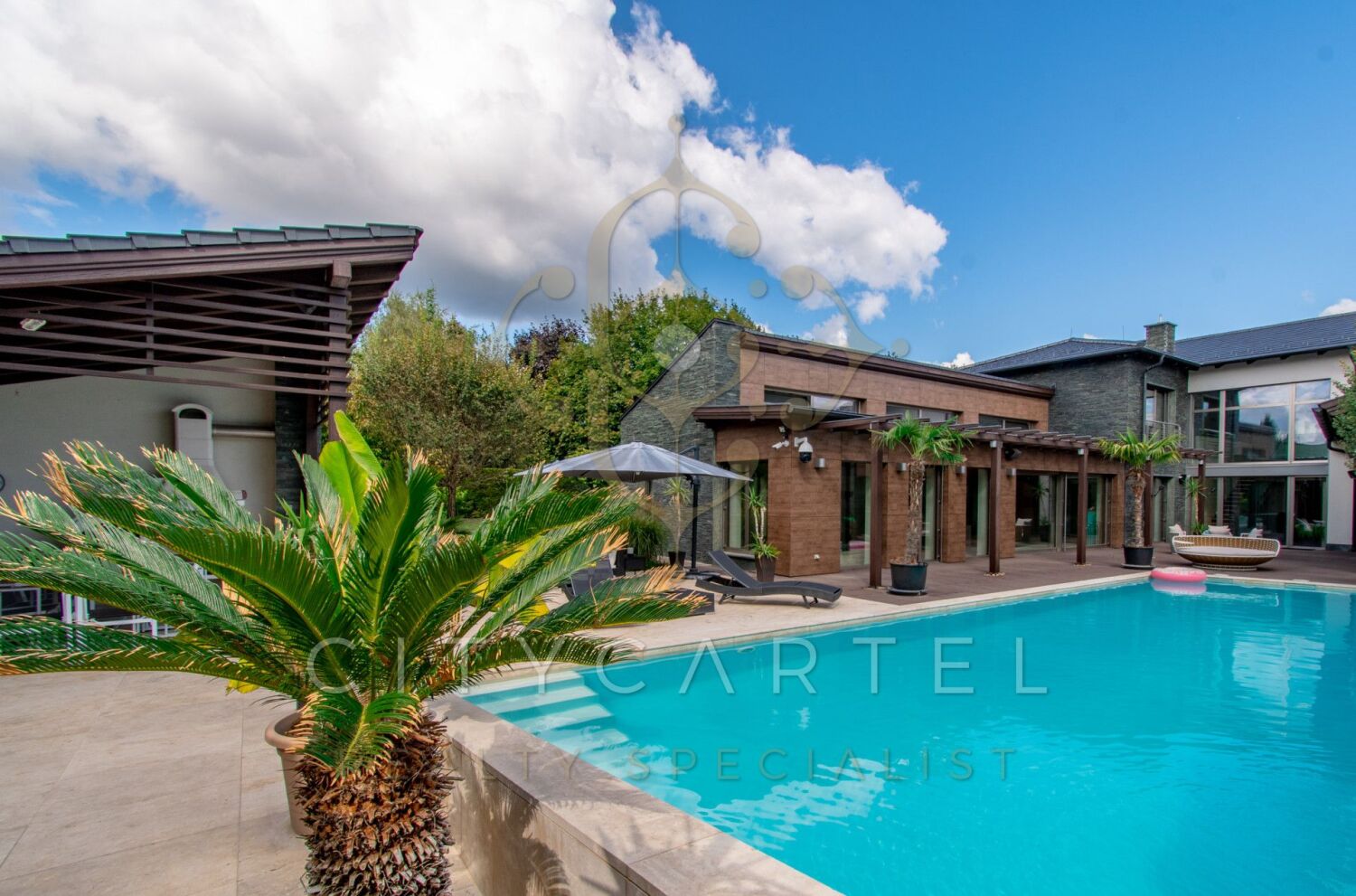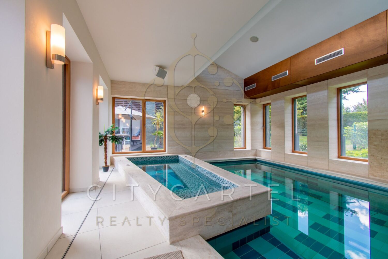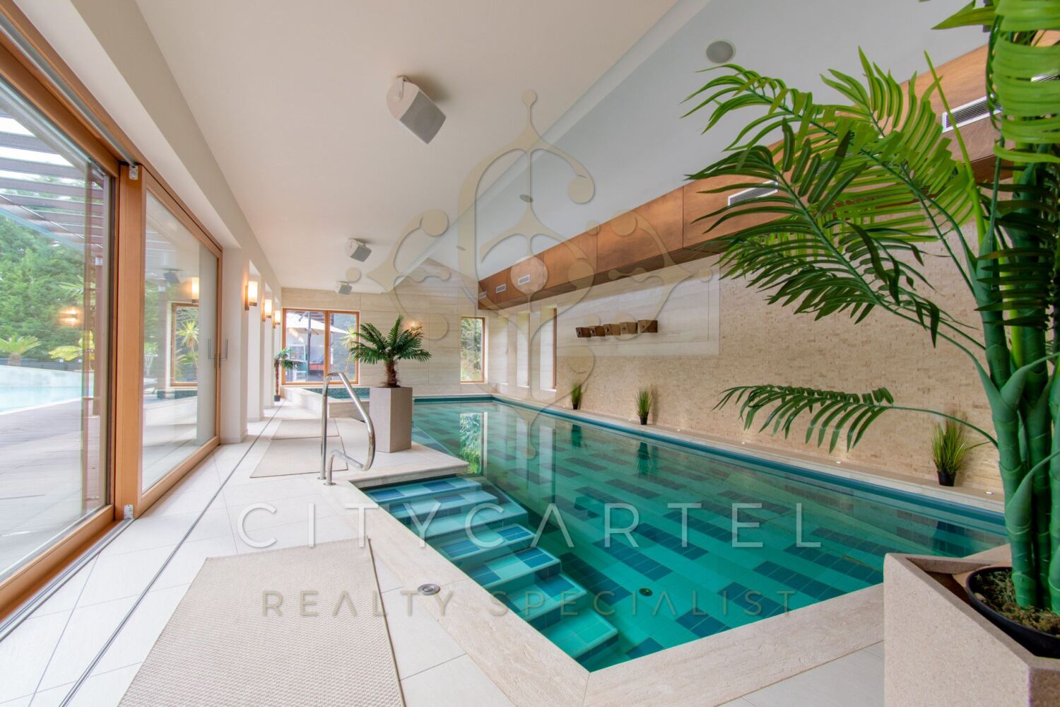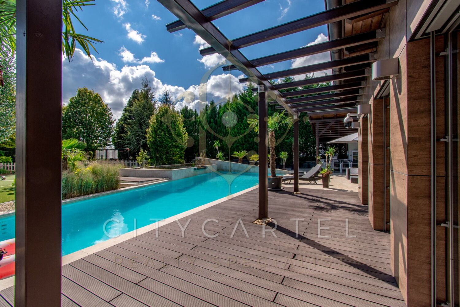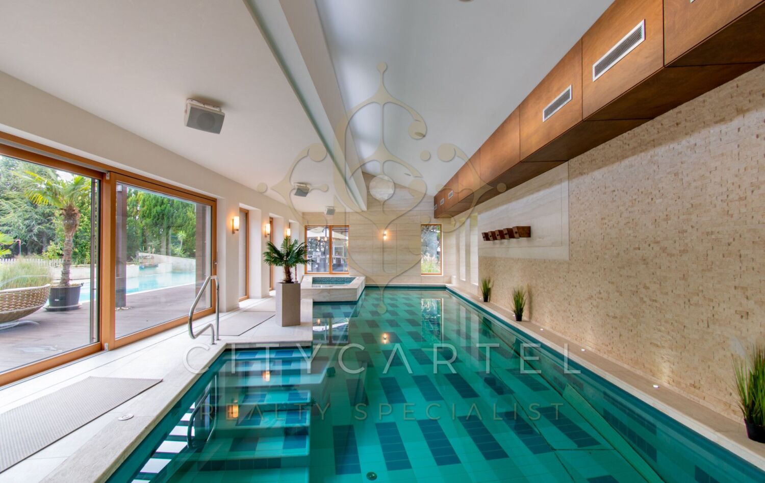 15 minutes from Budapest, in Telki, a minimal style, panoramic, exterior and interior swimming pool, 1000 sqm smart house for sale, built in 2012.