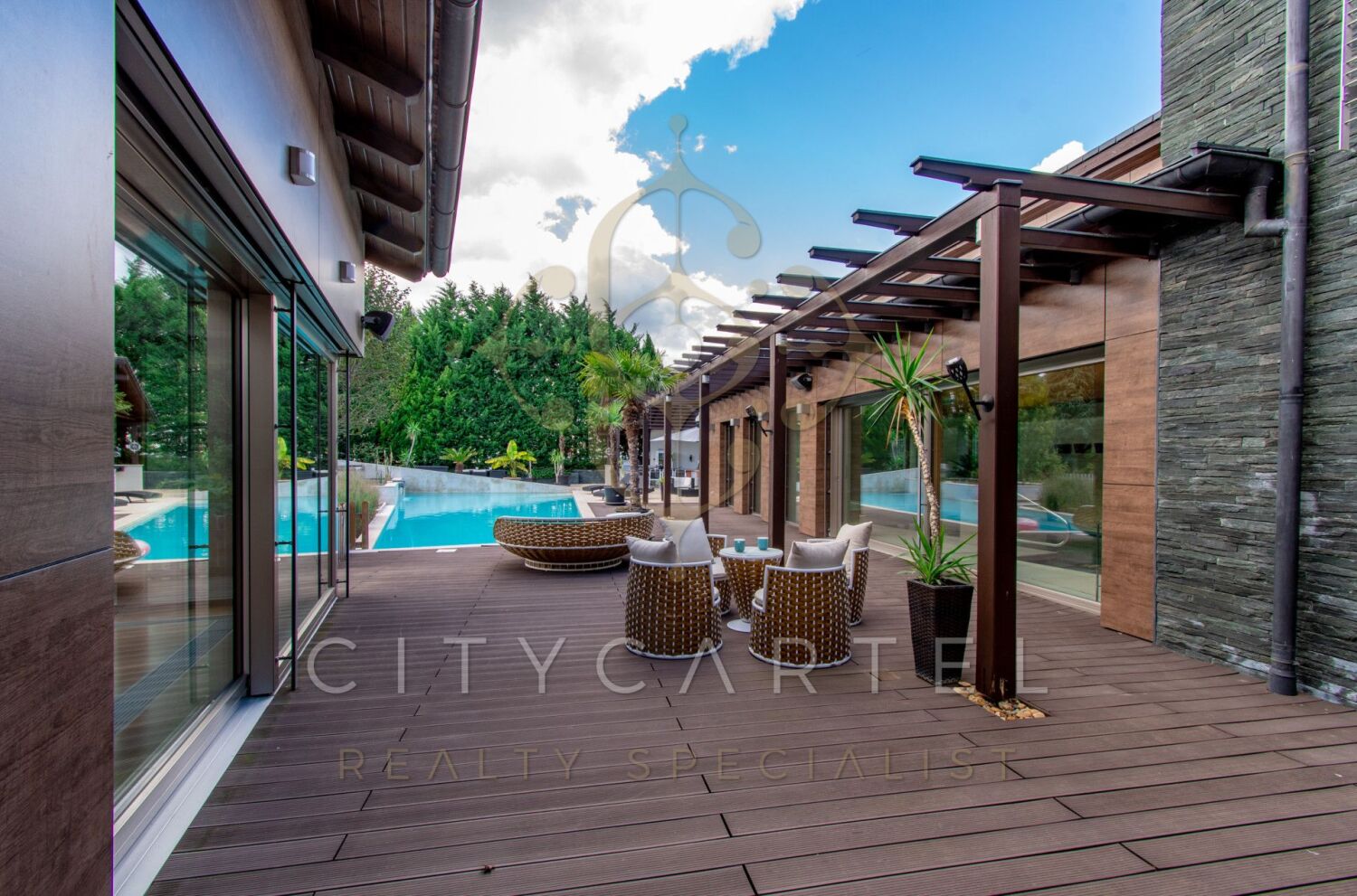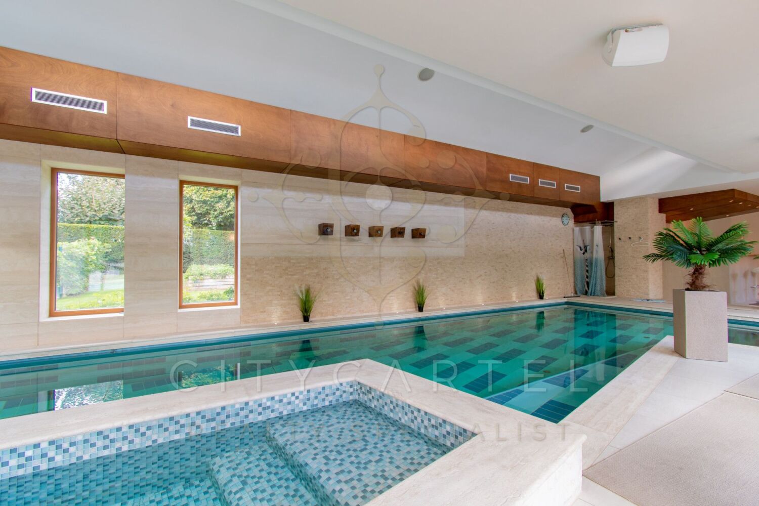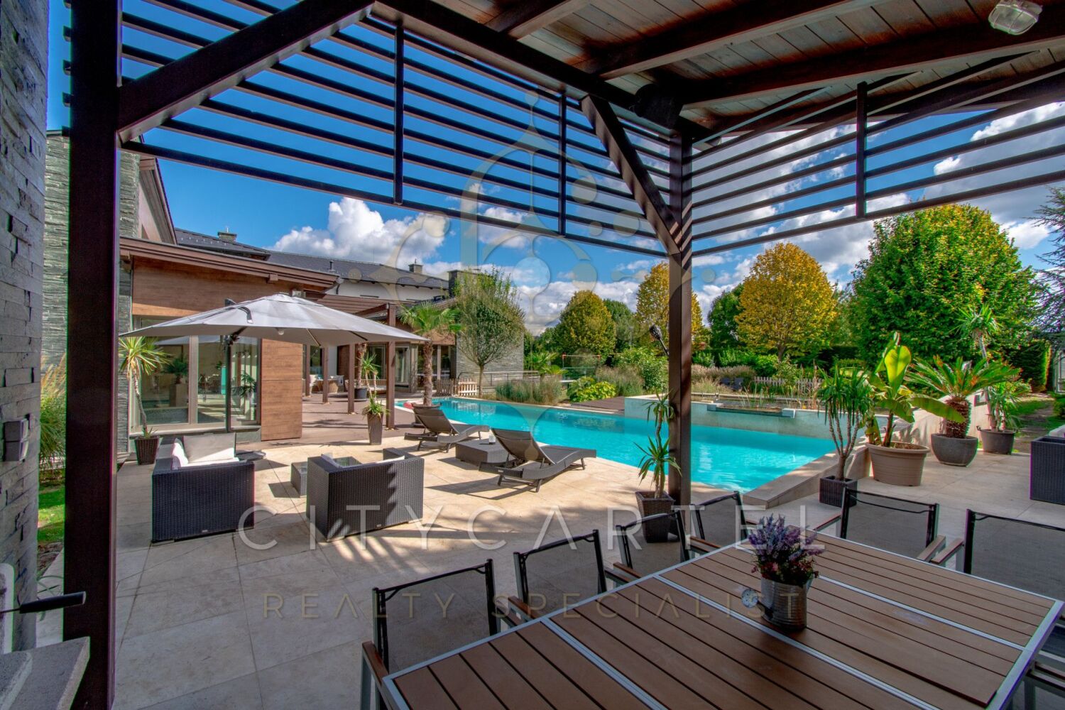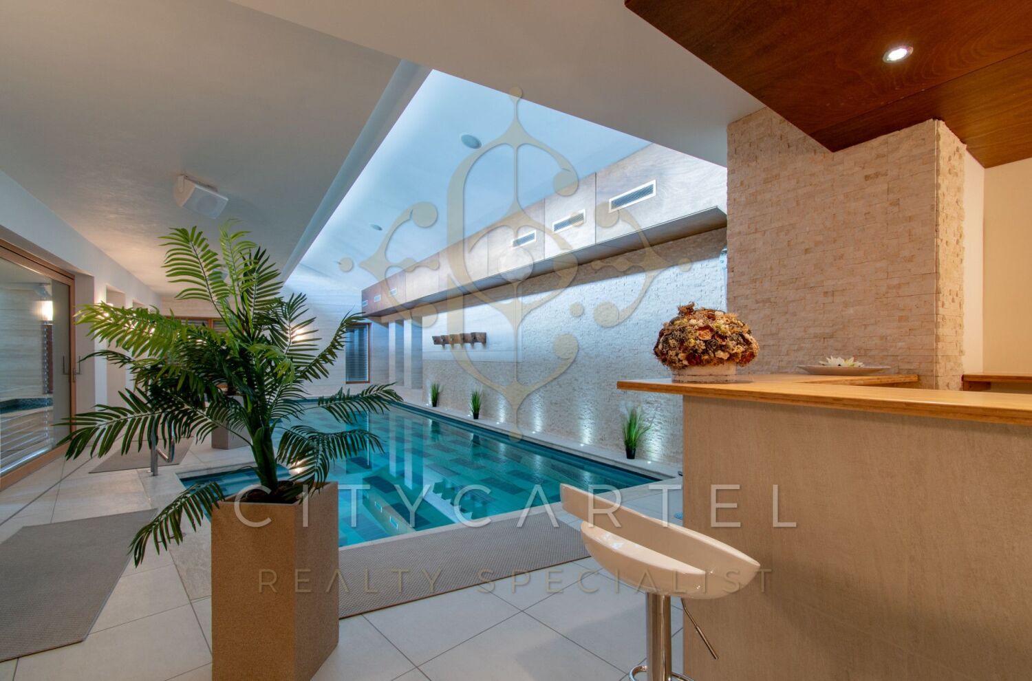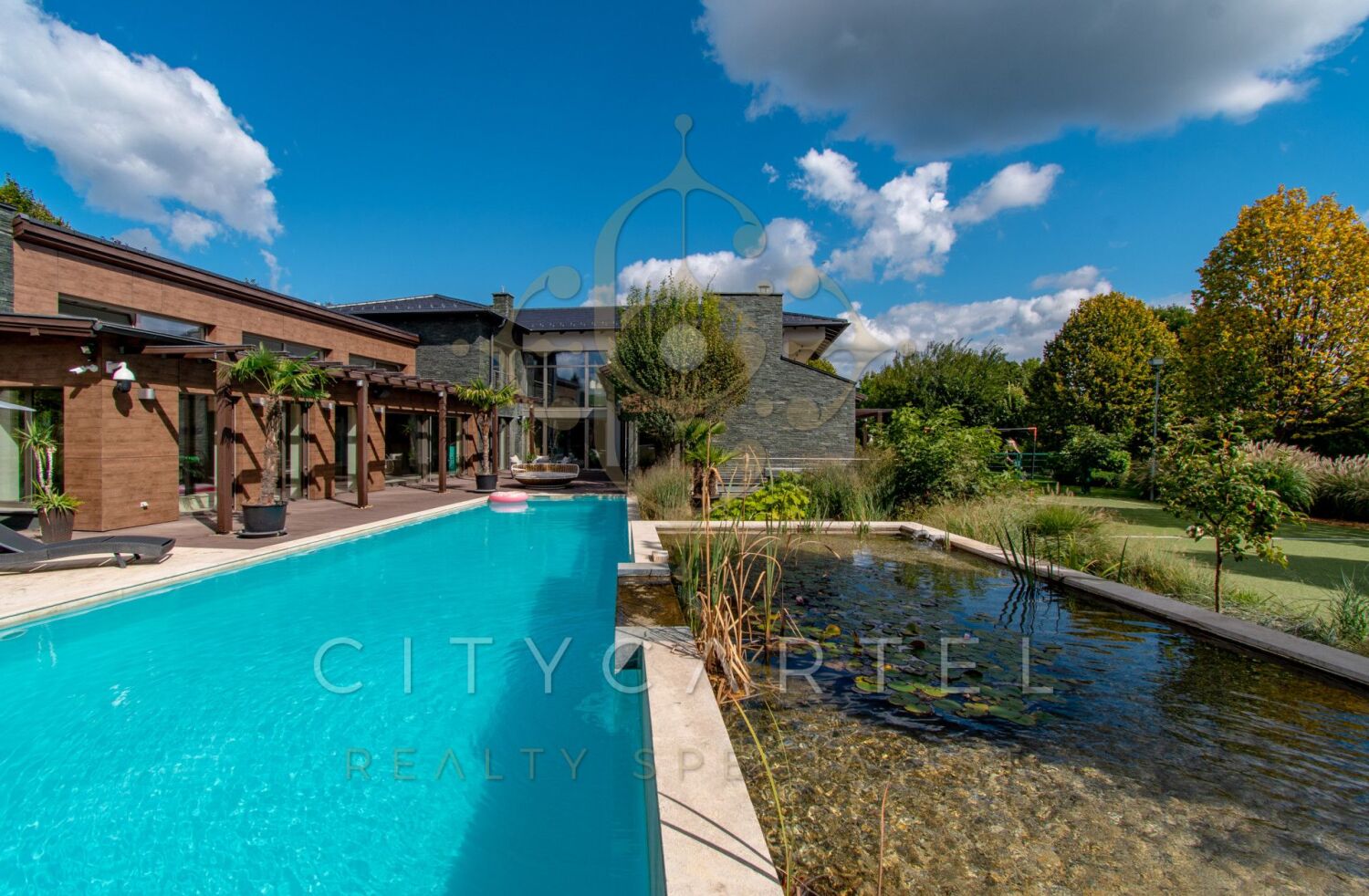 15 minutes from Budapest, in Telki, a minimal style, panoramic, exterior and interior swimming pool, 1000 sqm smart house for sale, built in 2012.