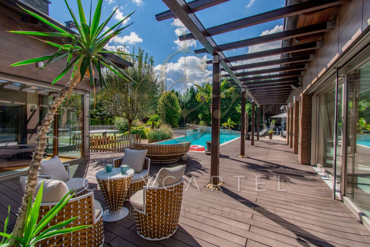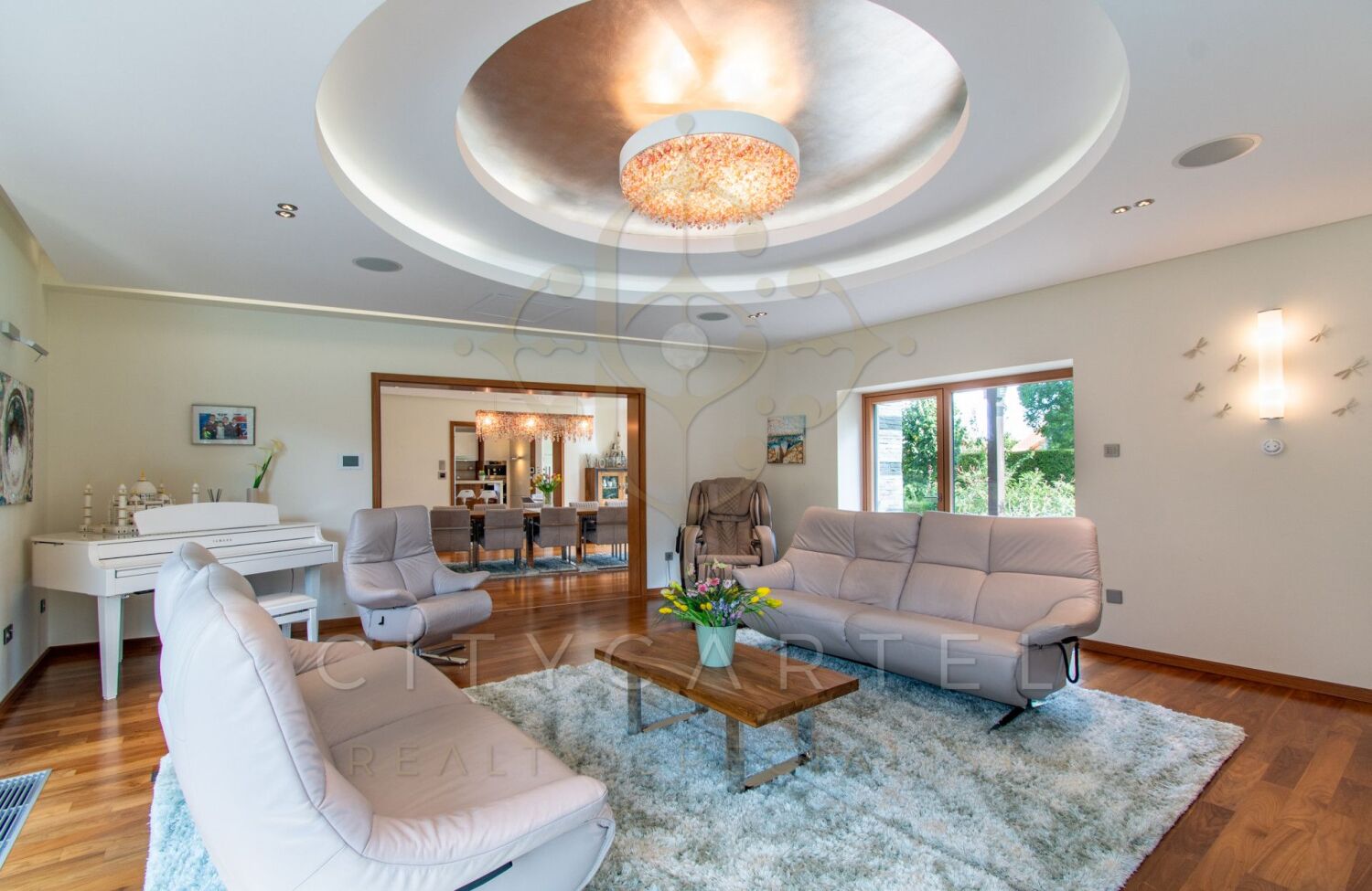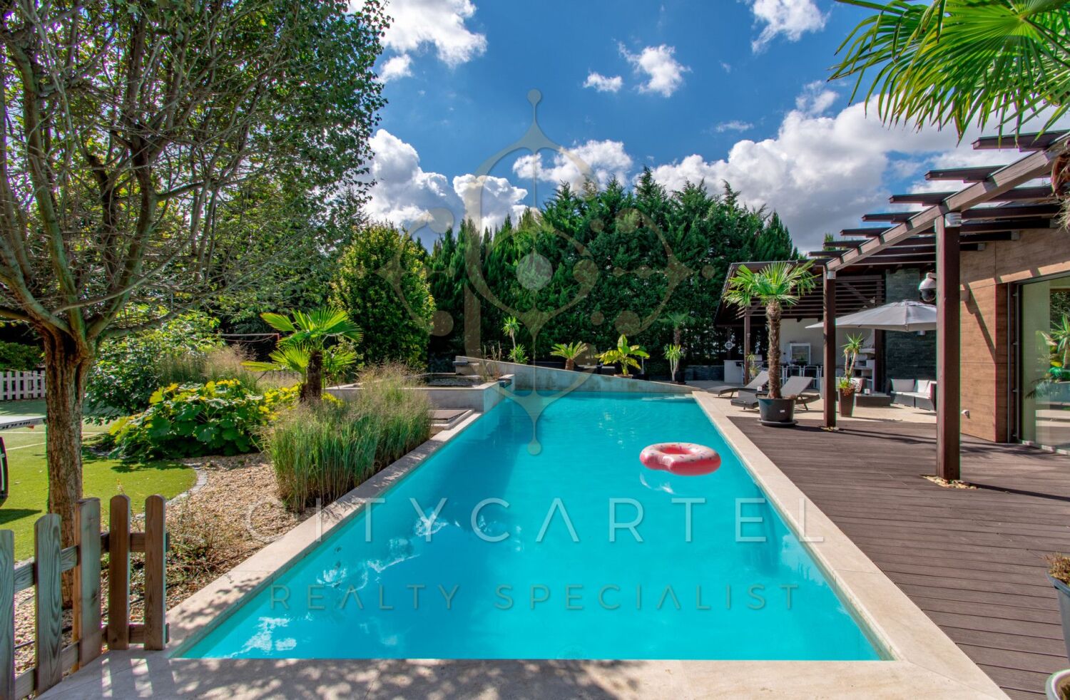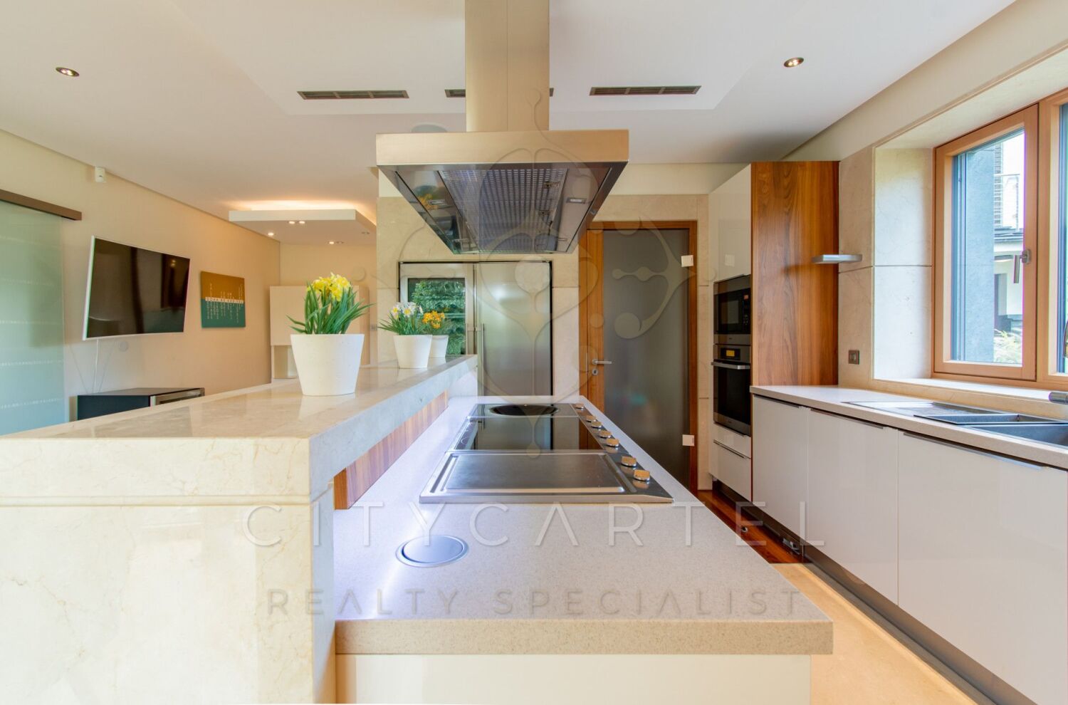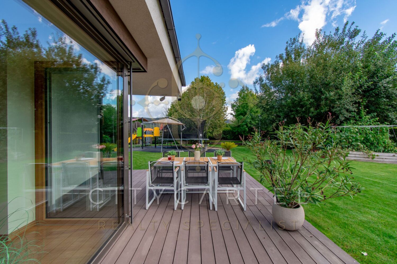 15 minutes from Budapest, in Telki, a minimal style, panoramic, exterior and interior swimming pool, 1000 sqm smart house for sale, built in 2012.