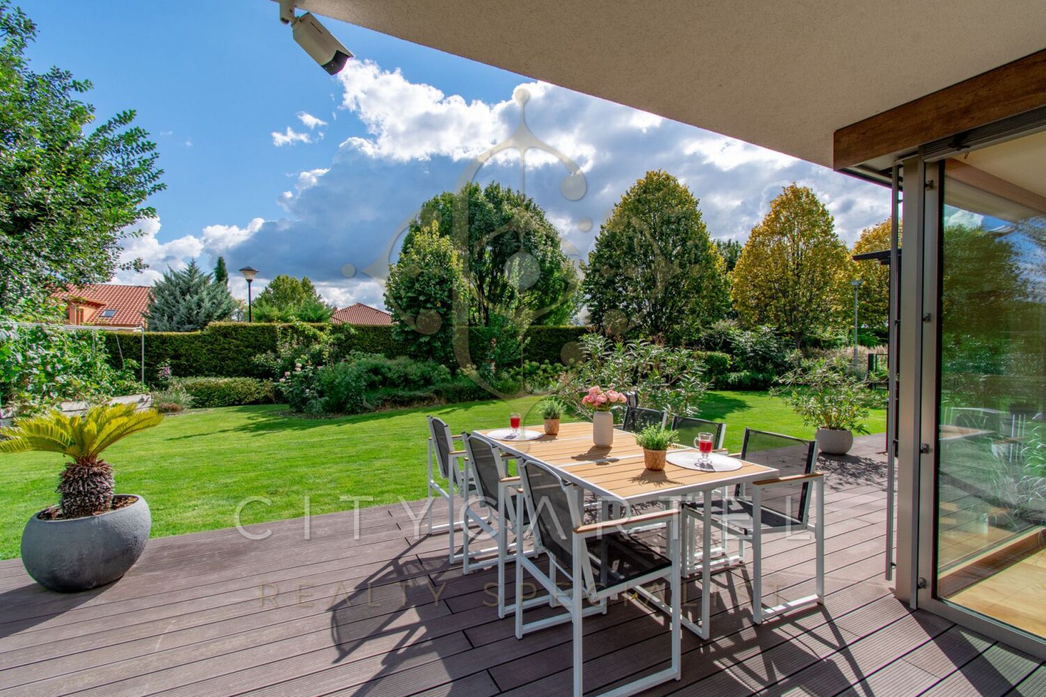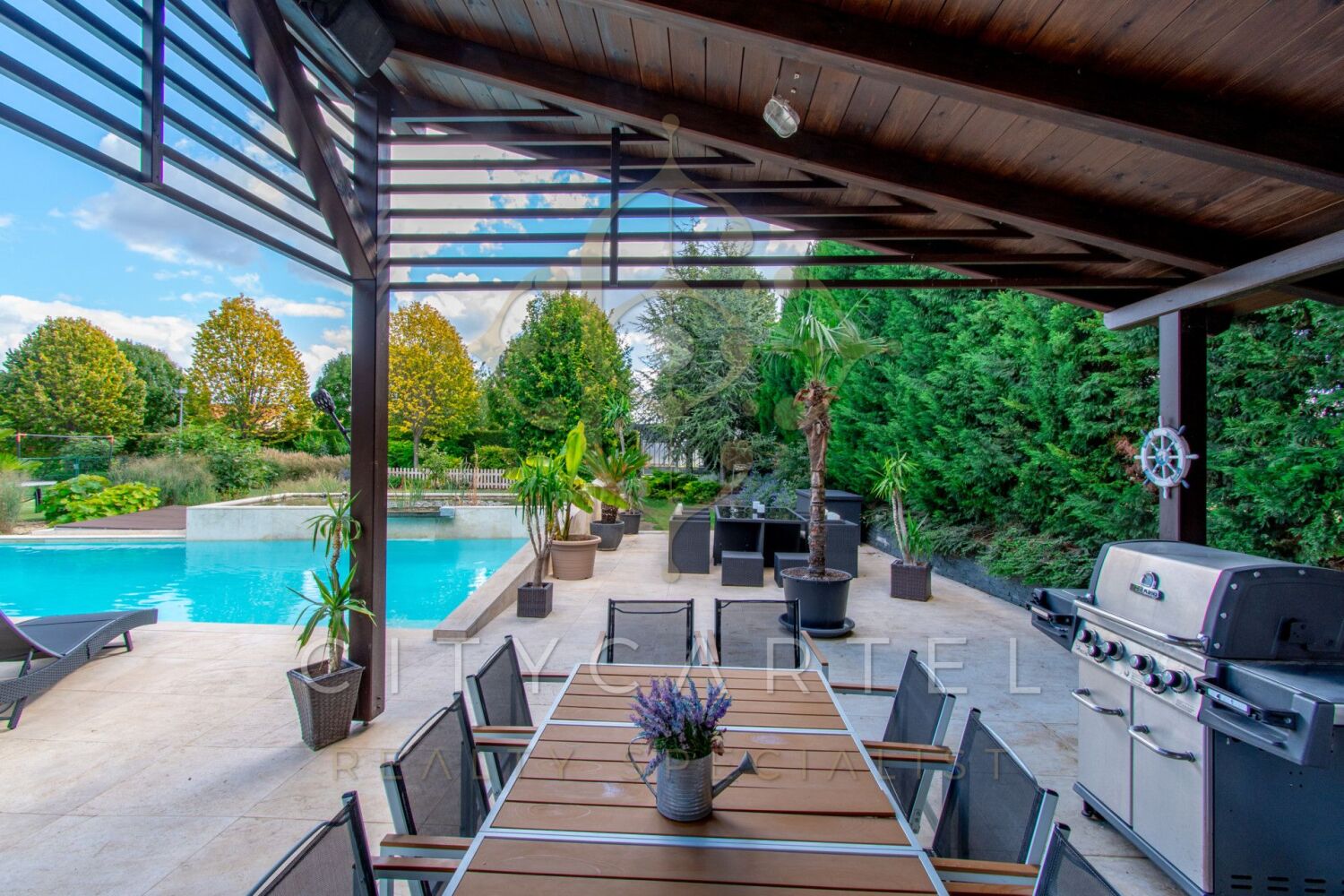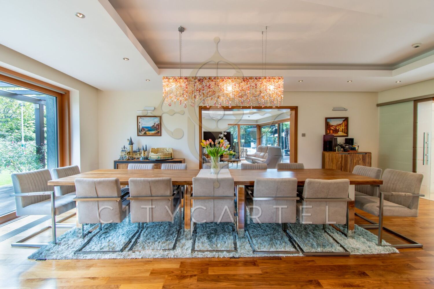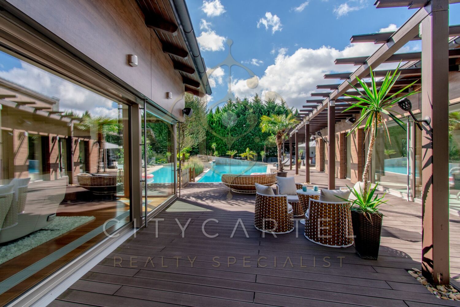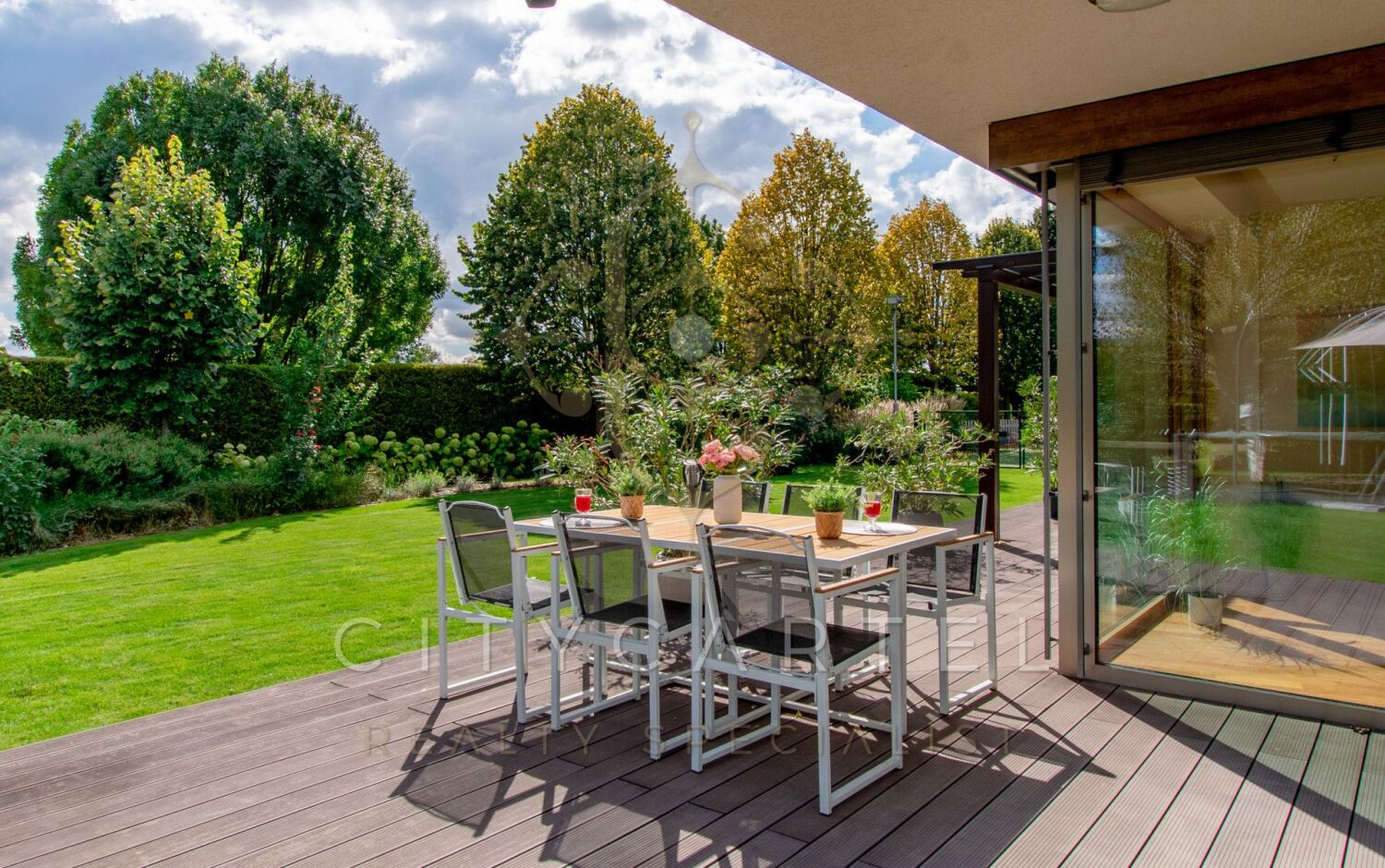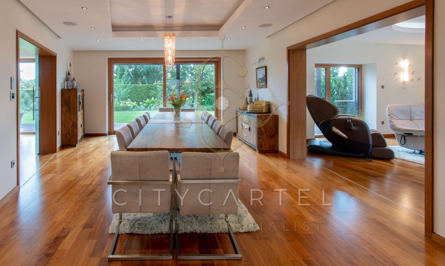 15 minutes from Budapest, in Telki, a minimal style, panoramic, exterior and interior swimming pool, 1000 sqm smart house for sale, built in 2012.