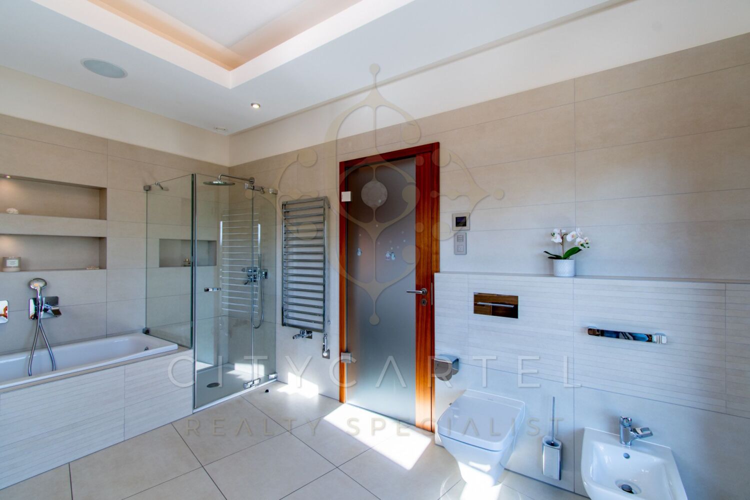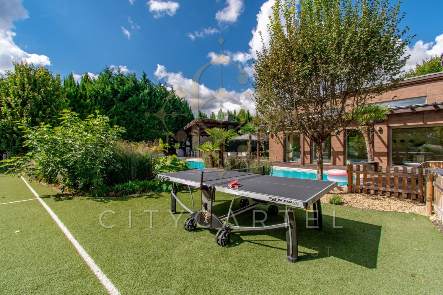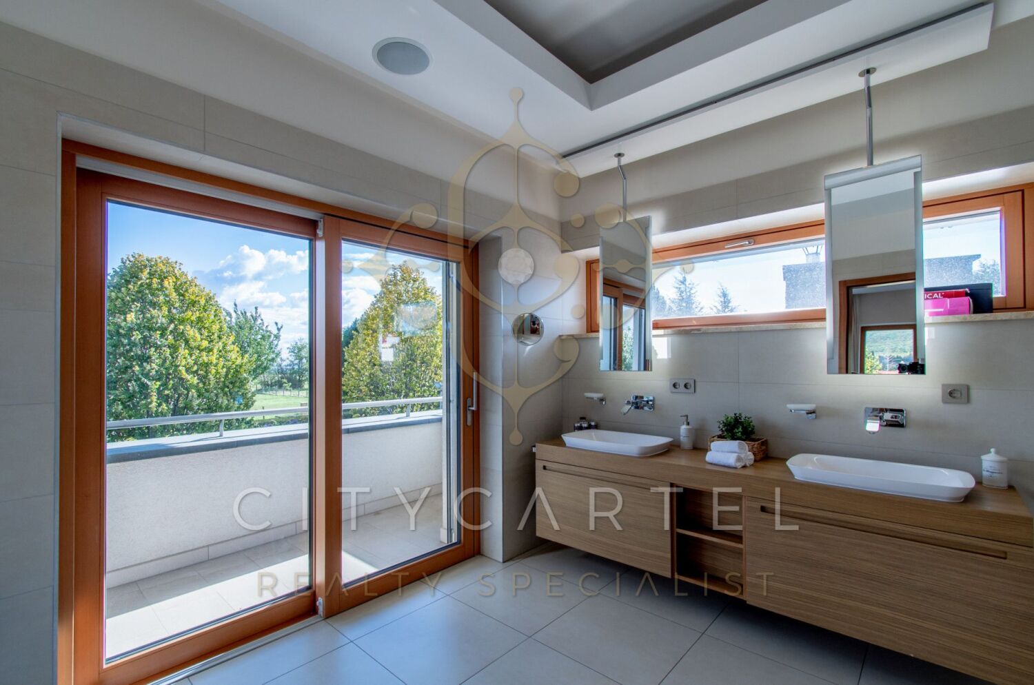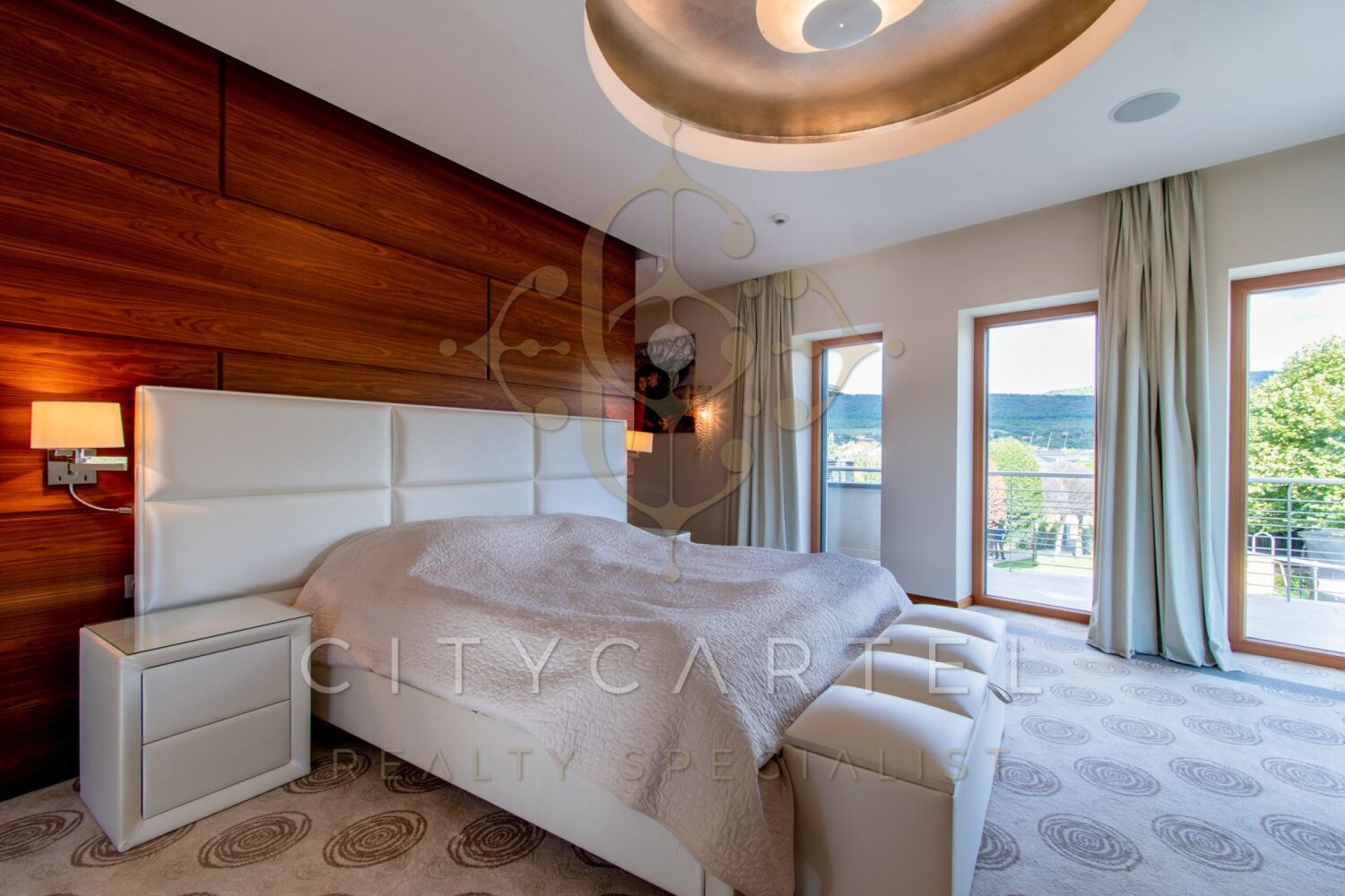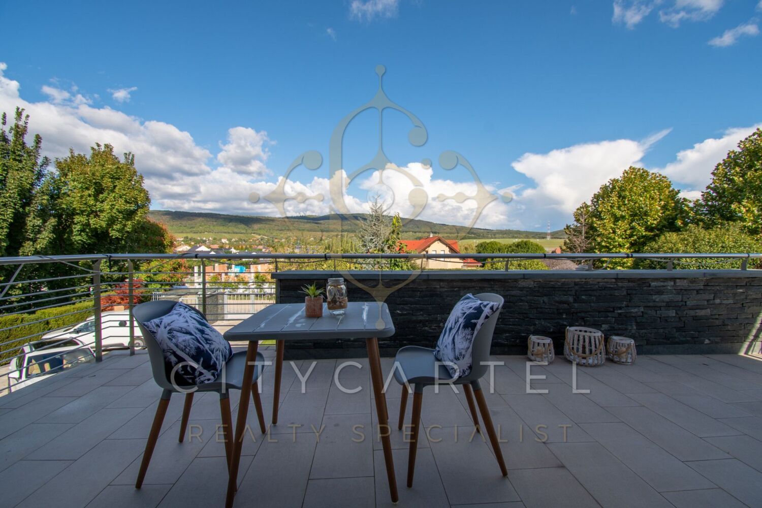 Budapesttől 15 percre, 2012-ben épült, minimál stílusú, panorámás, külső és belső úszómedencés, 1000 nm-es 8 hálószobás intelligens ház eladó.