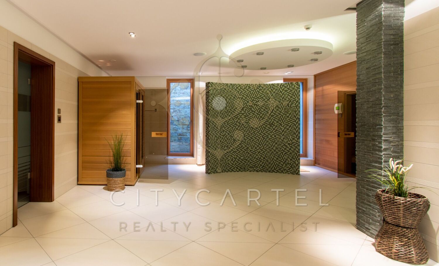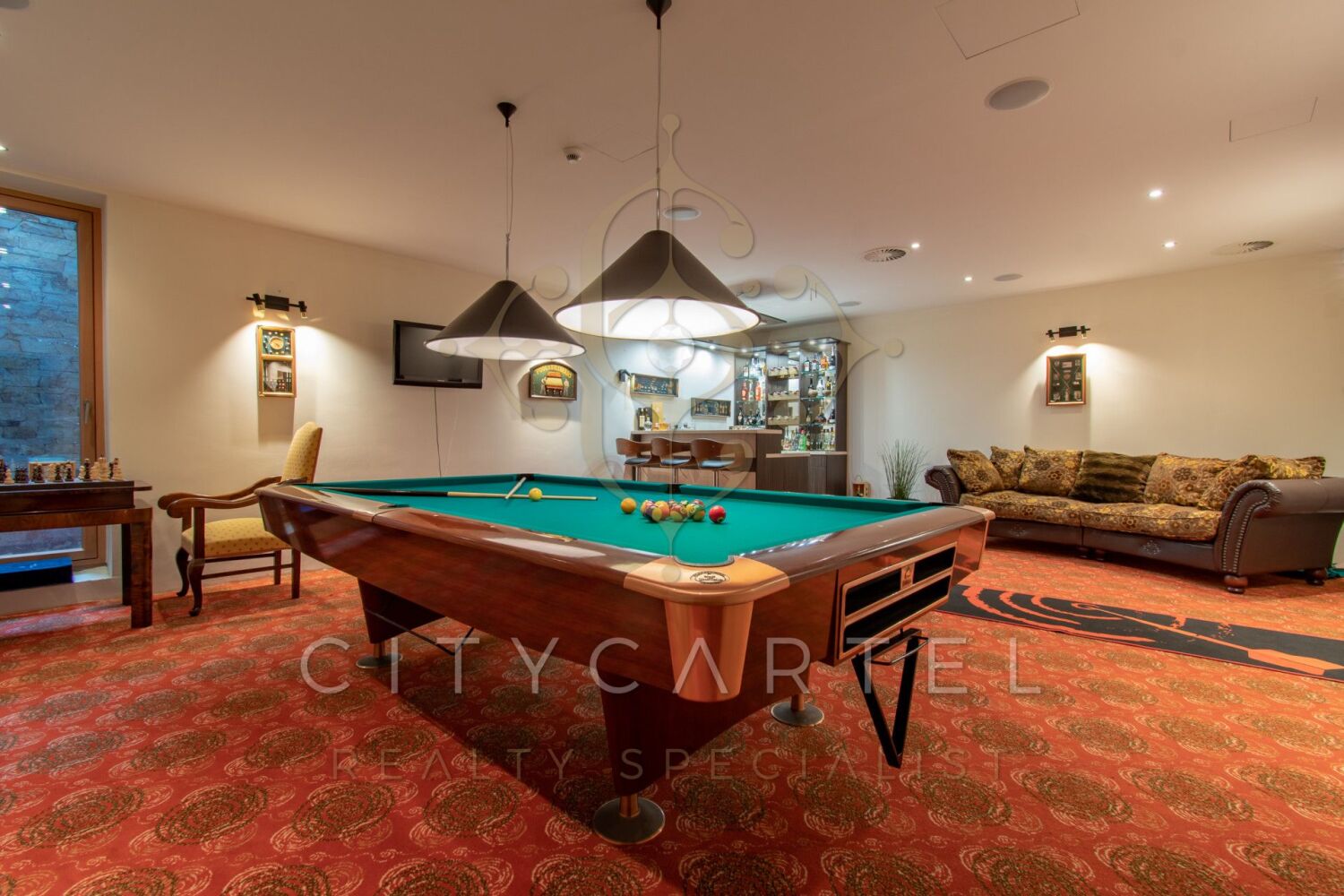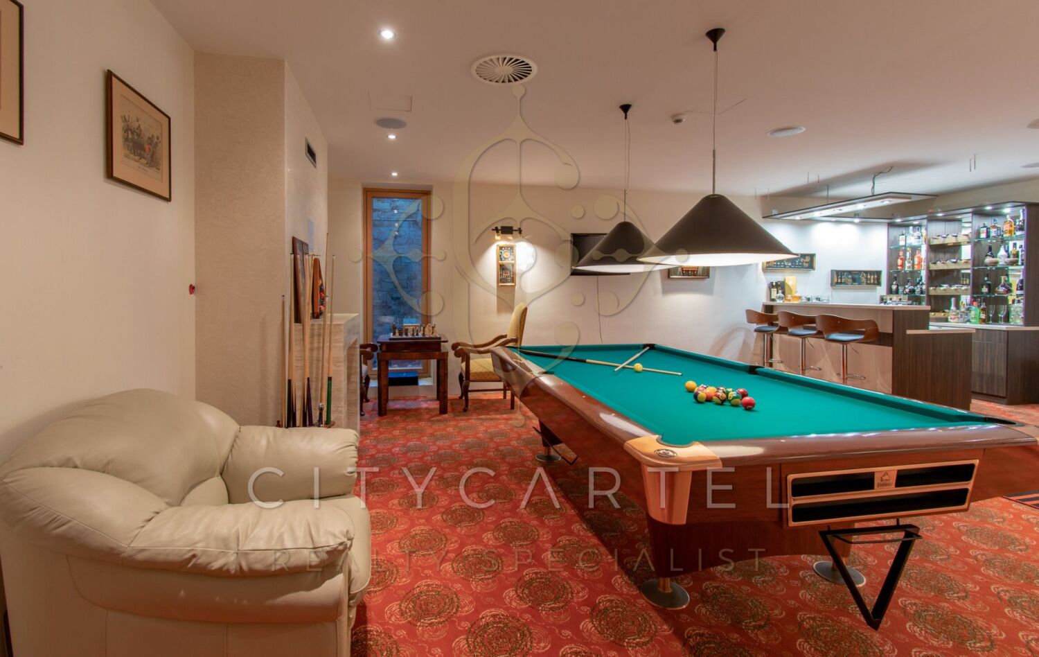 Wellness area: infrared sauna, Finnish sauna, light and aromatherapy steam cabin, relaxation room, fitness room, billiards room, wine cellar.