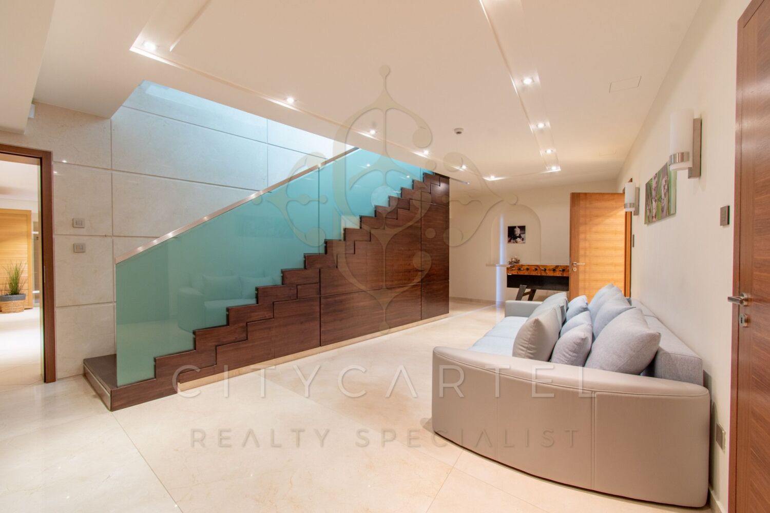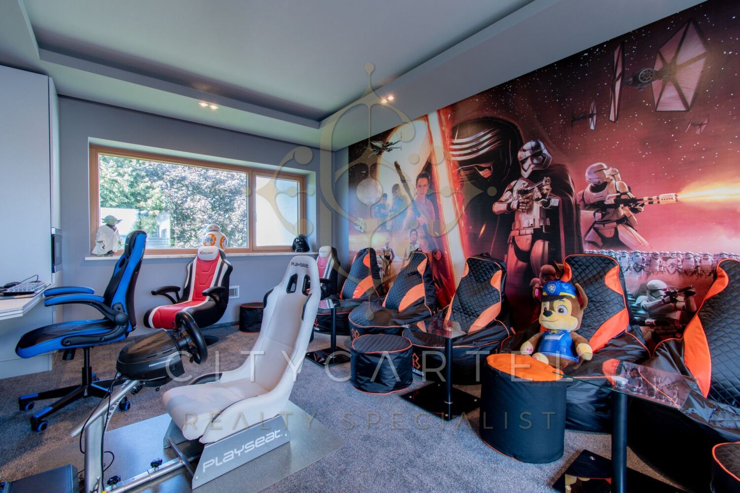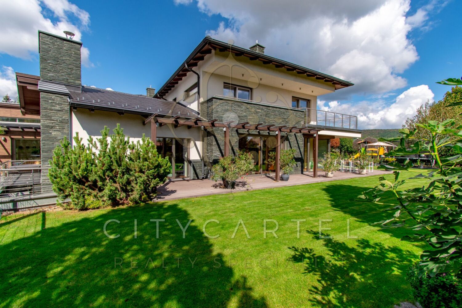 Földszint: tágas nappali kandallóval, étkező, konyha, hálószoba saját fürdőszobával és gardróbbal, dolgozószoba, fürdőszoba, 4 állásos garázs, úszómedence pezsgőfürdővel.