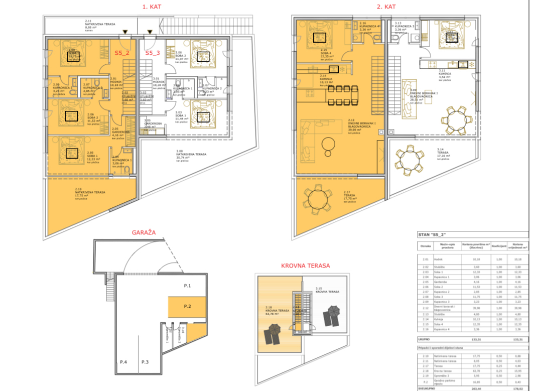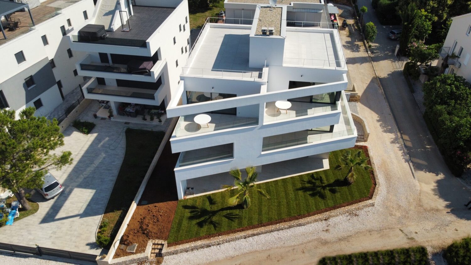Az apartmanon kívül egy tetőterasz fantasztikus kilátással a tengerre és a szigetekre, egy garázs parkolóhely és egy tároló. A 2-es lakás teljes hasznos területe 260 m2.