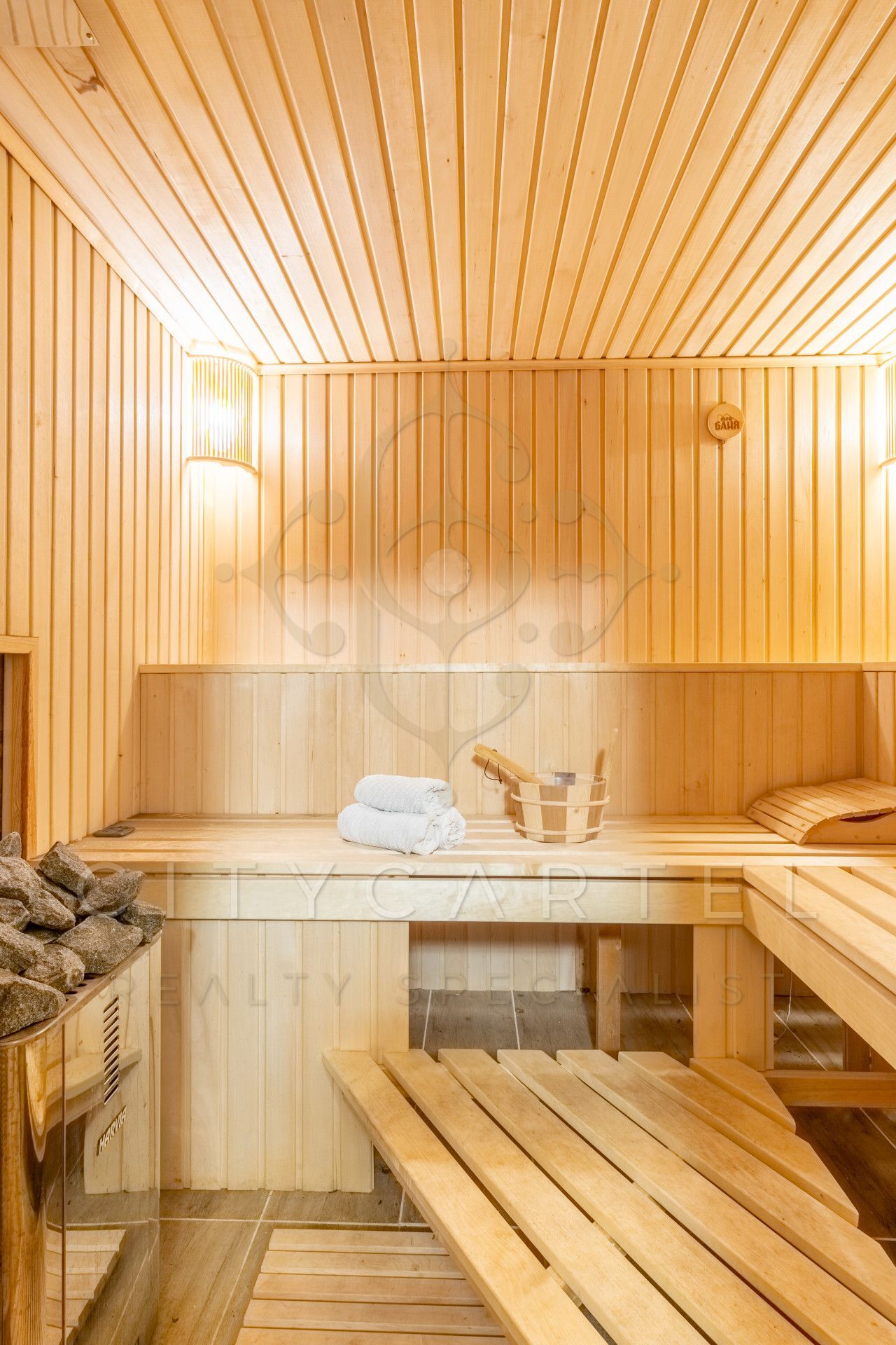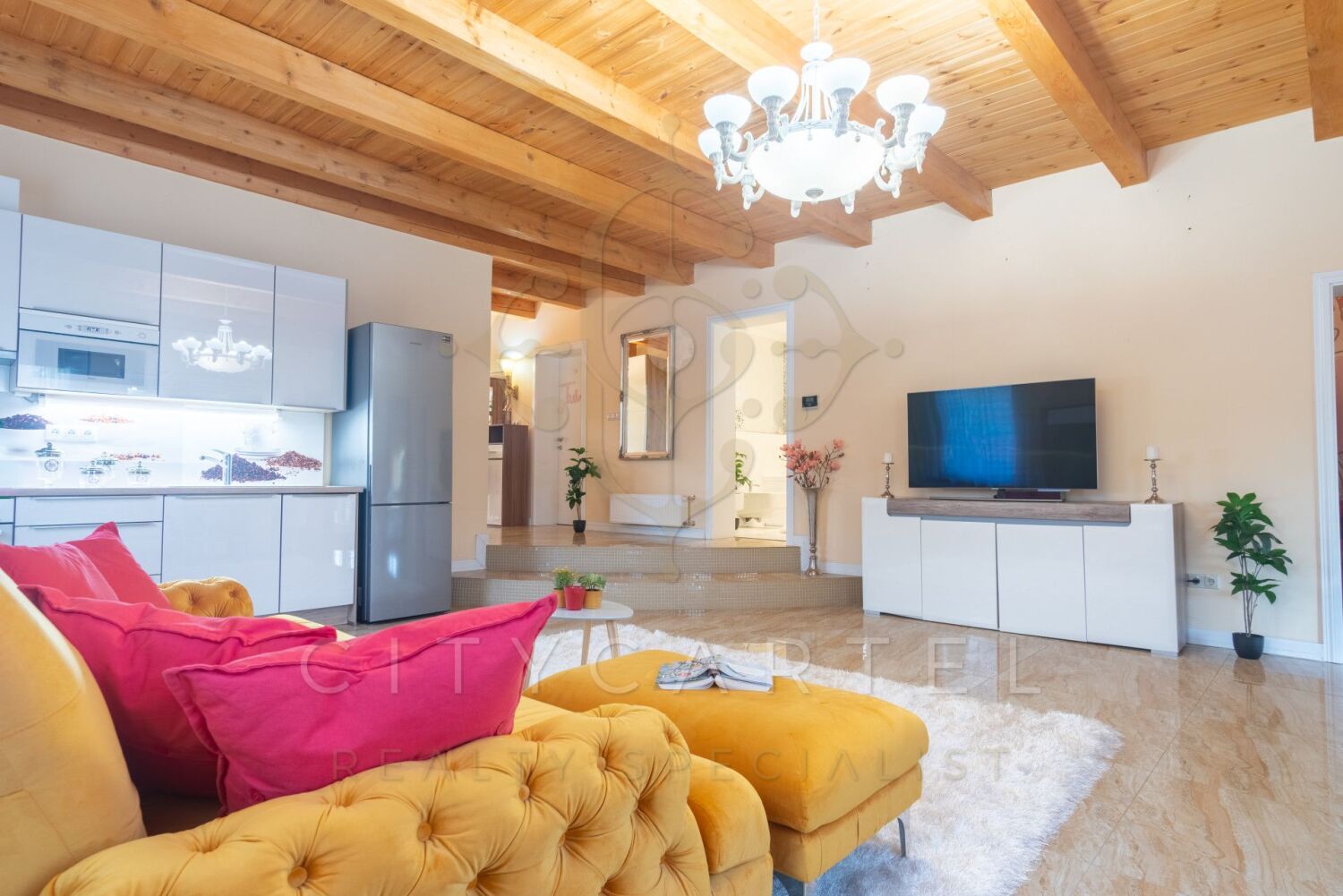 A nappali üveg ajtaja egy hatalmas, 60 nm-es fedett és egyik oldalról zárható teraszra nyílik, ahol lounge kerti bútorok, étkező asztal és teljes körű kinti sütésre és főzésre alkalmas berendezések várják a vendégeket.
