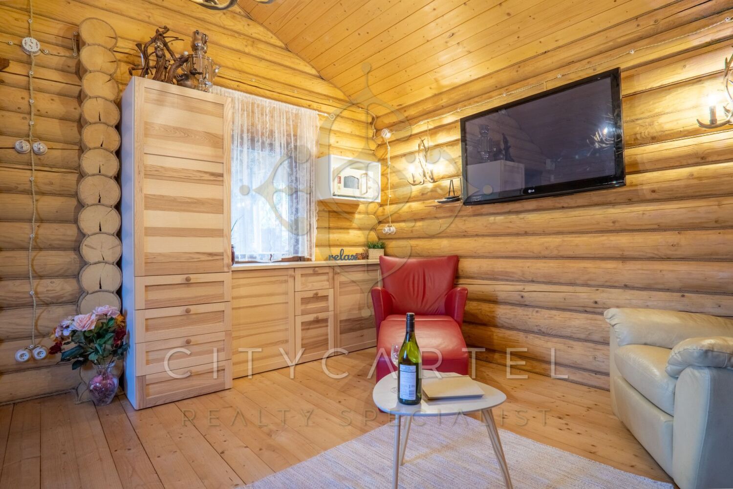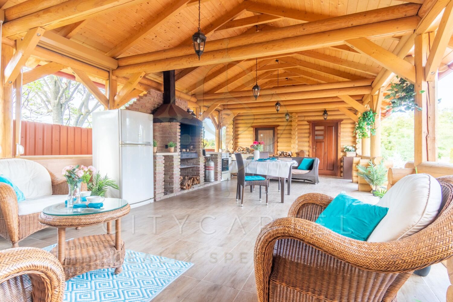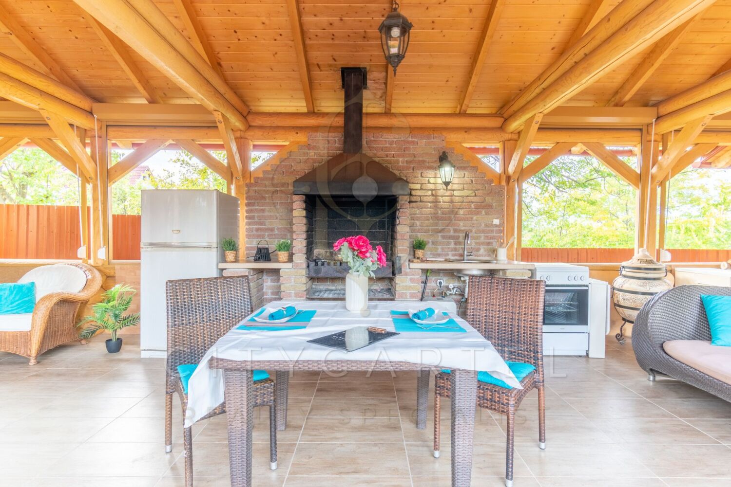 Sütögető, tűzhely és rengeteg tüzifa is elfér itt, a terasz folytatásában ugyanis egy alpesi hangulatot árasztó gyönyörű faház található, ami teljesen külön lakrész, akár több generáció összeköltözését is lehetővé teszi.