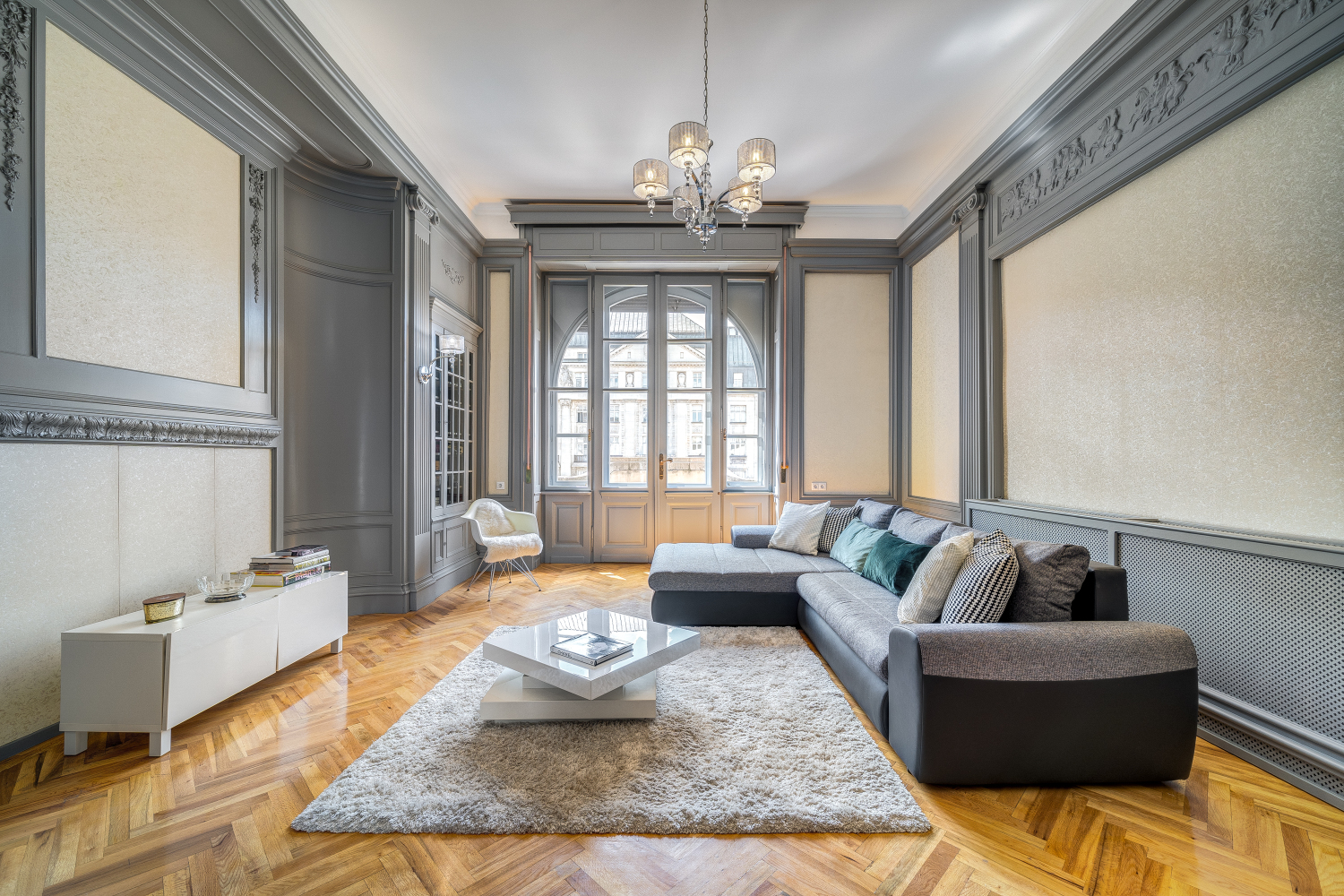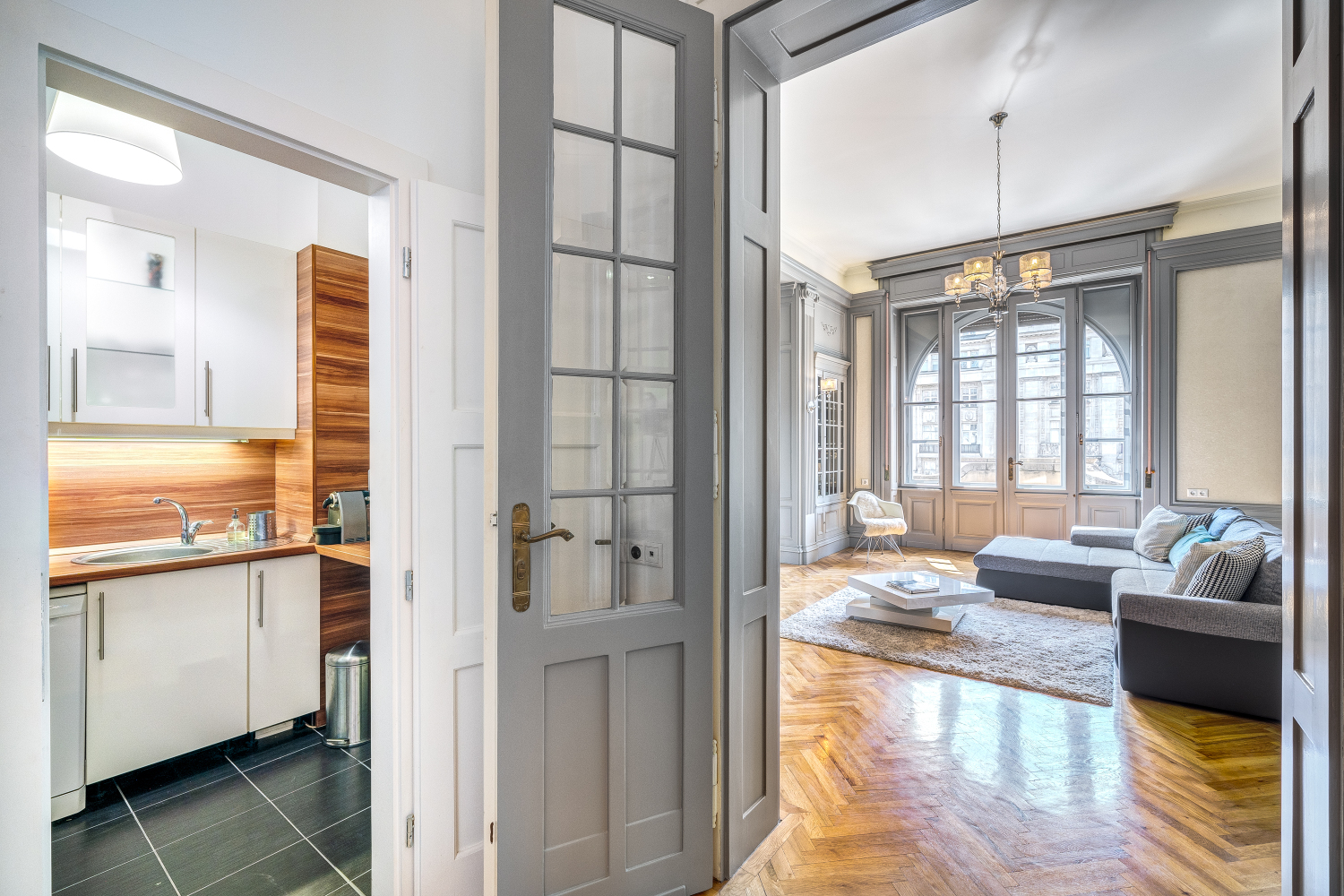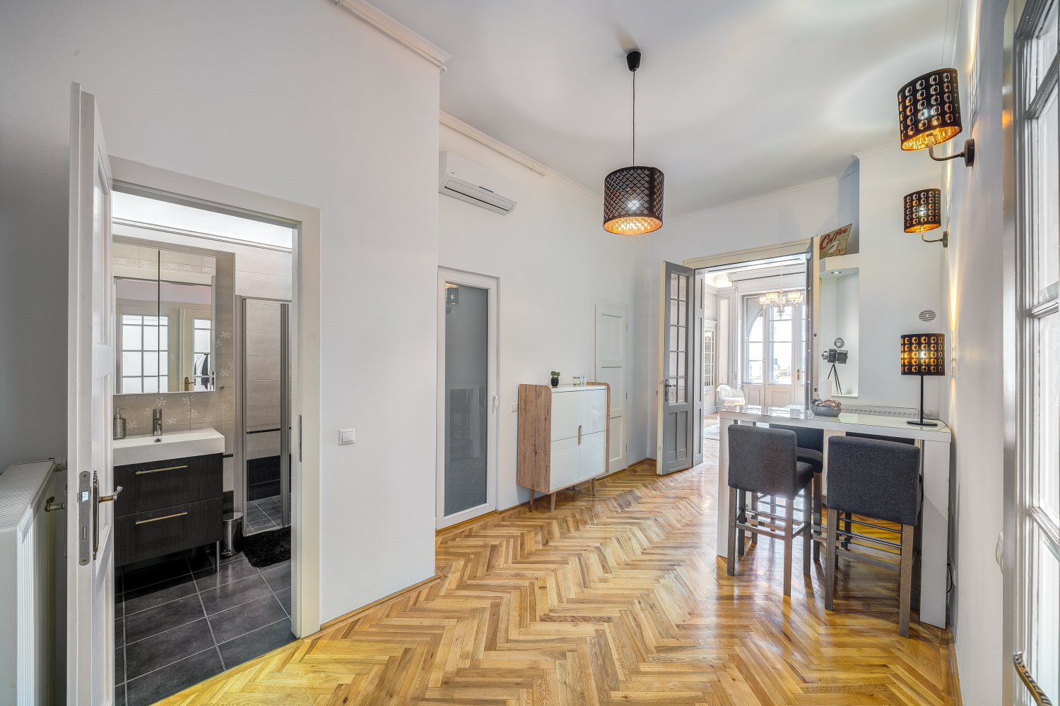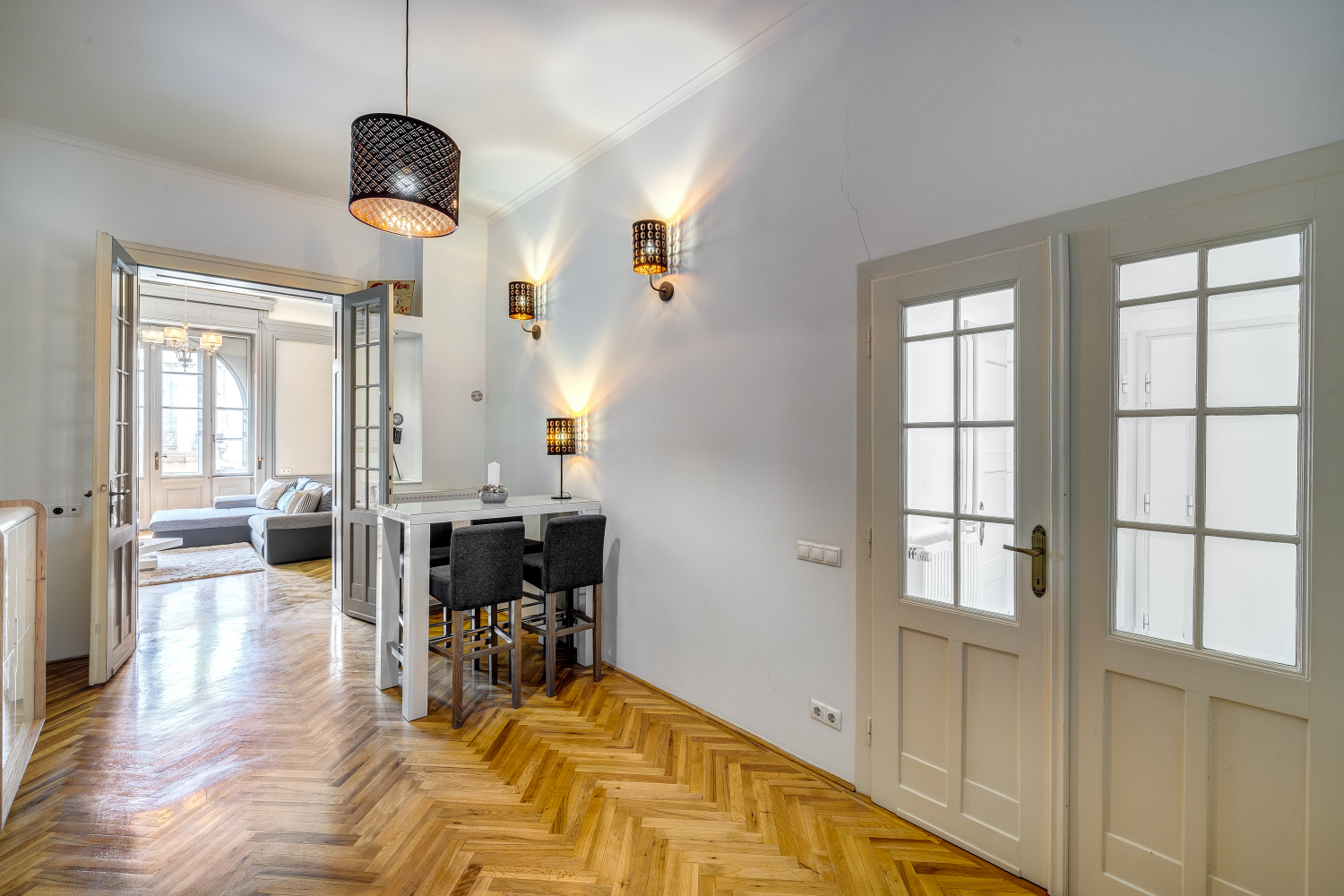In the neighborhood of Vörösmarty sqaure and Budapest's eye, 70 sqm one-bedroom, one-bathroom apartment with a balcony and original elements from the last century.