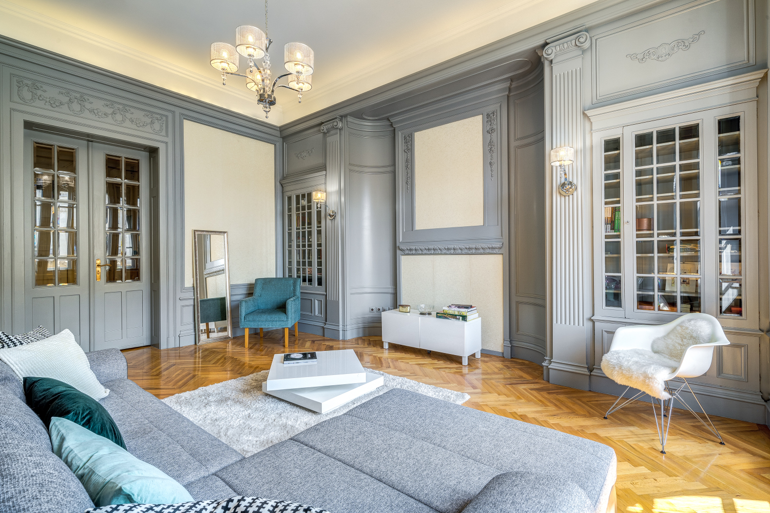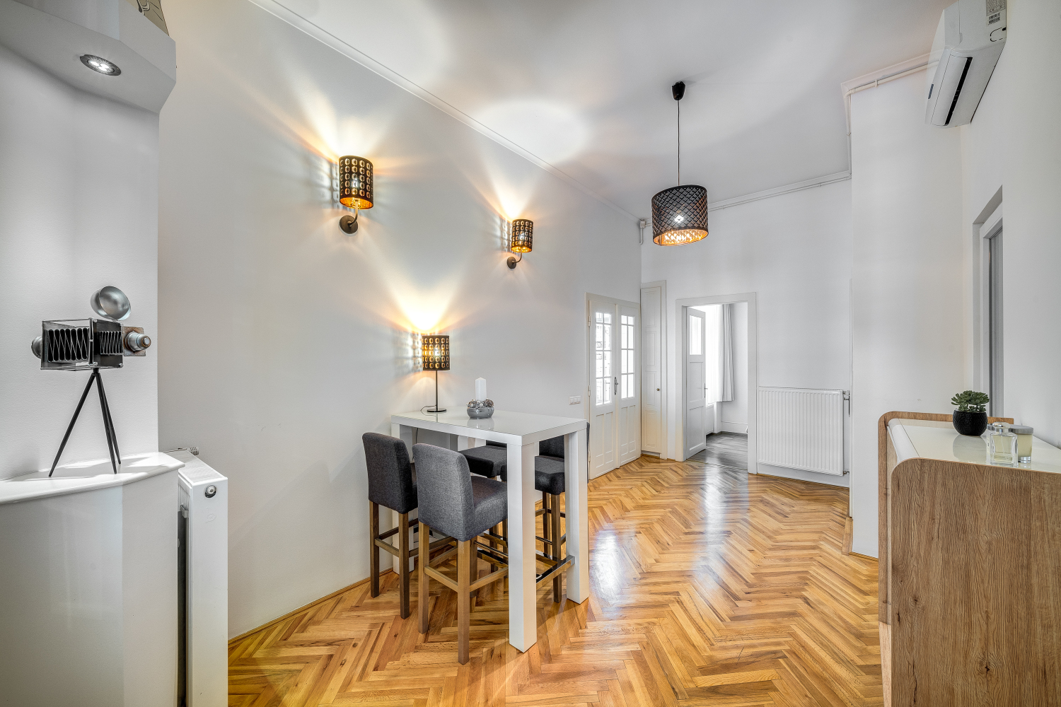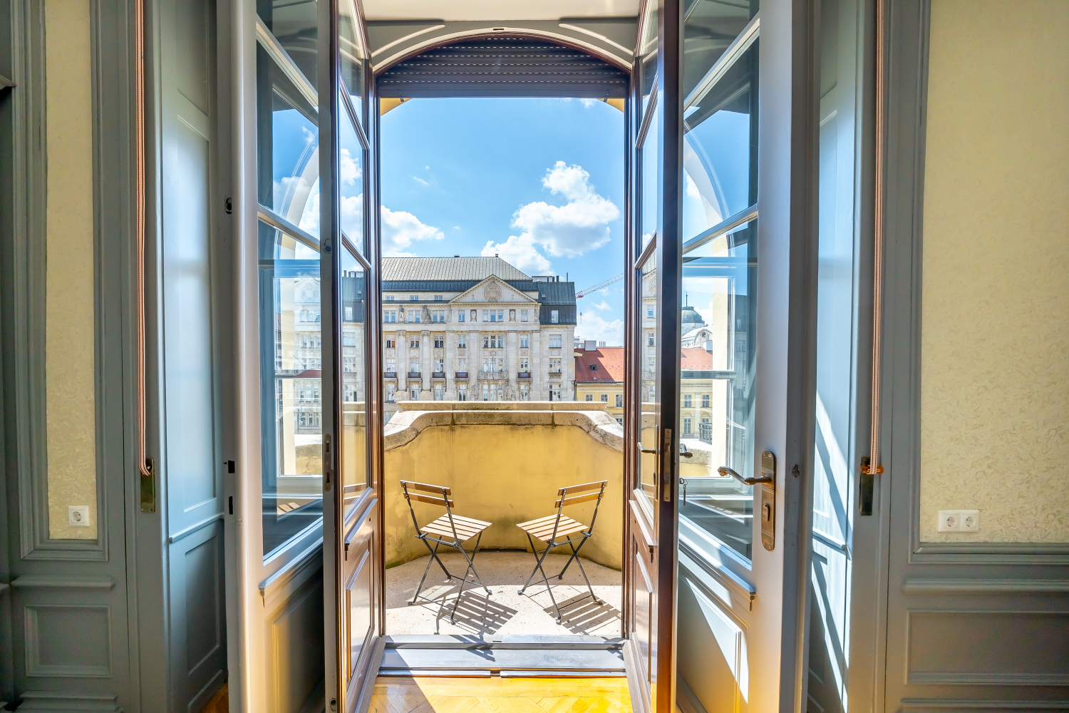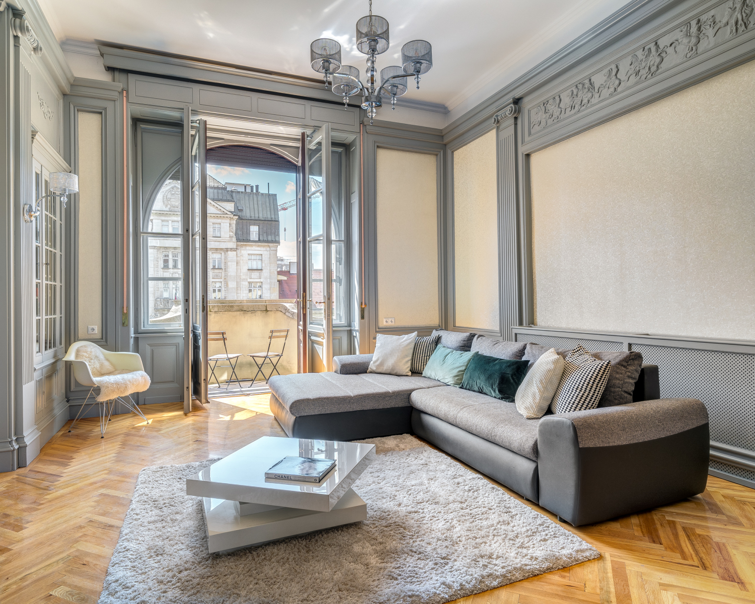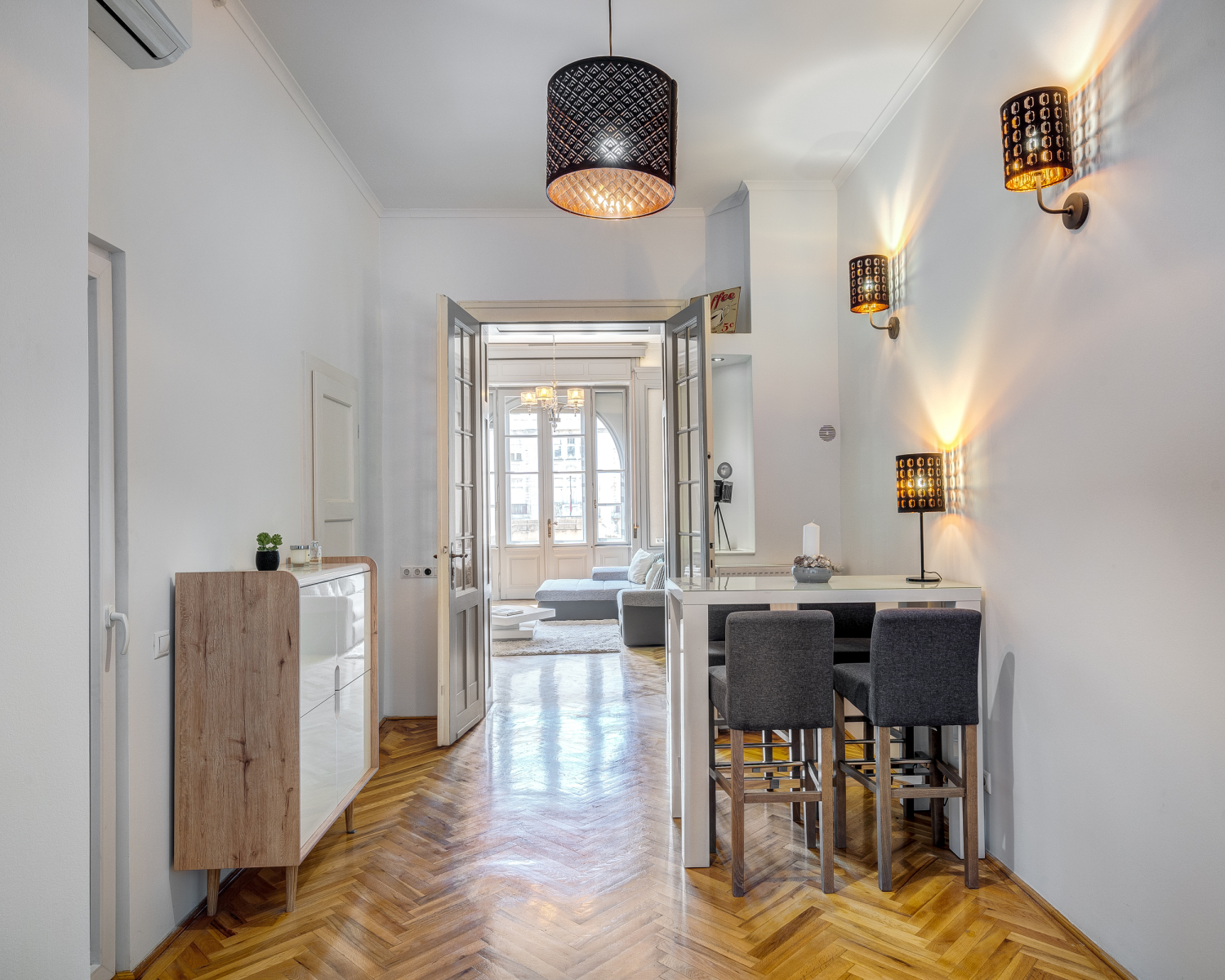 In the neighborhood of Vörösmarty sqaure and Budapest's eye, 70 sqm one-bedroom, one-bathroom apartment with a balcony and original elements from the last century.