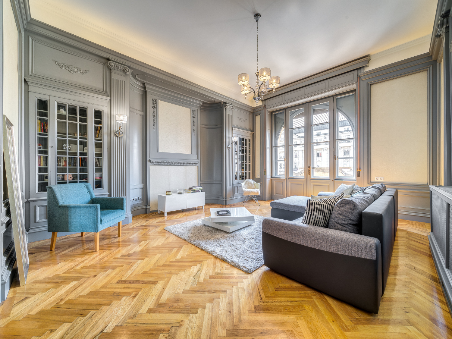 Vörösmarty tér és Budapest Óriáskereke szomszédságában egy hálós, egy fürdős erkélyes, nagypolgári lakás eredeti elemekkel még a múlt századból.