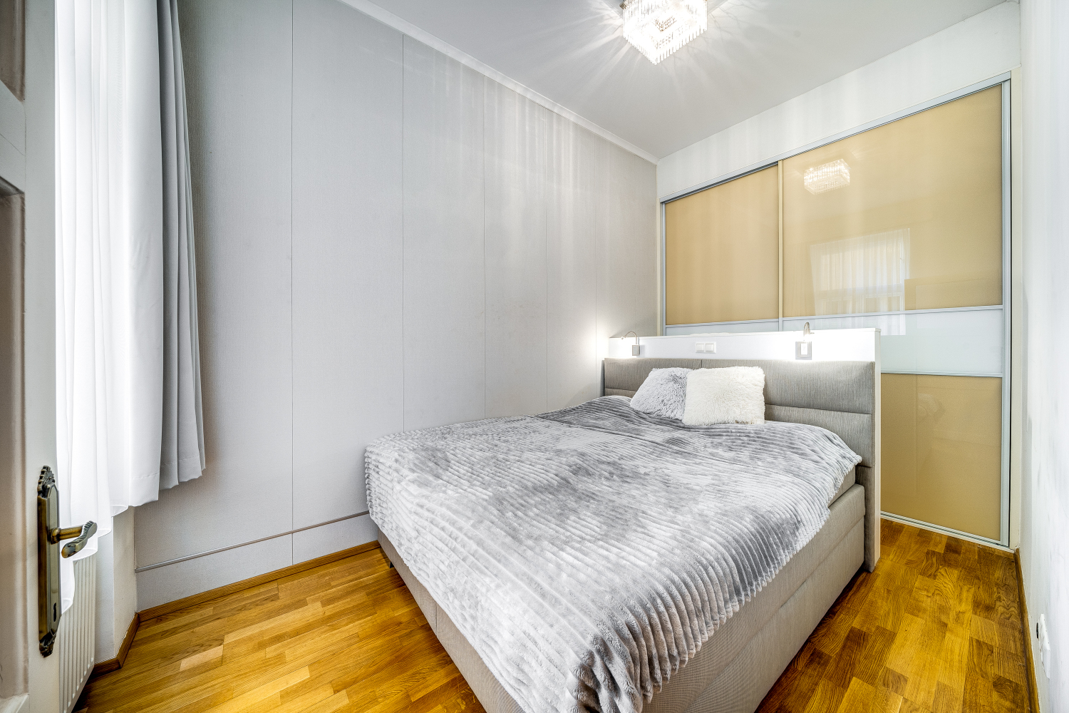 Nyugati fekvésű lakás rendkívül napfényes, nagy erkélyes ajtajának köszönhetően ami egy gyönyörű zöld térre néz. Egy hálószoba kapott helyett a 70 nm-es ingatlanban így rendkívül tágas. Nagy méretű előszoba, gépesített konyha, tágas étkező helyiség, épített zuhany, erkélyes nappali és udvarra néző hálószoba. Riasztó, legkondi a lakás felszereltsége közé tartozik.