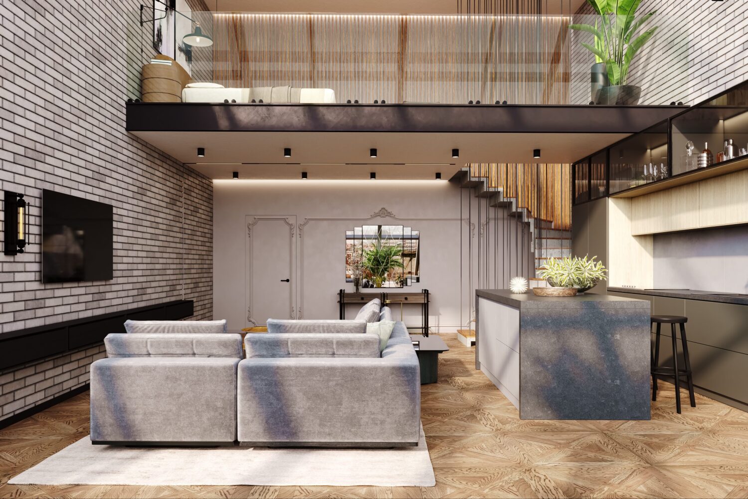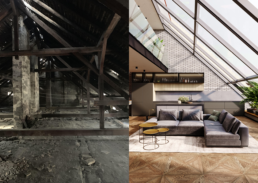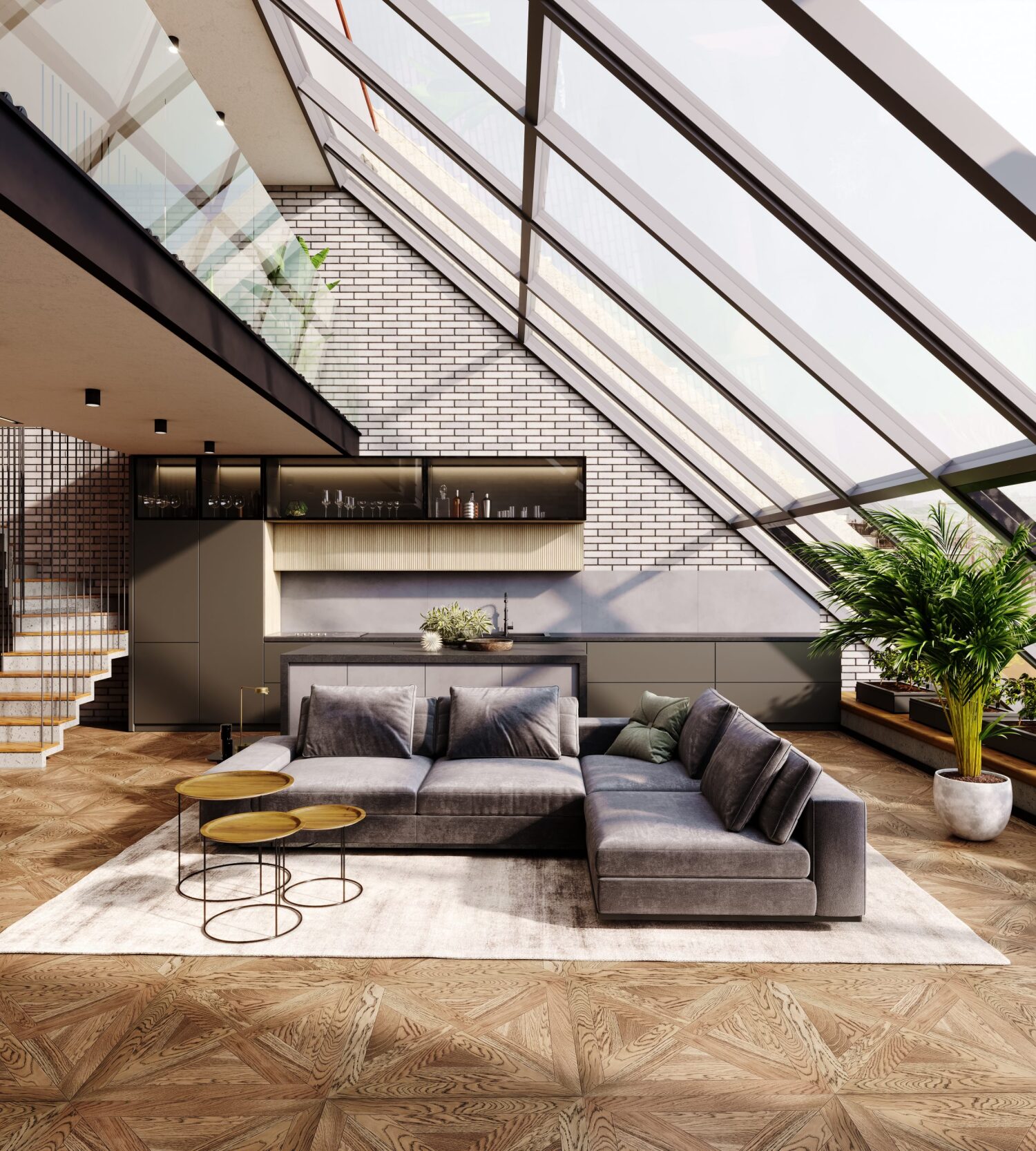 a lakások térérzetét a nagy belmagasságon kívül egy, a komplett tetősíkon végigfutó üvegtető teszi majd igazán különlegessé!