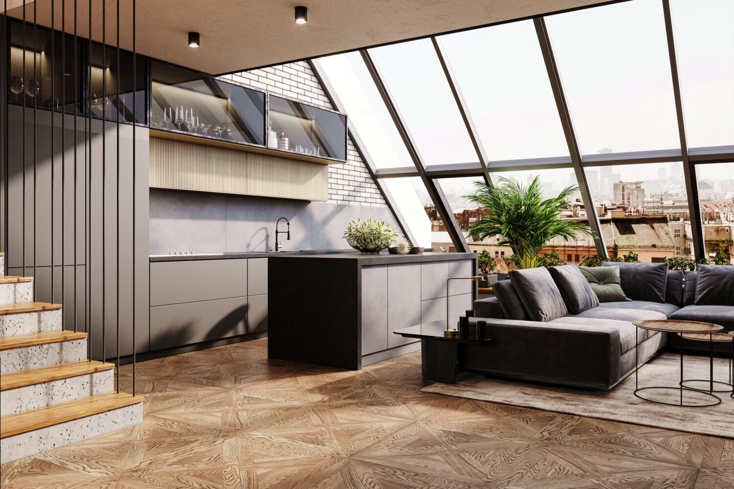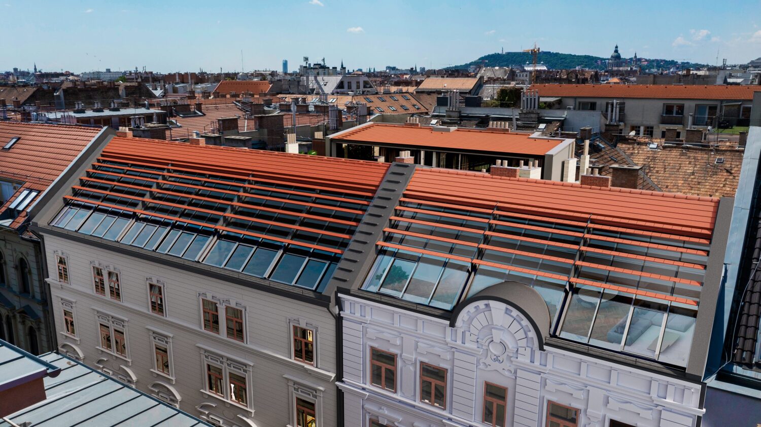 A lakások térérzetét a nagy belmagasságon kívül egy, a komplett tetősíkon végigfutó üvegtető teszi majd igazán különlegessé!