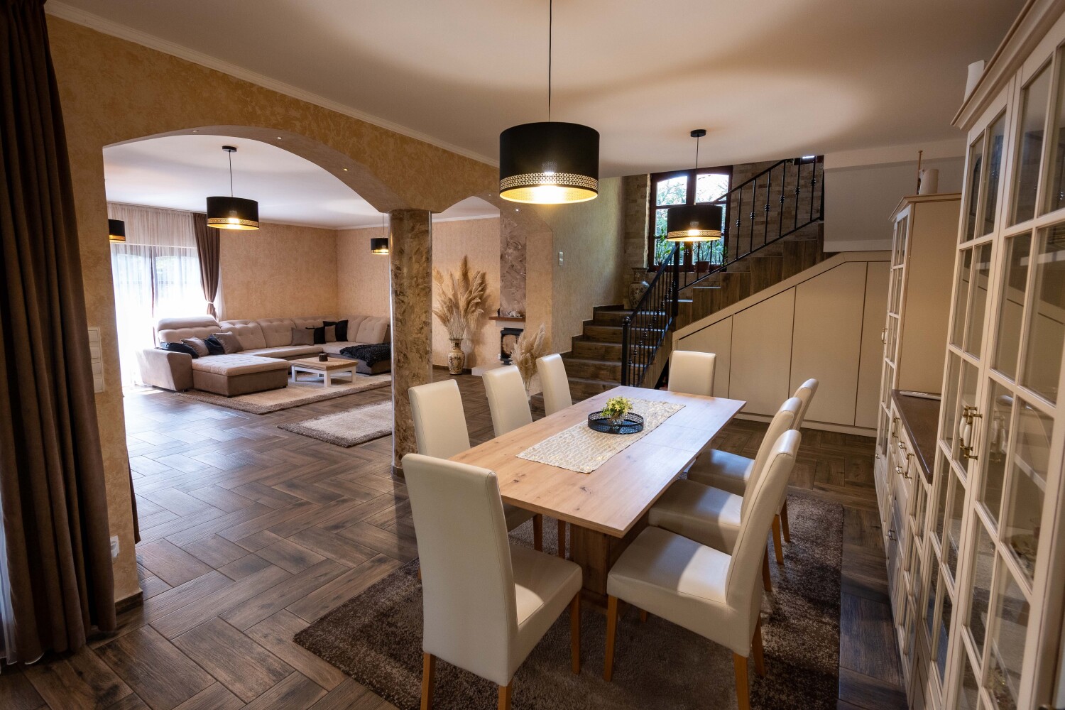 A házban külön kazánház és gépészeti helység, hővédő üvegezésű nyílászárók, egyedi kivitelezésű ajtók, 10 cm szigetelésű falazat.