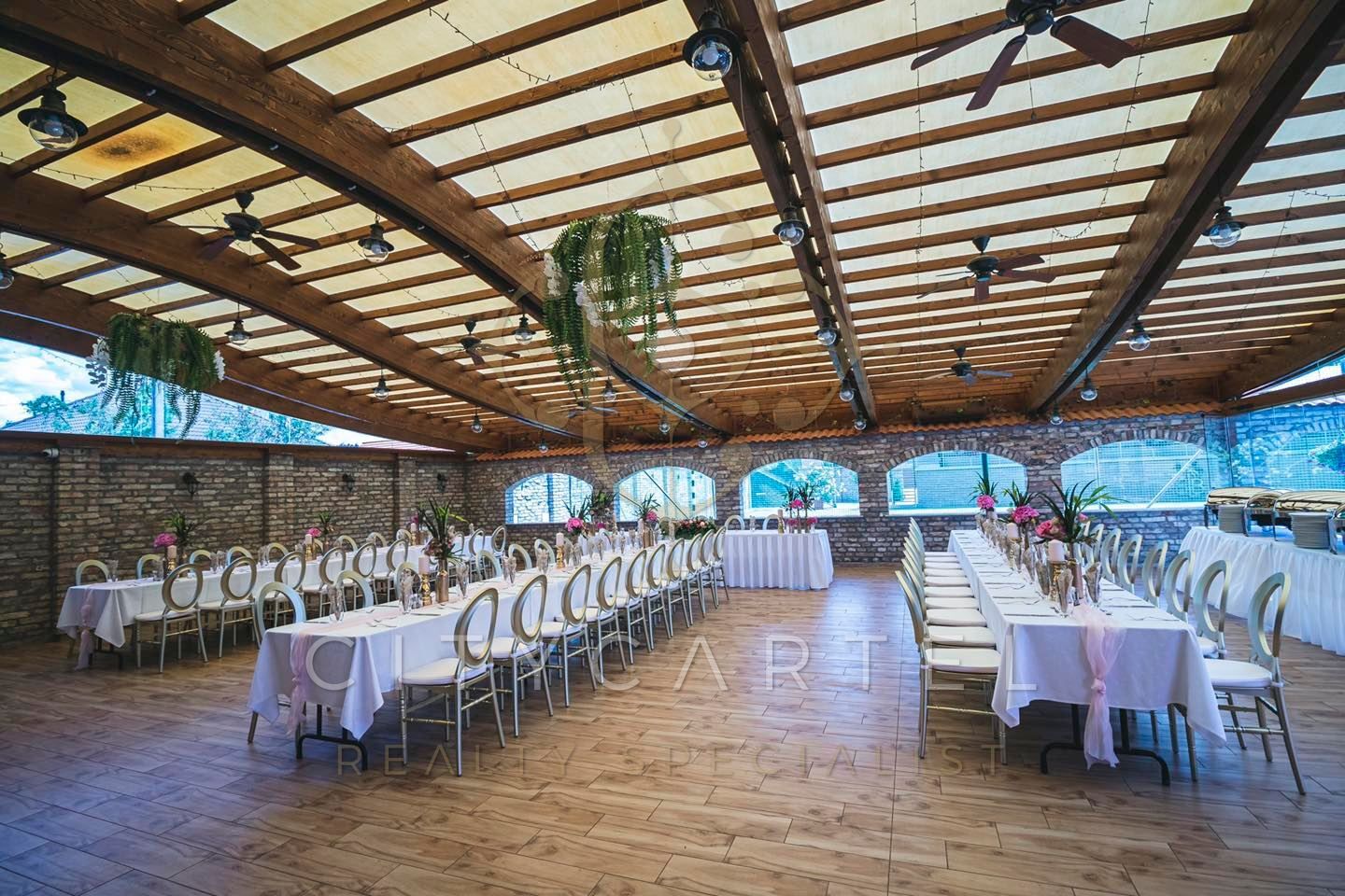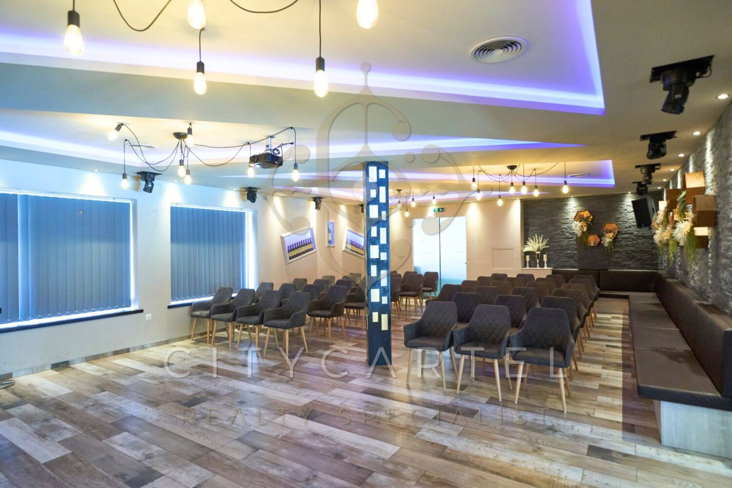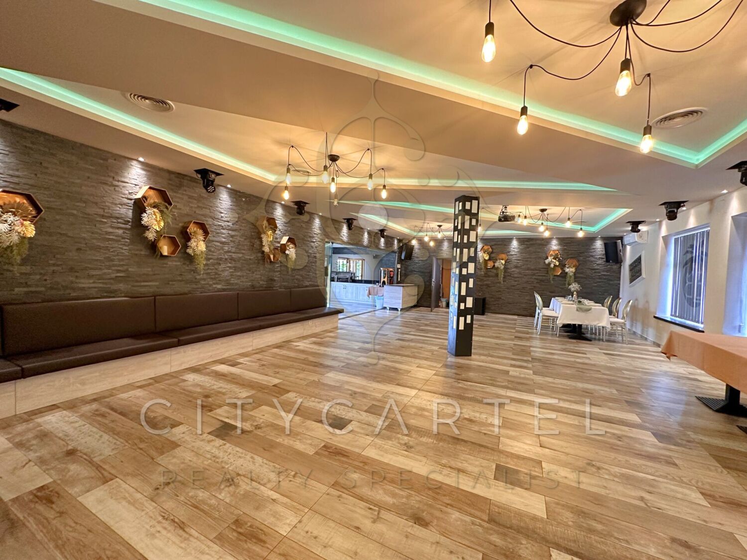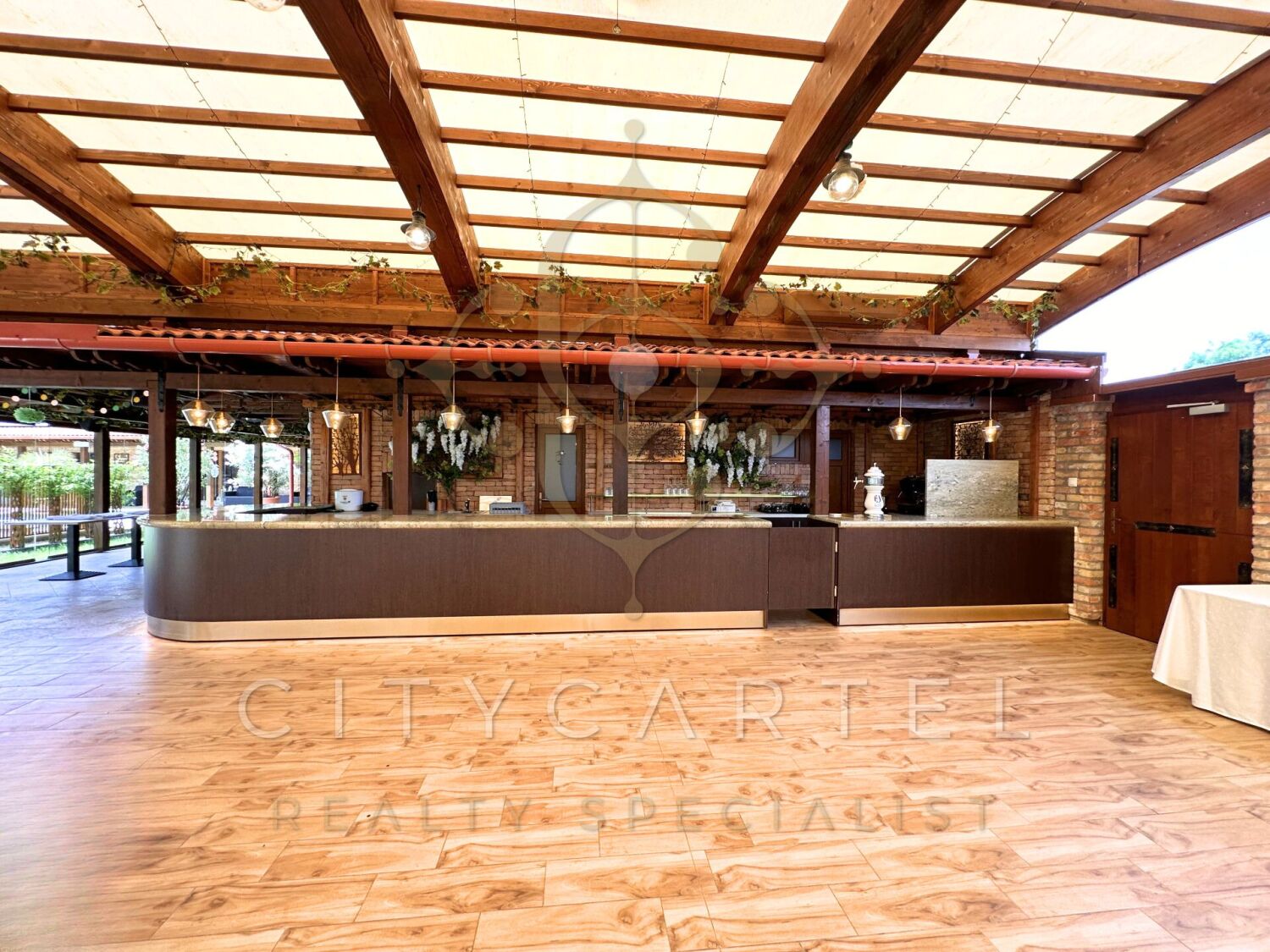 The restaurant and event center located in the street-front corner building has a total area of 501 square meters (net 454 square meters), which includes the 132 square meter covered glass restaurant/event room, a 118 square meter event hall, a 67 square meter bar, the wellness area, sauna, steam cabin, kitchen, office and service rooms, warehouse, restrooms.