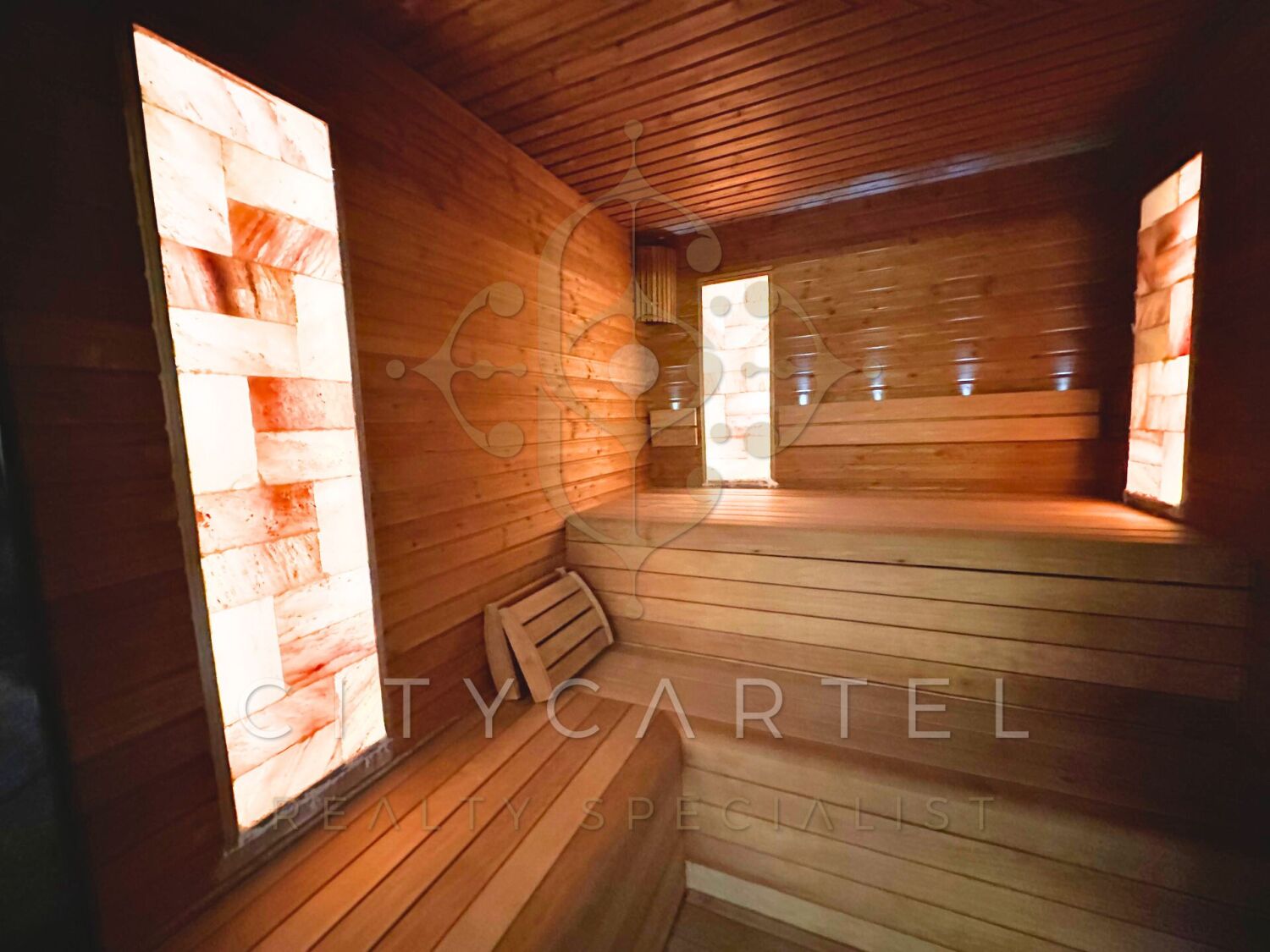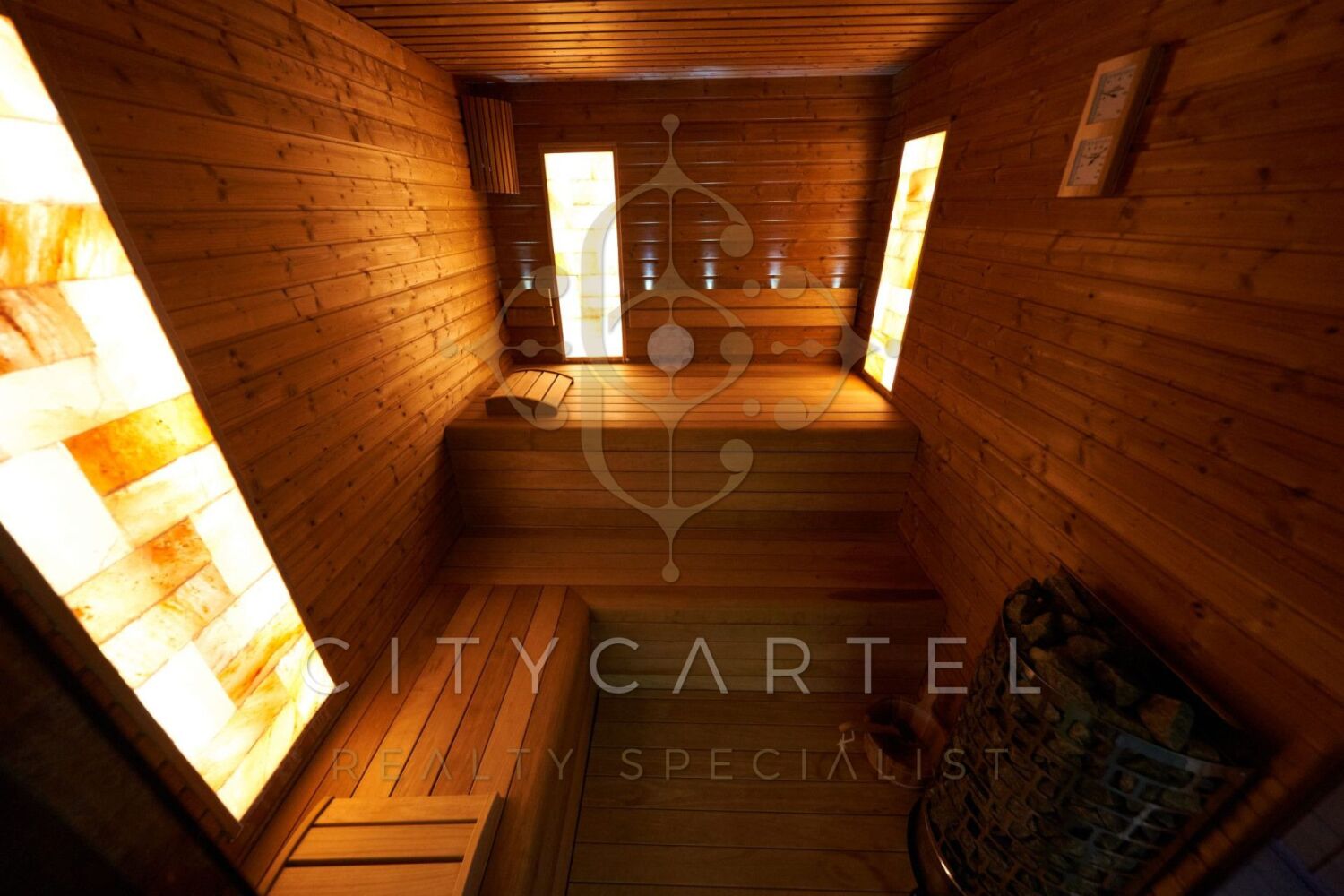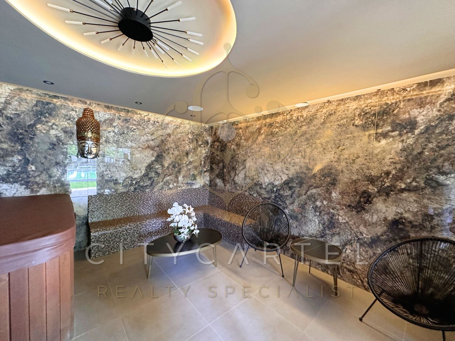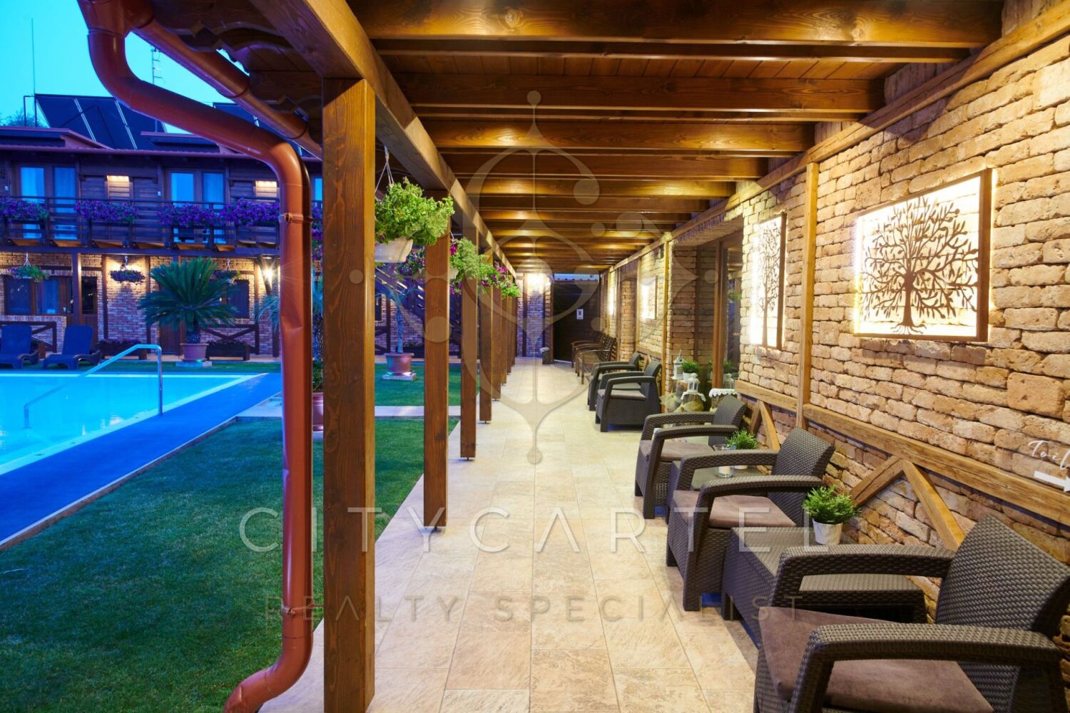 The restaurant and event center located in the street-front corner building has a total area of 501 square meters (net 454 square meters), which includes the 132 square meter covered glass restaurant/event room, a 118 square meter event hall, a 67 square meter bar, the wellness area, sauna, steam cabin, kitchen, office and service rooms, warehouse, restrooms.