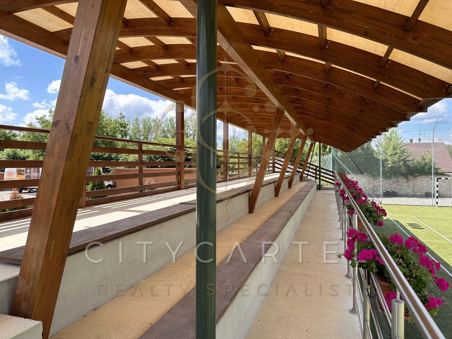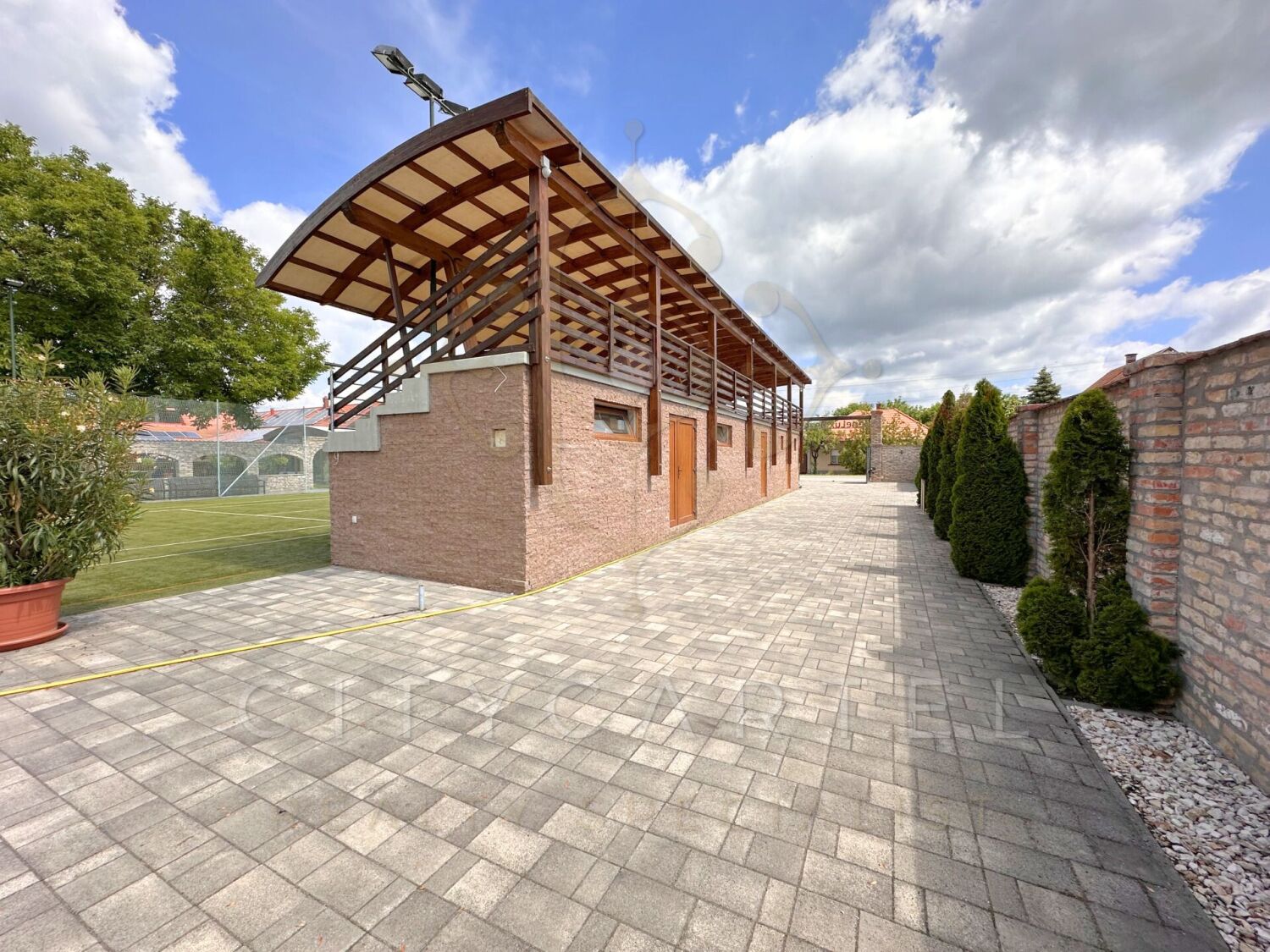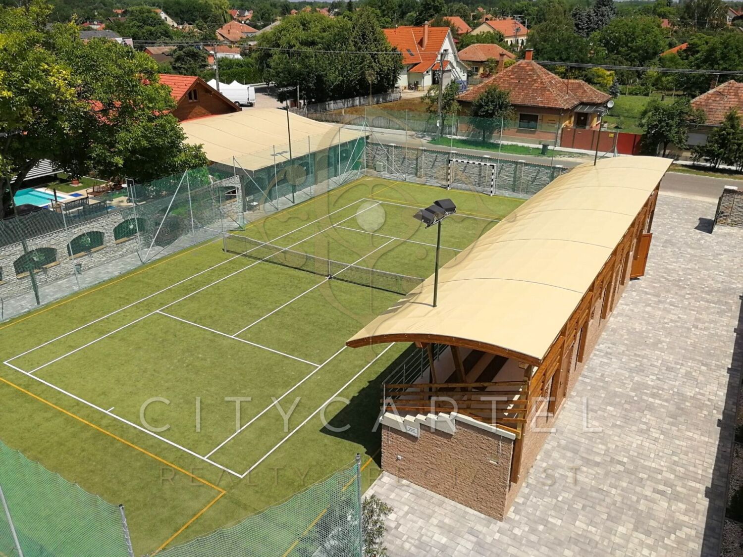 The complex can be divided into four main units: the restaurant-bar-wellness event hall located in the corner building built in 2016 at the intersection, directly on the street front, next to the inner plot boundary, the pool-facing building built in 2016 and then expanded in 2022 , cozy, 2-story, 9-room hotel, shared by the two buildings approx. 100 m² outdoor pool and jacuzzi with a grill terrace serving the above, as well as a sports court and stands suitable for tennis and football pitches accessible from the separate street entrance.