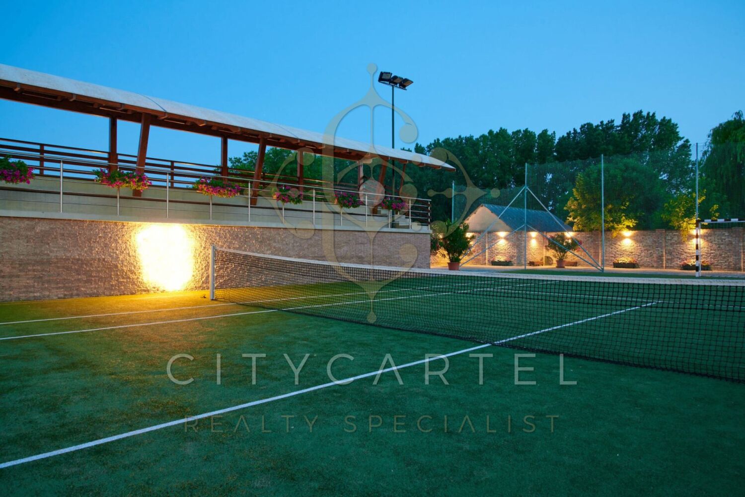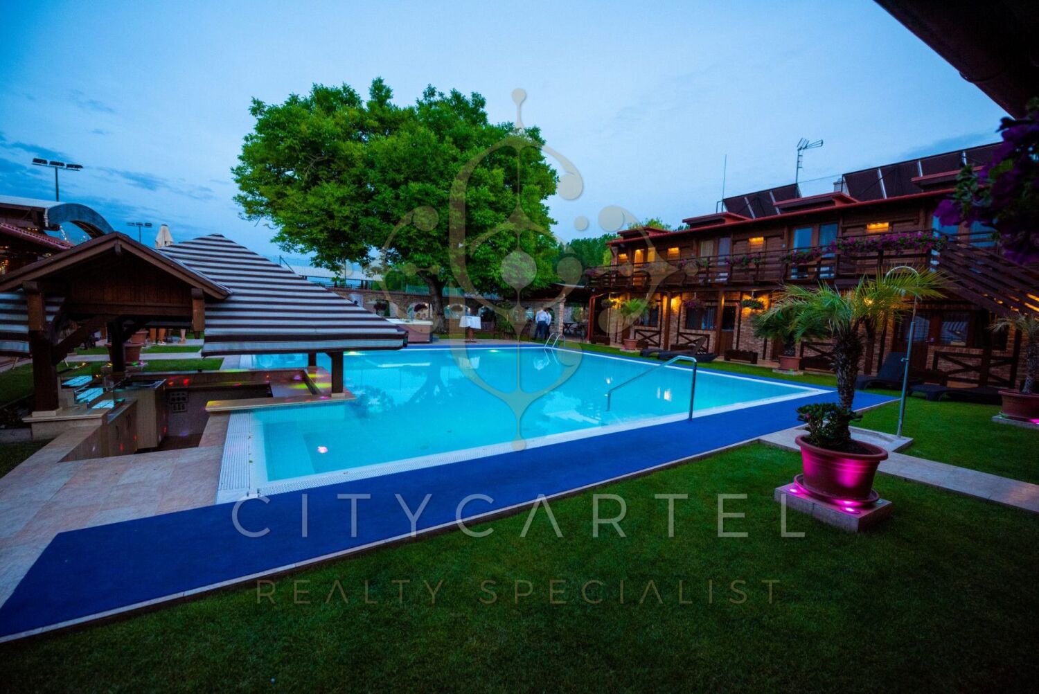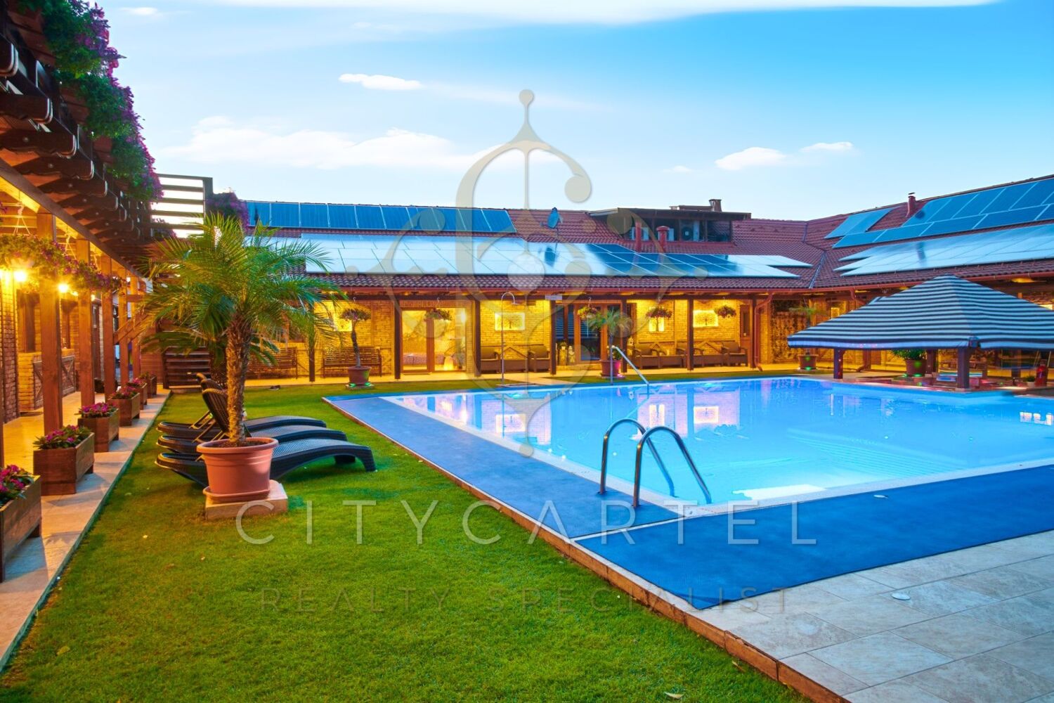 - on a plot of 4175 square meters, a special building complex of 755 square meters with a Balinese feel, with a 9-room guesthouse with wellness and swimming pool, a conference room, a restaurant, a bar, a garden grill, a sports court, and a separate parking yard -