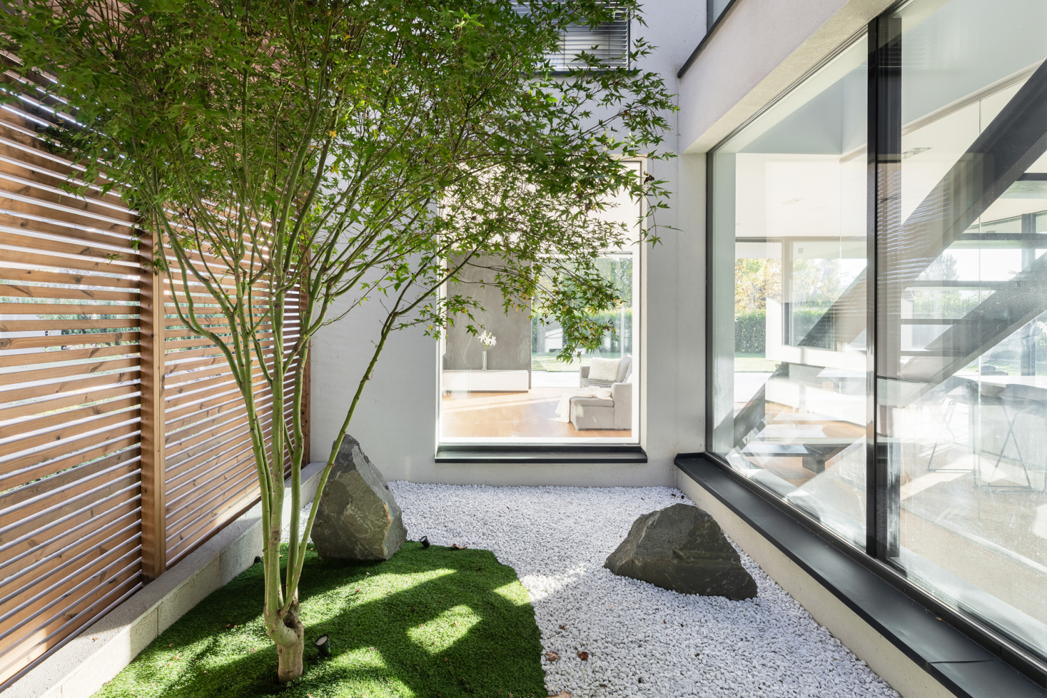 A 108nm alapterületű fsz-en amerikai konyha - nappali + 1 háló privát fürdővel, külön háztartási helyiség, valamint 15nm-es belső kert és 70nm terasz található