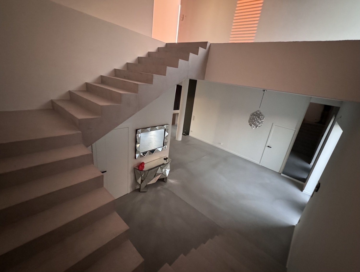 Látszóbeton felületek, alsó szinten mindenhol glettbeton padló, garázsokban hidegburkolat.