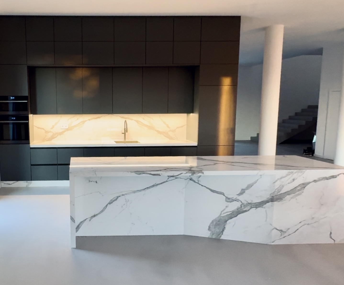 Teljesen felszerelt konyha, whirpool 6. érzèk gépekkel, fehér márvány konyhapult és konyhasziget, 325cm széles, nagy lappal burkolt, Gessi épített mosogatóval.